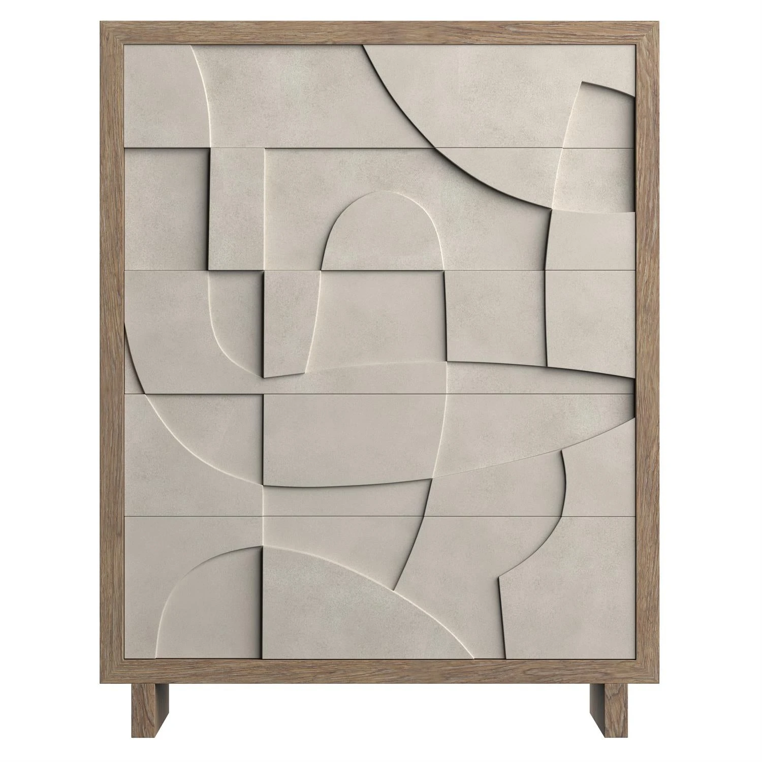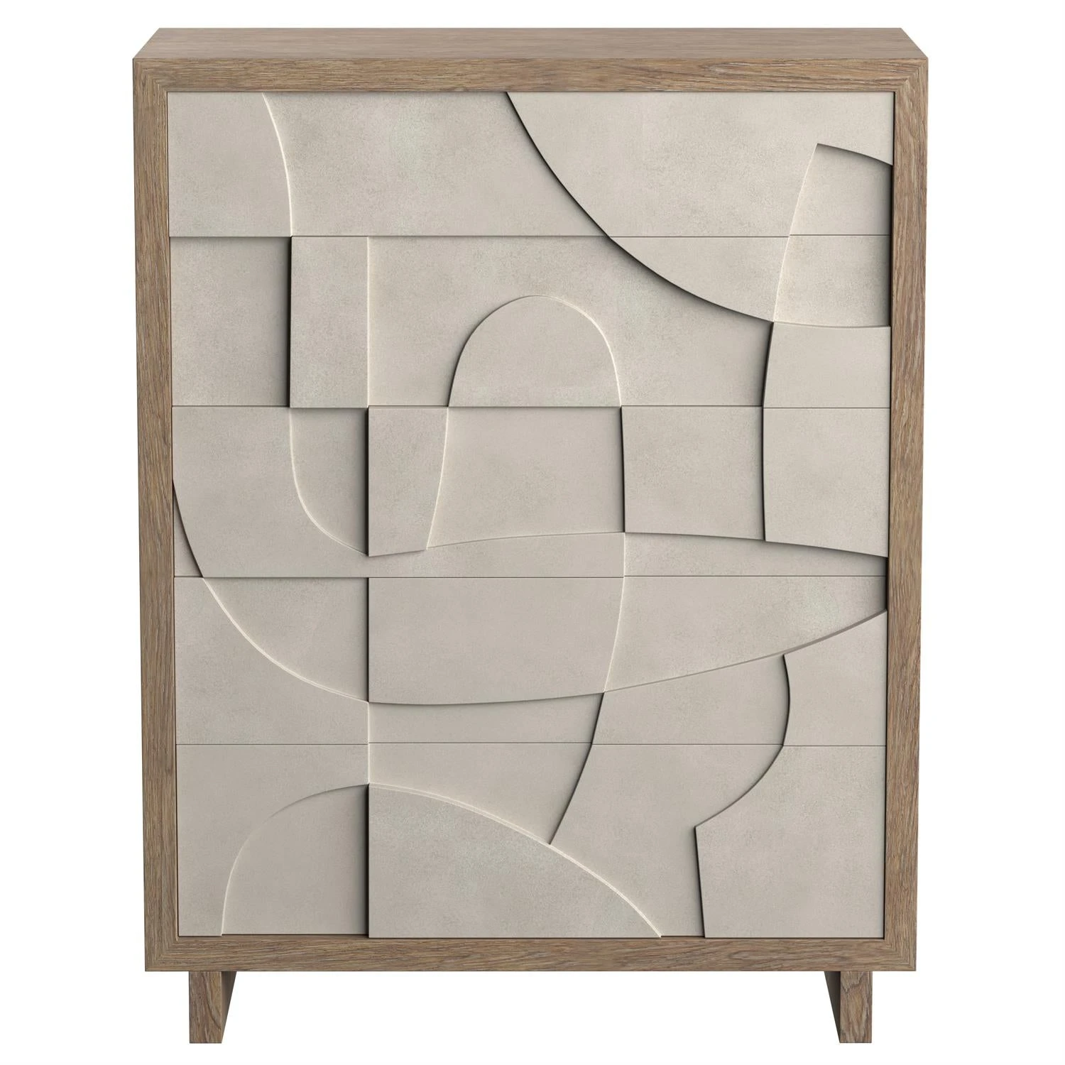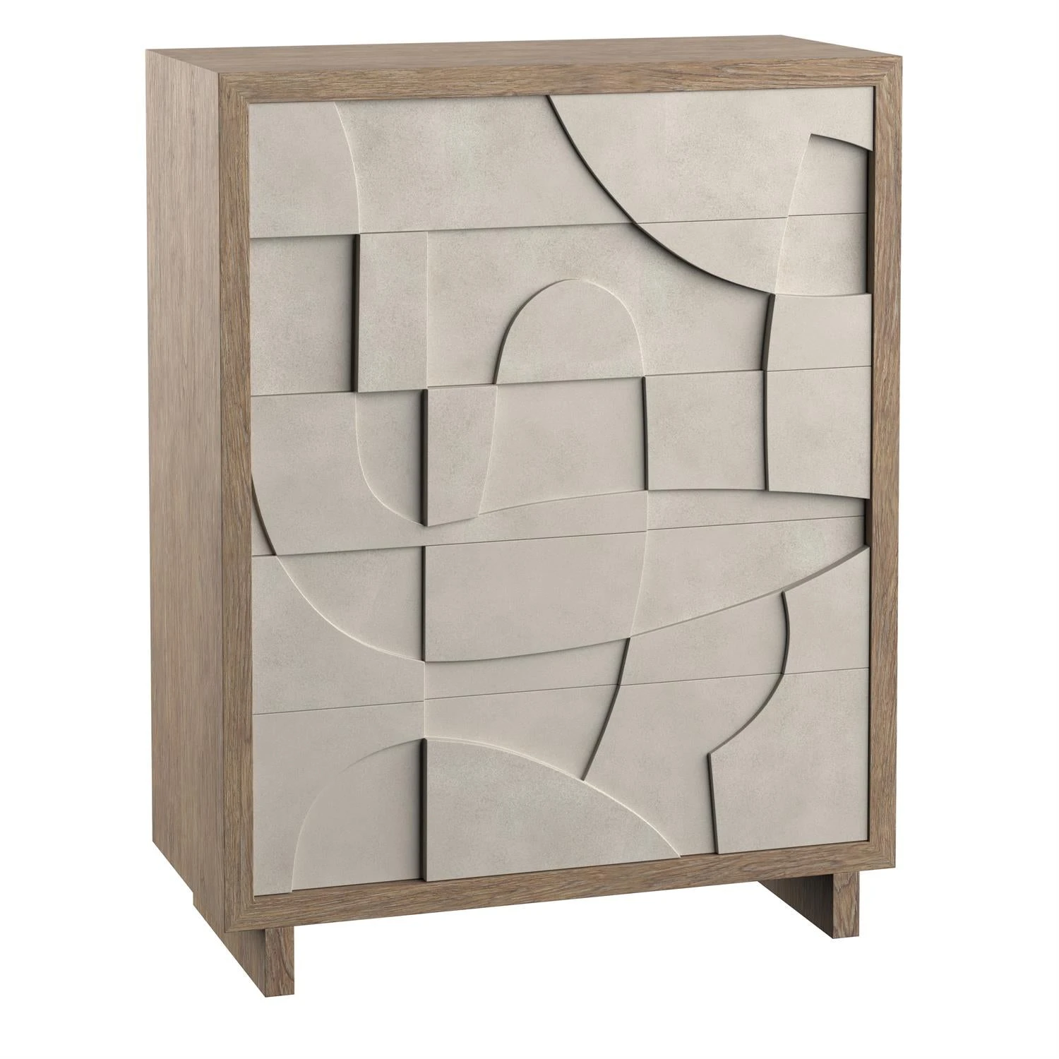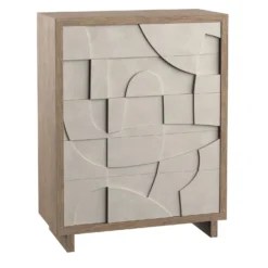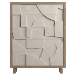 Texture and dimension carve a signature look onto the Amara tall drawer chest. Five faux concrete push-to-open drawers are showcased in Bedrock finish. The top and leg panels feature the warm Playa finish that provides the perfect contrast for a refined and rustic design.