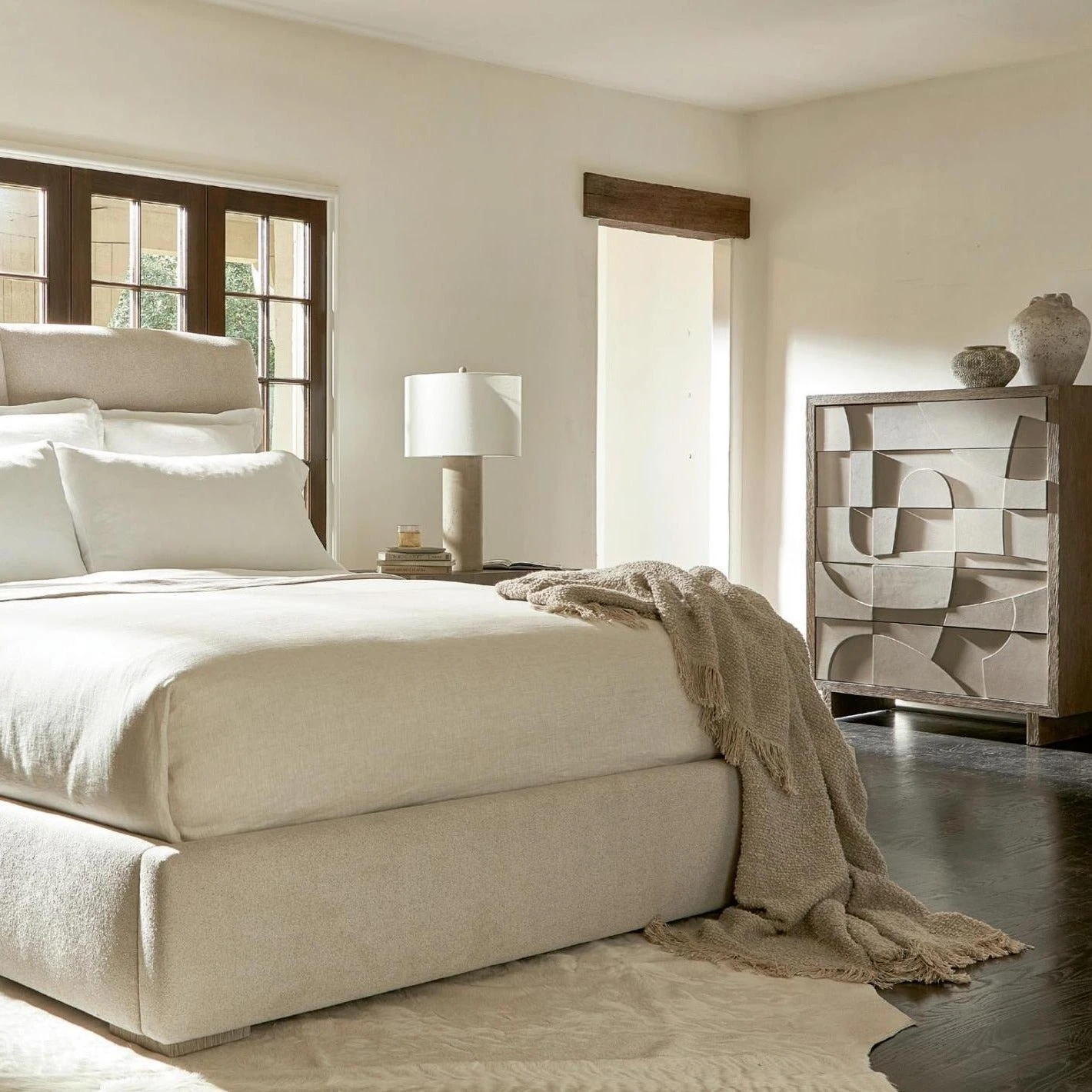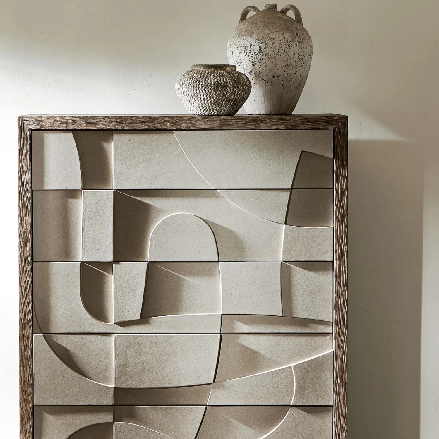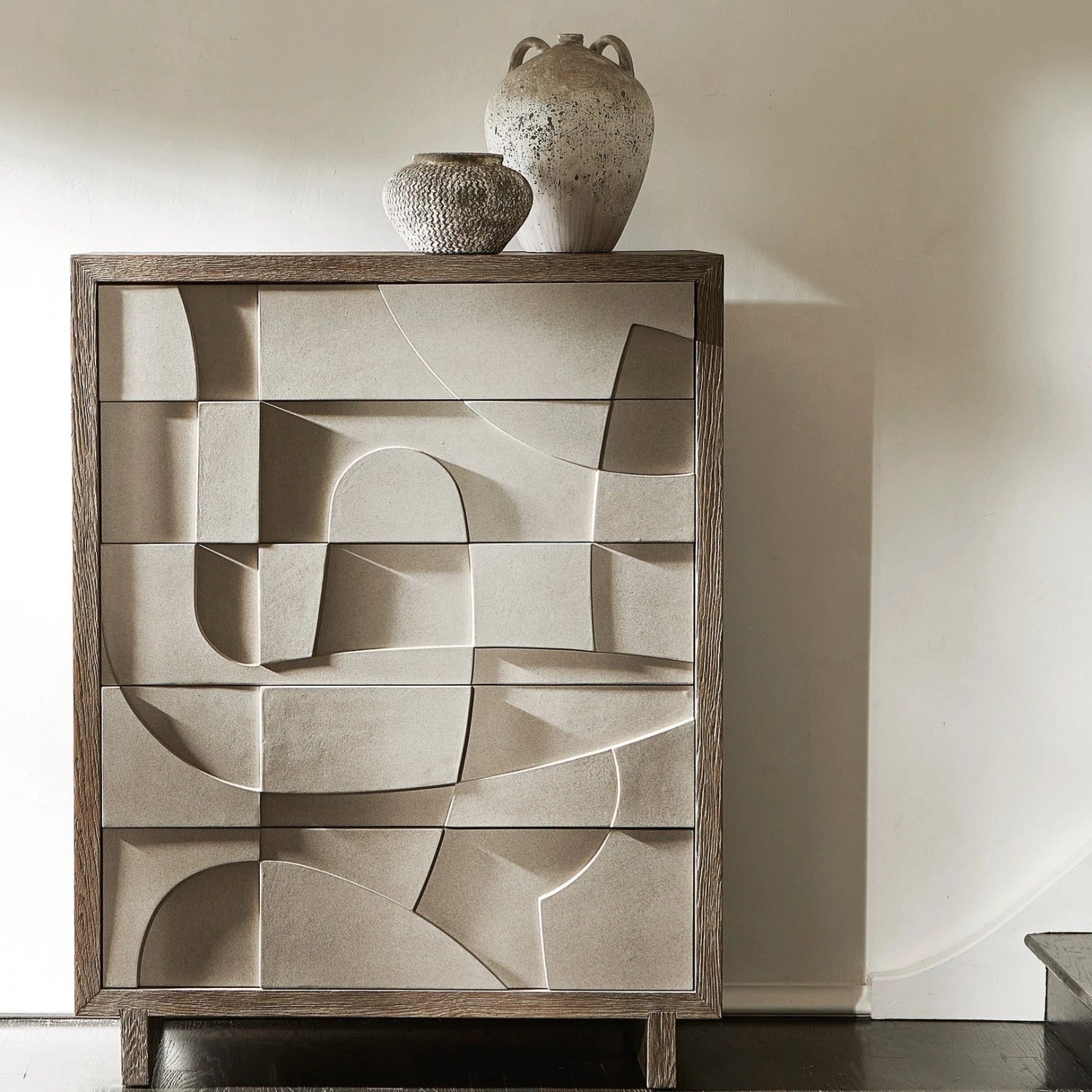 Texture and dimension carve a signature look onto the Amara tall drawer chest. Five faux concrete push-to-open drawers are showcased in Bedrock finish. The top and leg panels feature the warm Playa finish that provides the perfect contrast for a refined and rustic design.