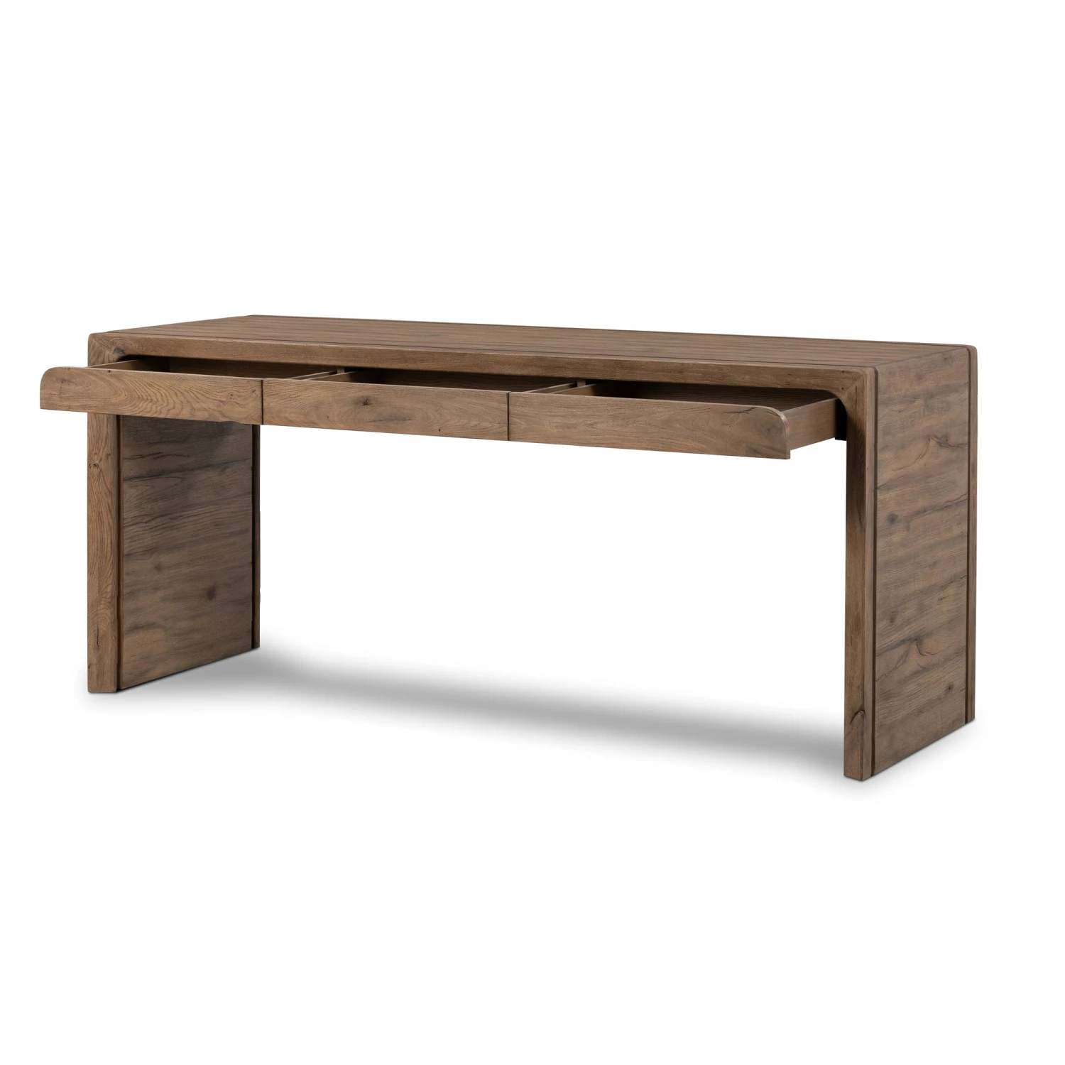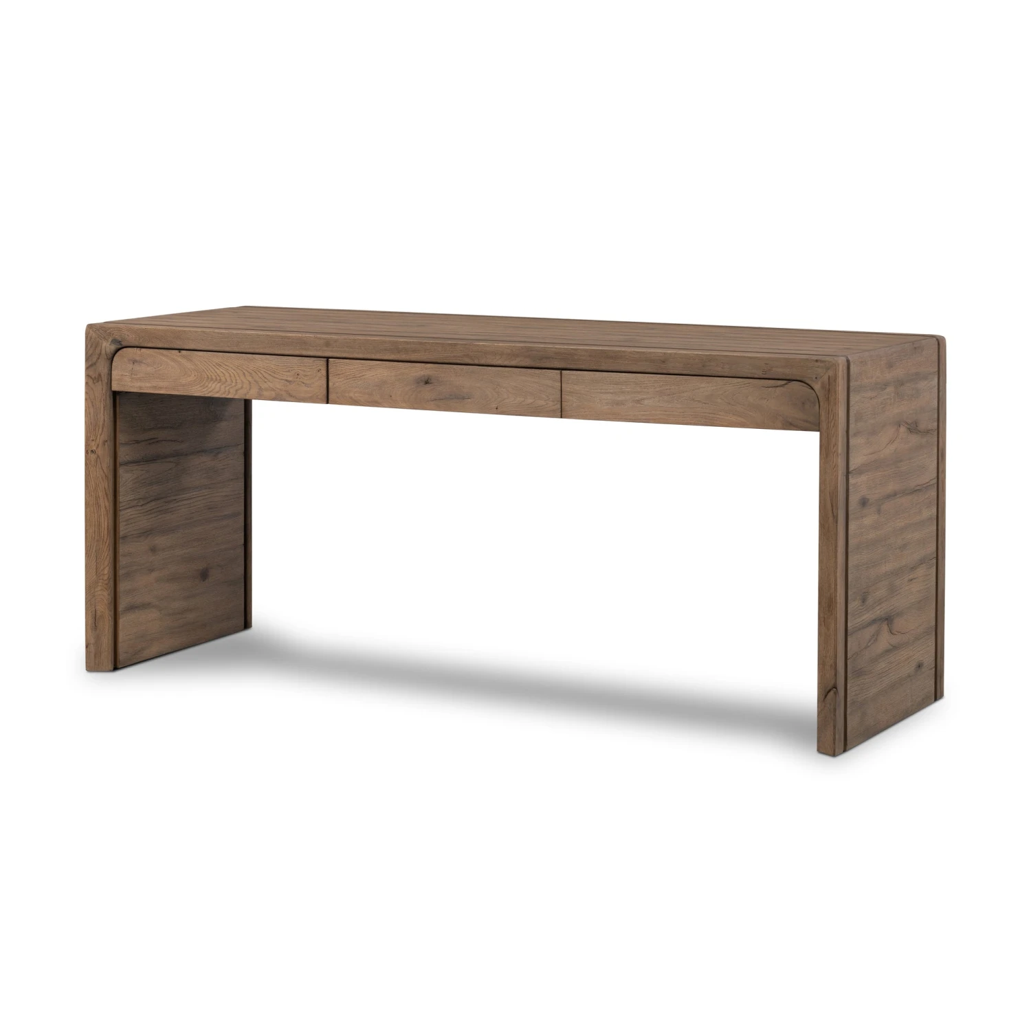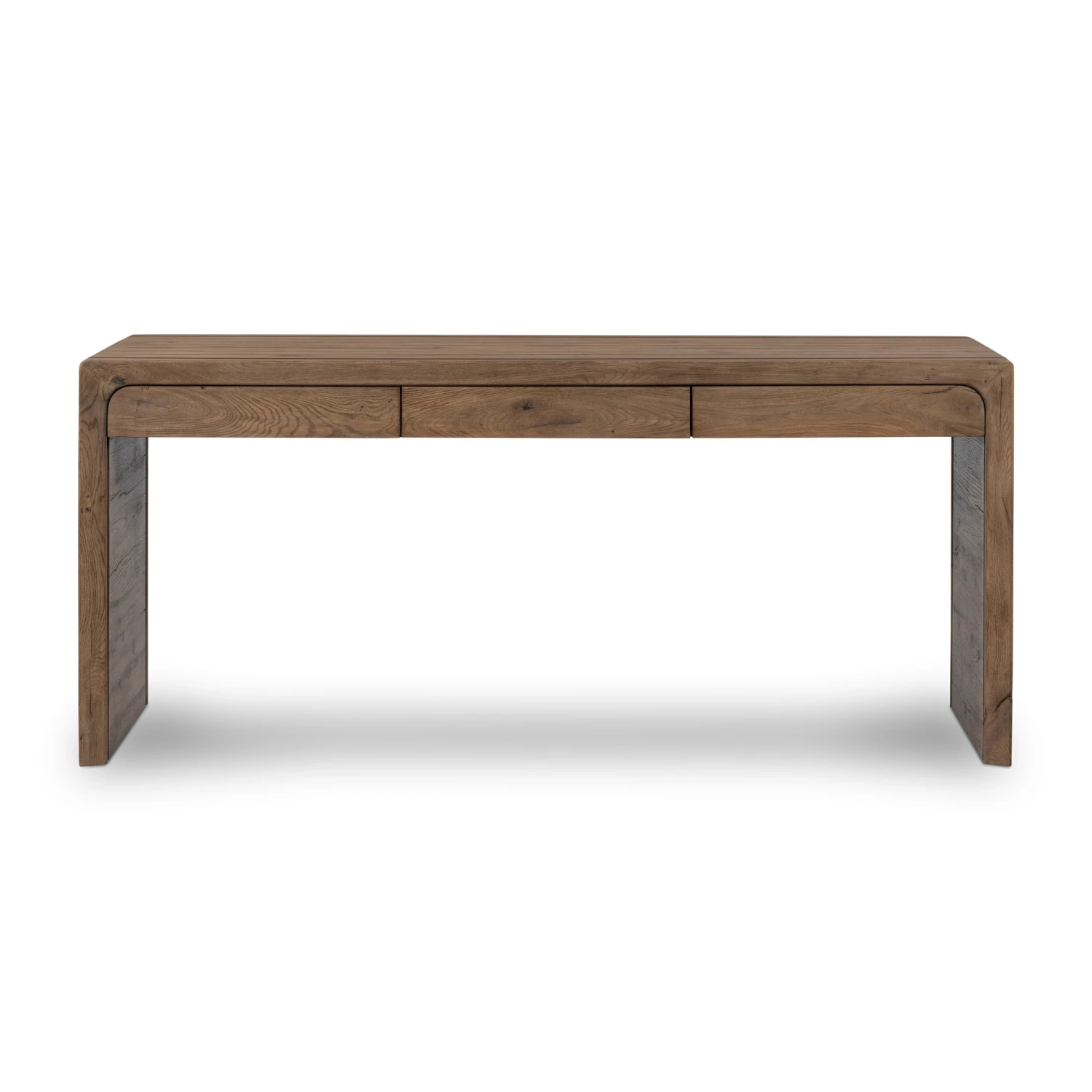 Made from solid reclaimed oak finished in a rustic grey, this slim-profile desk shapes subtly curved corners, bringing a handcrafted look to a minimalist form. Designed in partnership with longtime Four Hands collaborator Thomas Bina and Brazilian designer Ronald Sasson.