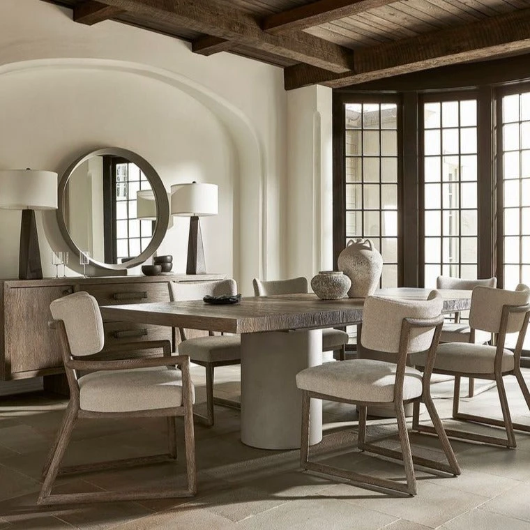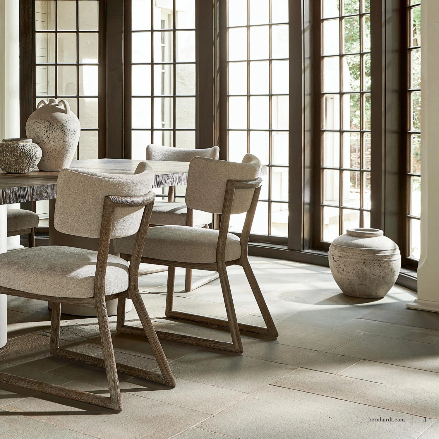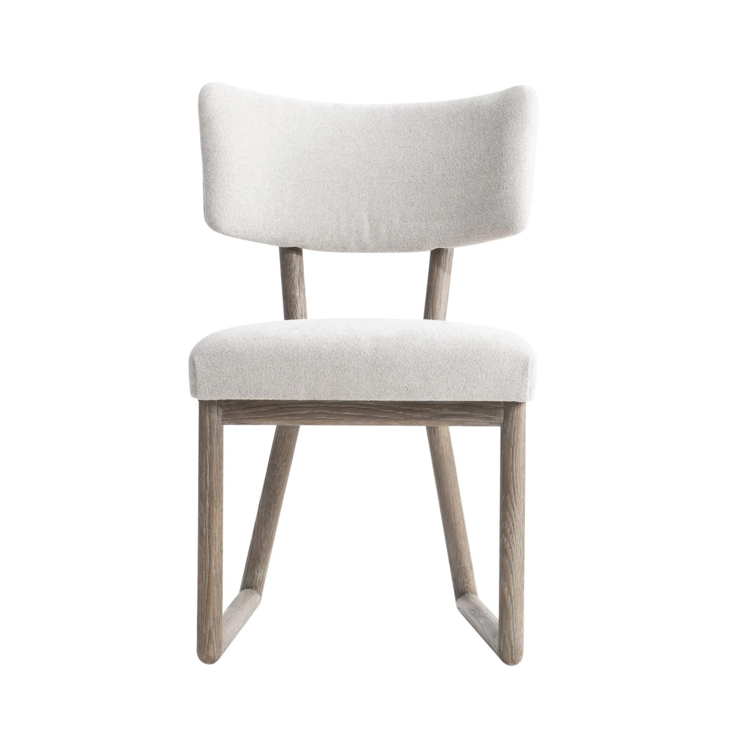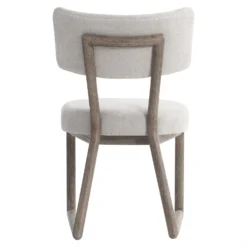 The exposed wood frame on the Aurora side chair bends and turns to form a unique shape. The legs move up to support an upholstered floating back and extend back to the floor. Finished in Playa, the chair has a refined, pared-down aesthetic.