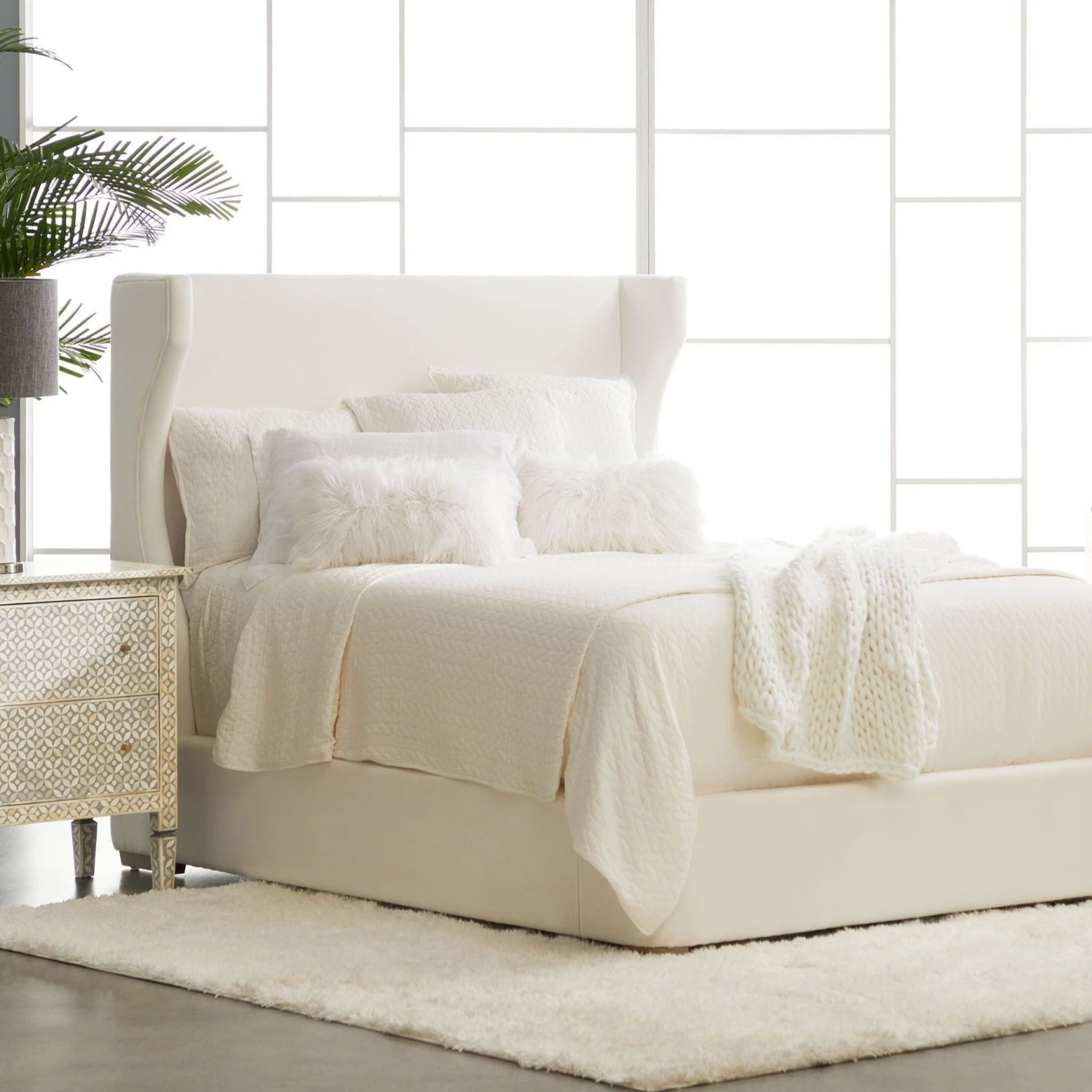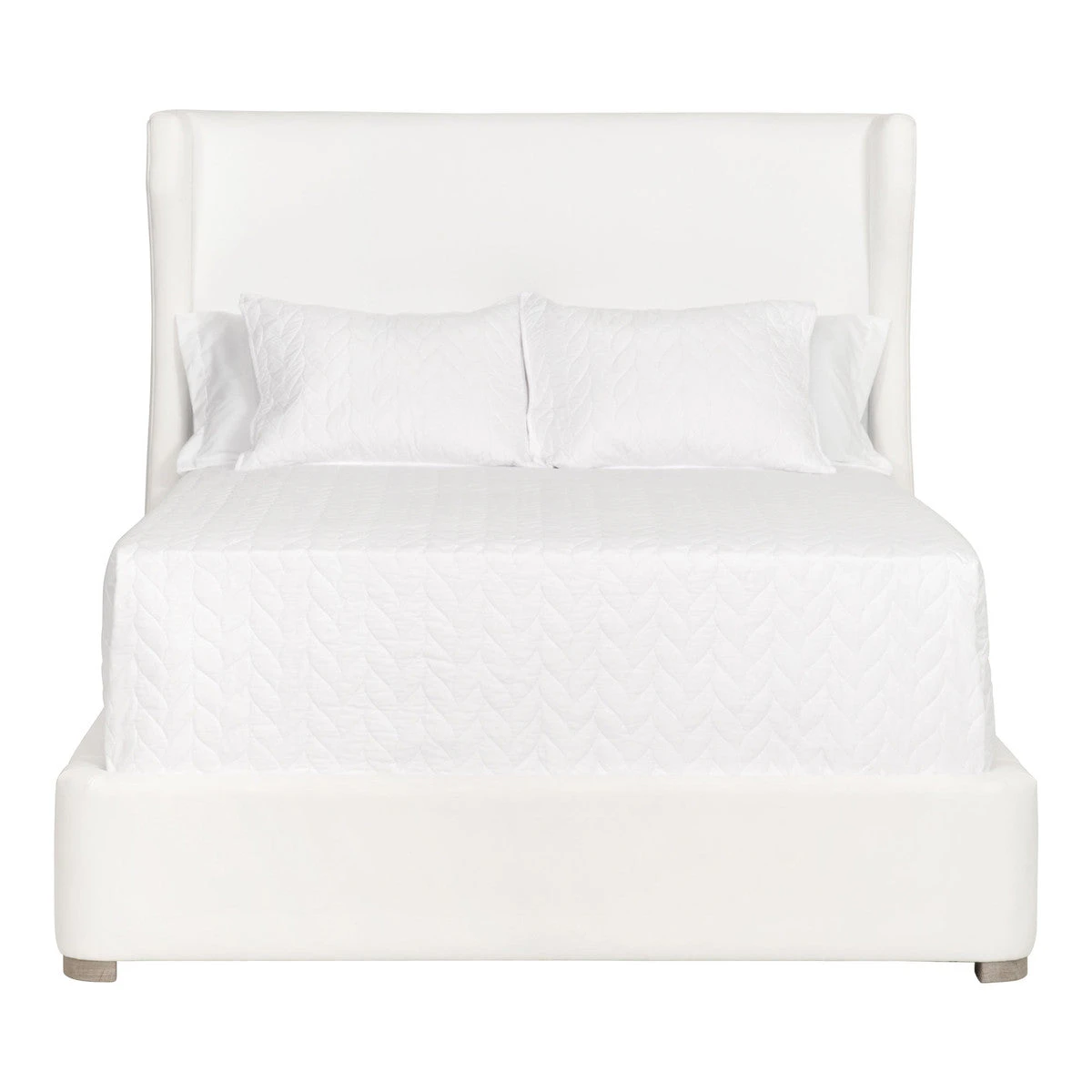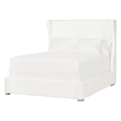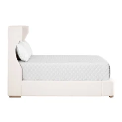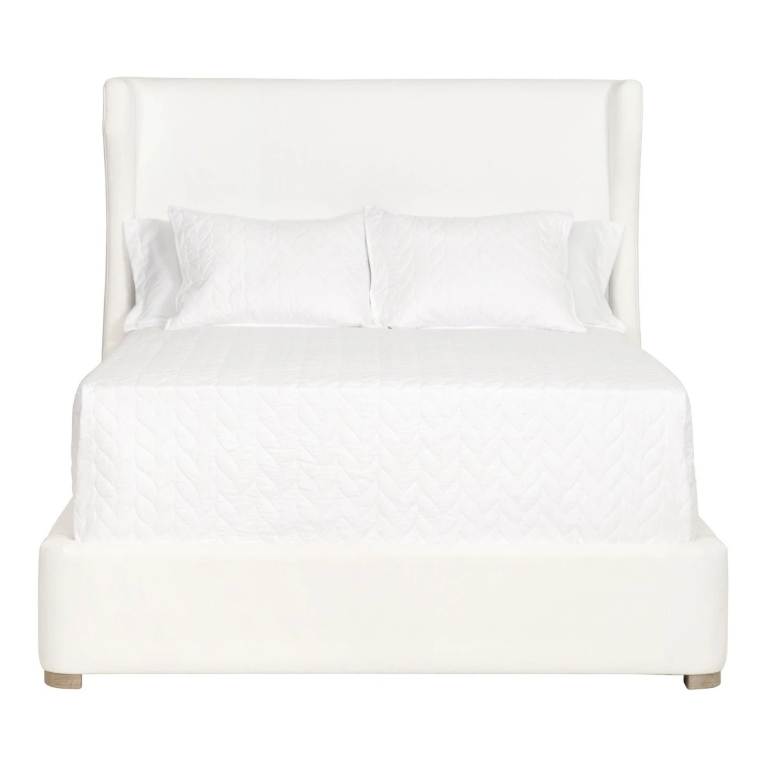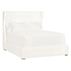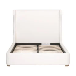 This upholstered standard king bed frame will add sophistication and class to any bedroom. The Livesmart Peyton Pearl fabric and oak feet create a neutral palette that will work well with many color combinations. The frame features curved wingback sides, an integrated metal slat system and stain resistant fabric. Additionally, the edges are piped to add dimension to the frame. Designed for dependability and durability, this transitional style king bed frame will be a great addition to your bedroom.