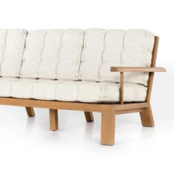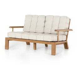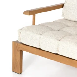 Cushy comfort, made for the outdoors. Wide framing of FSC®-certified teak features paddle legs and a slatted back, with dramatically tufted sand-colored cushioning for a relaxed sit. Cover or store indoors during inclement weather and when not in use.