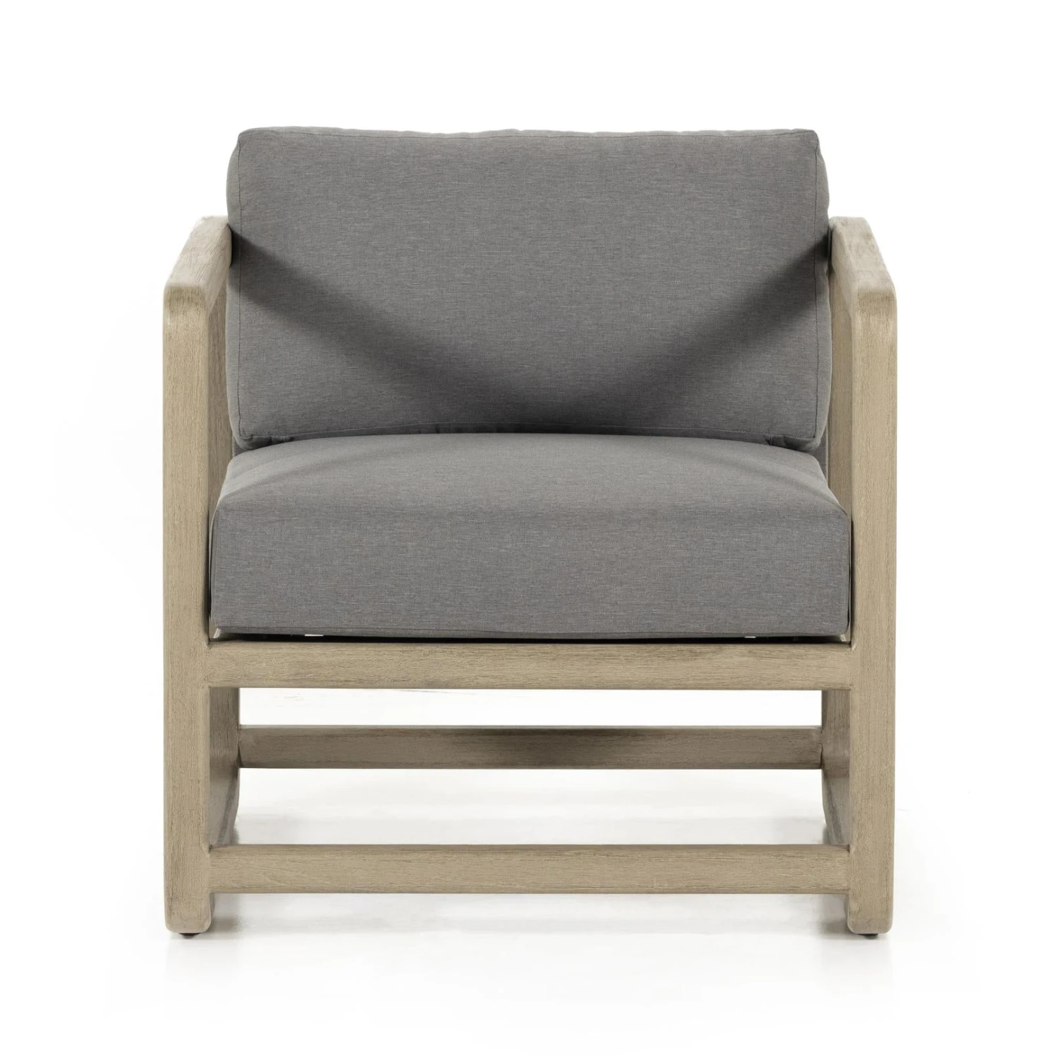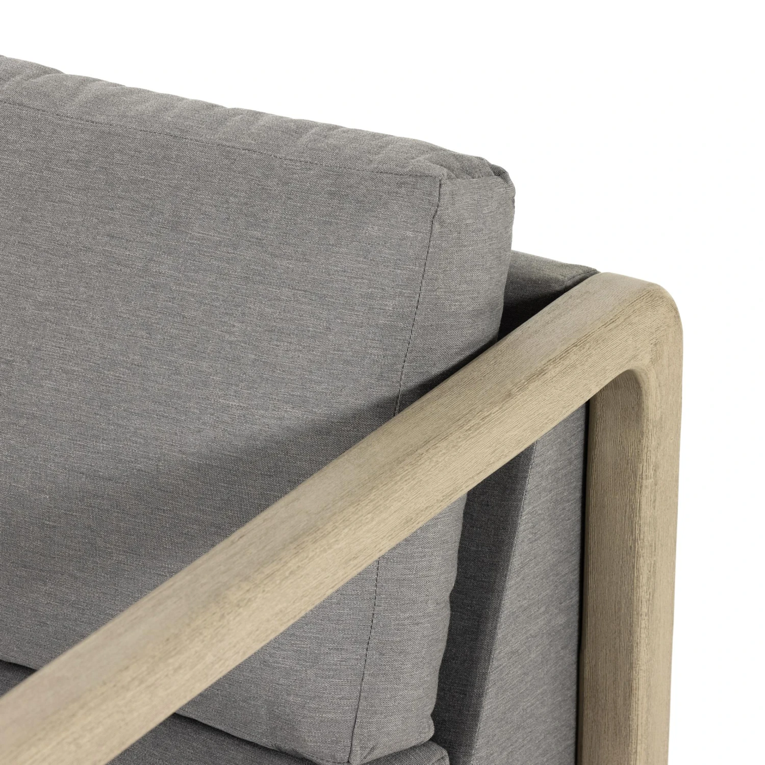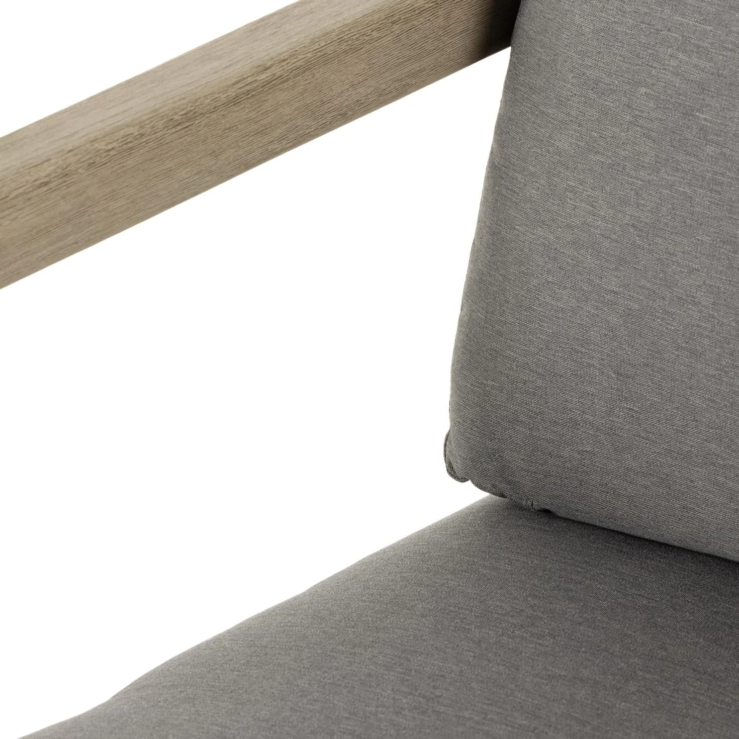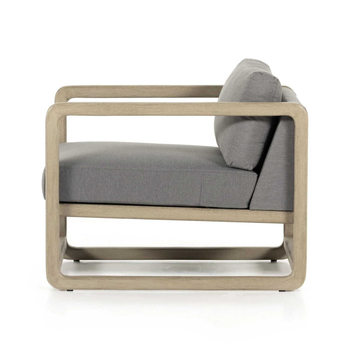 Weathered grey FSC®-certified teak forms rounded corners for a novel take on open, angular framing. Upholstered in an inviting charcoal, this outdoor-friendly seating style layers in with total ease. Cover or store indoors during inclement weather.