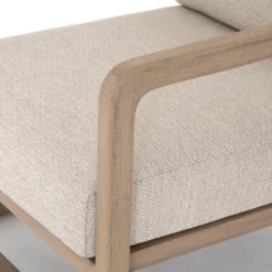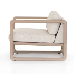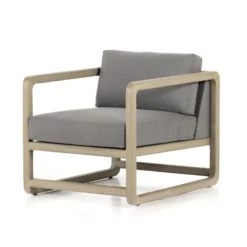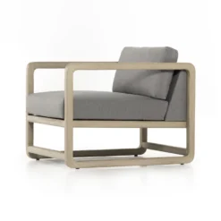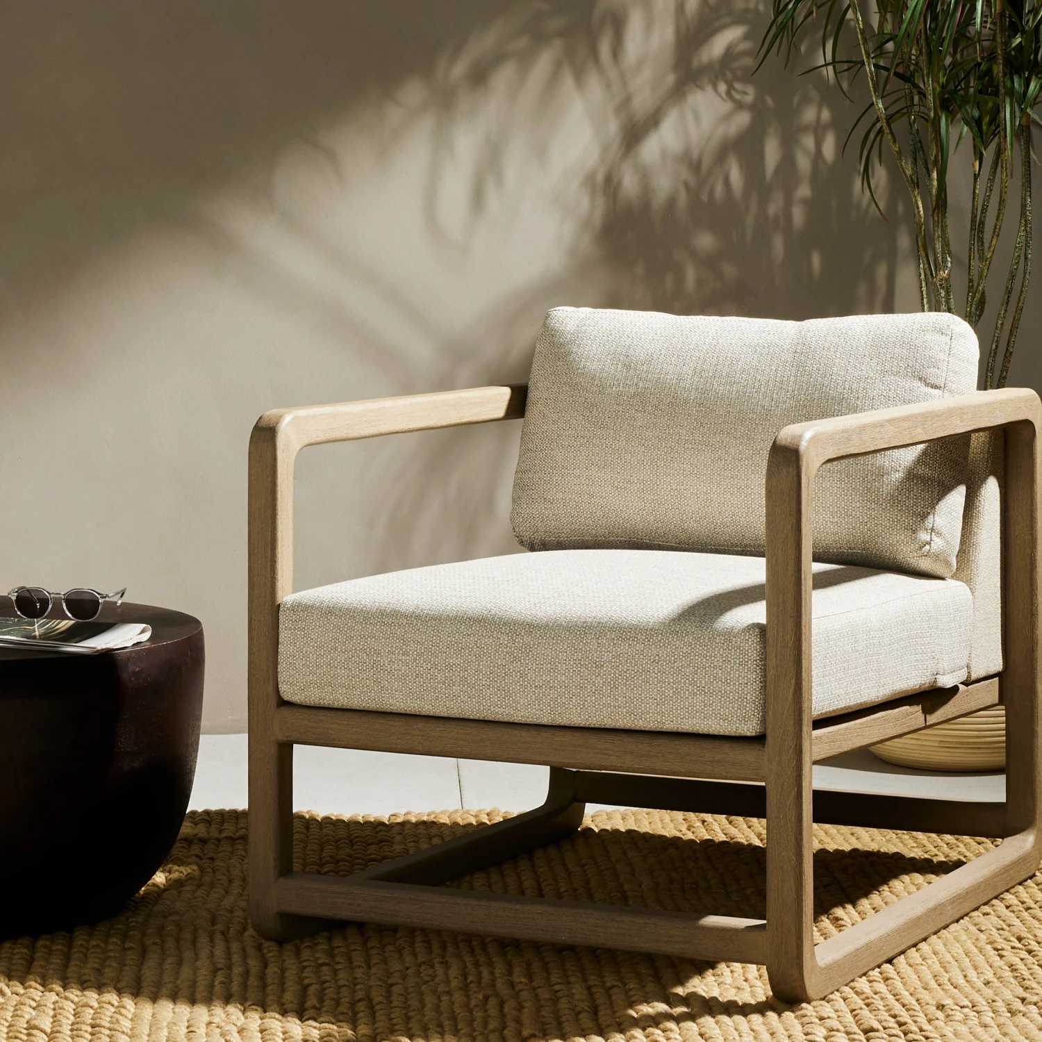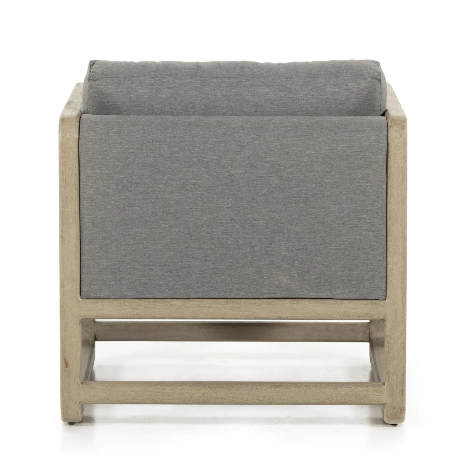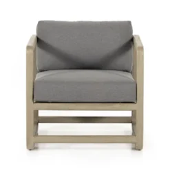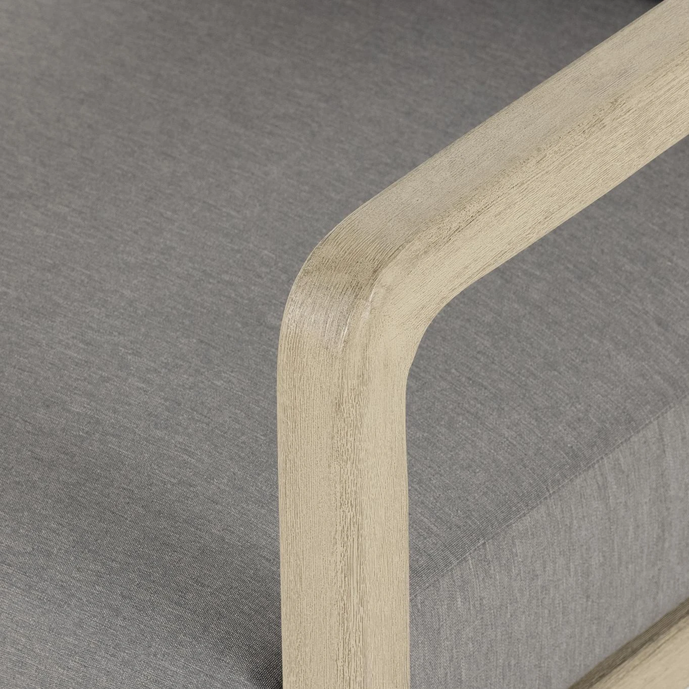 Weathered grey FSC®-certified teak forms rounded corners for a novel take on open, angular framing. Upholstered in an inviting charcoal, this outdoor-friendly seating style layers in with total ease. Cover or store indoors during inclement weather.