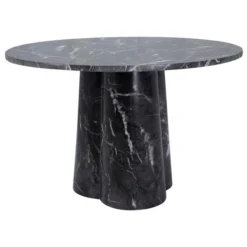 Black marble brushed with white veins creates this alluring dining table. Featuring a round shape on a sturdy pedestal base that is not only contemporary but extremely enticing. Sophisticated charm exudes from the Cleo dining table, making it perfect for serving everyday meals or hosting special occasions.