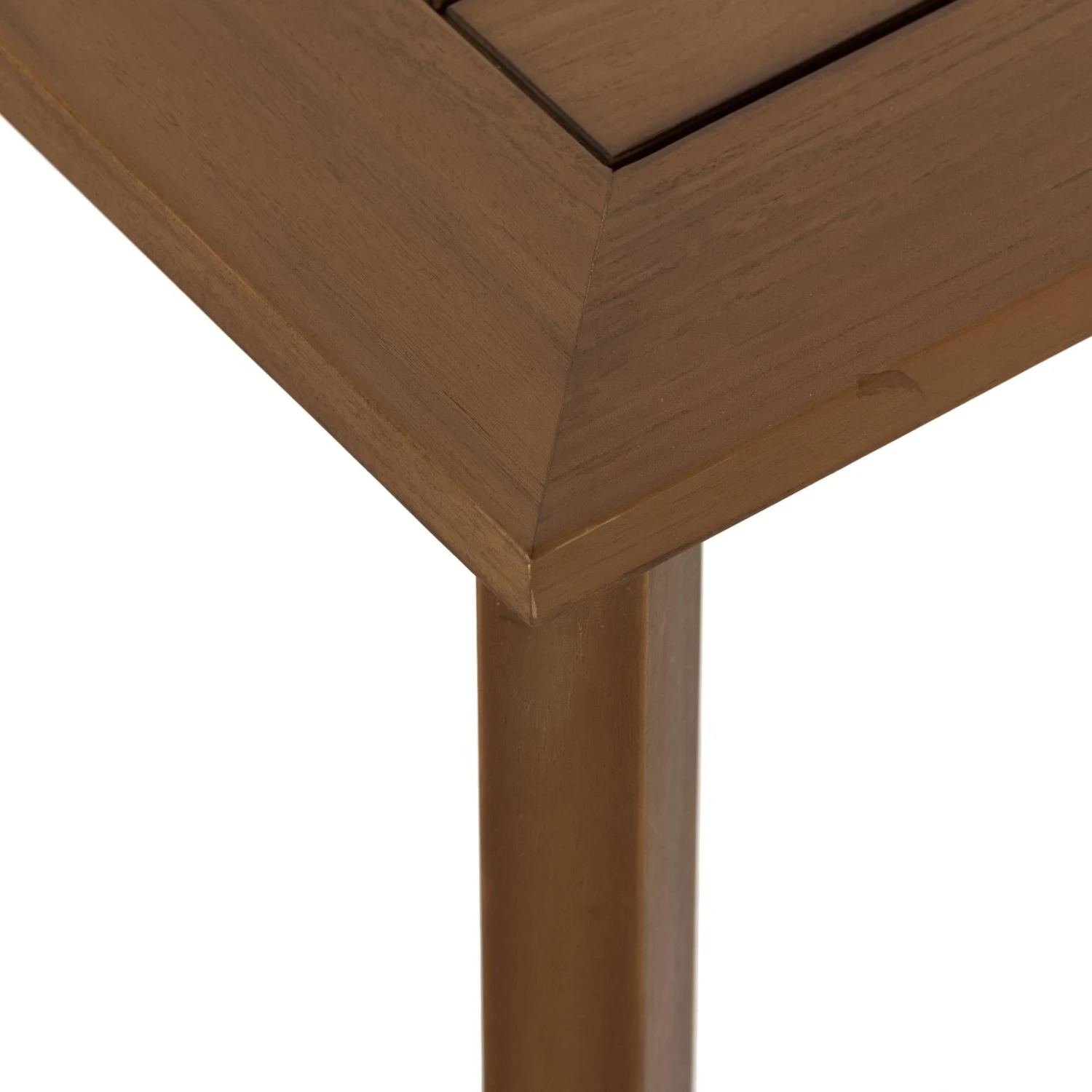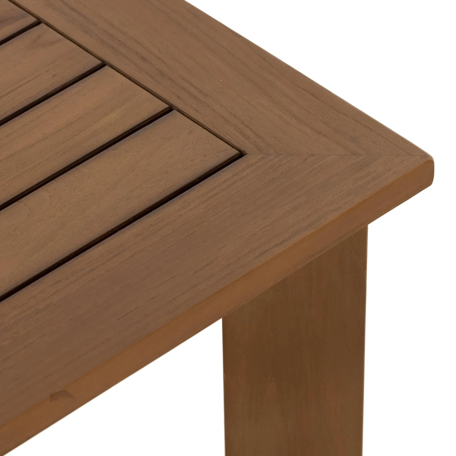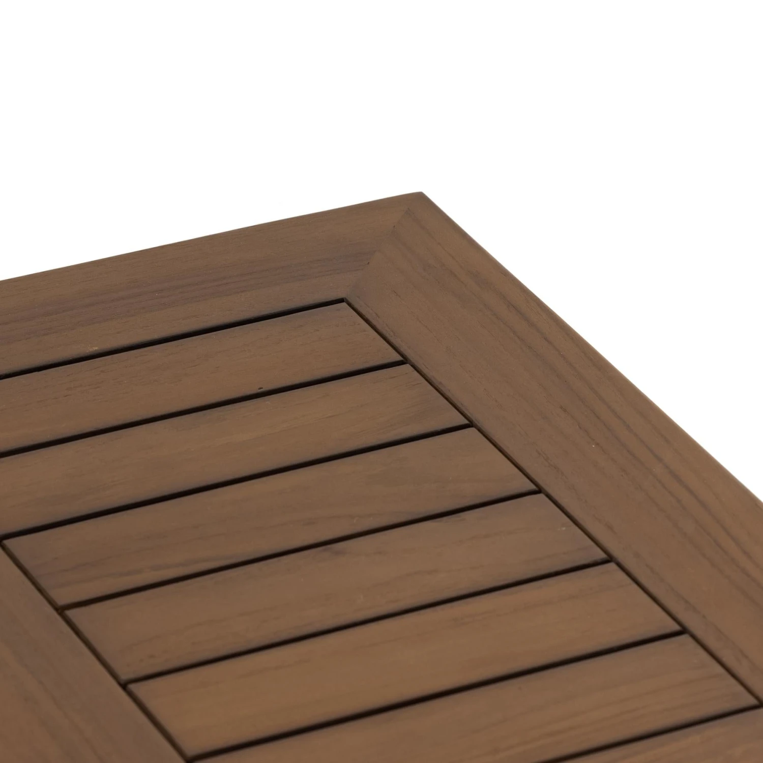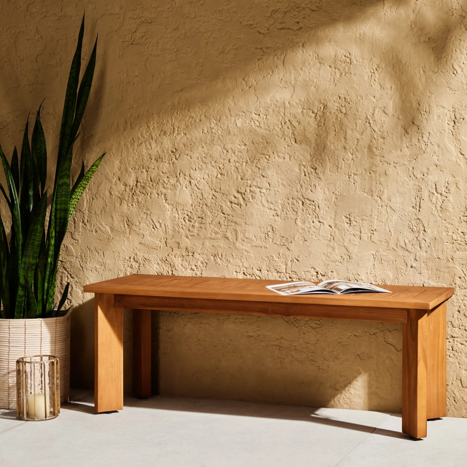 A streamlined style banks on natural beauty, crafted entirely of FSC-certified teak, with slightly splayed legs for added intrigue. Seats two comfortably. Cover or store indoors during inclement weather and when not in use.