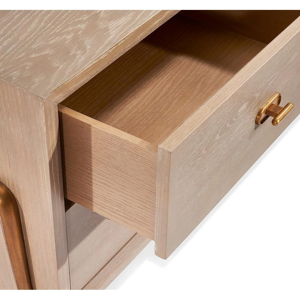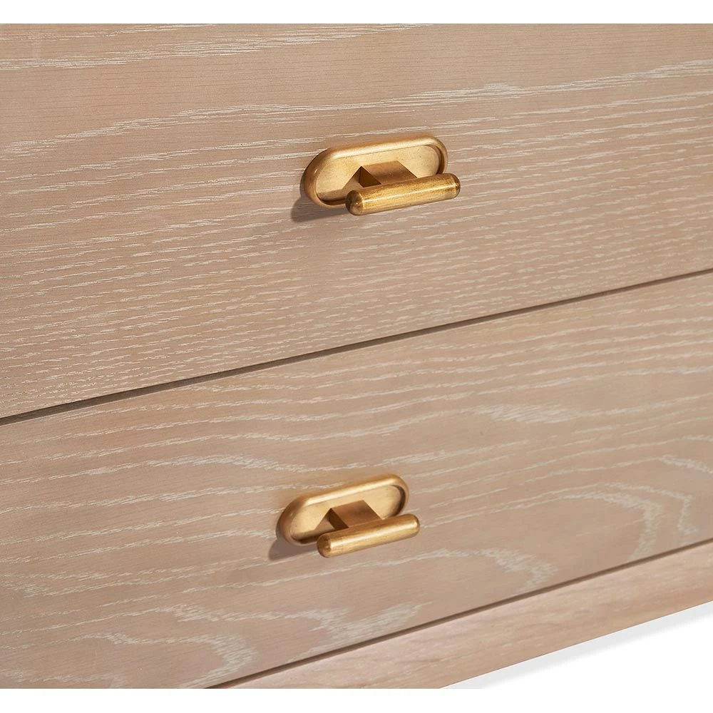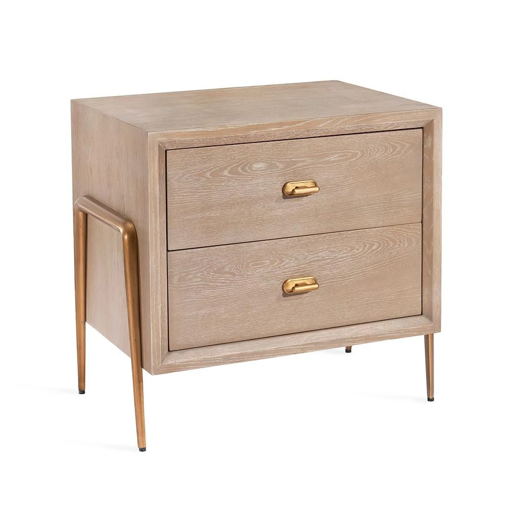 Crafted of taupe ceruse oak and boasting capsule-shaped iron hardware in an antique brass finish, the Creed Bedside Chest adds sophistication to any bedroom.