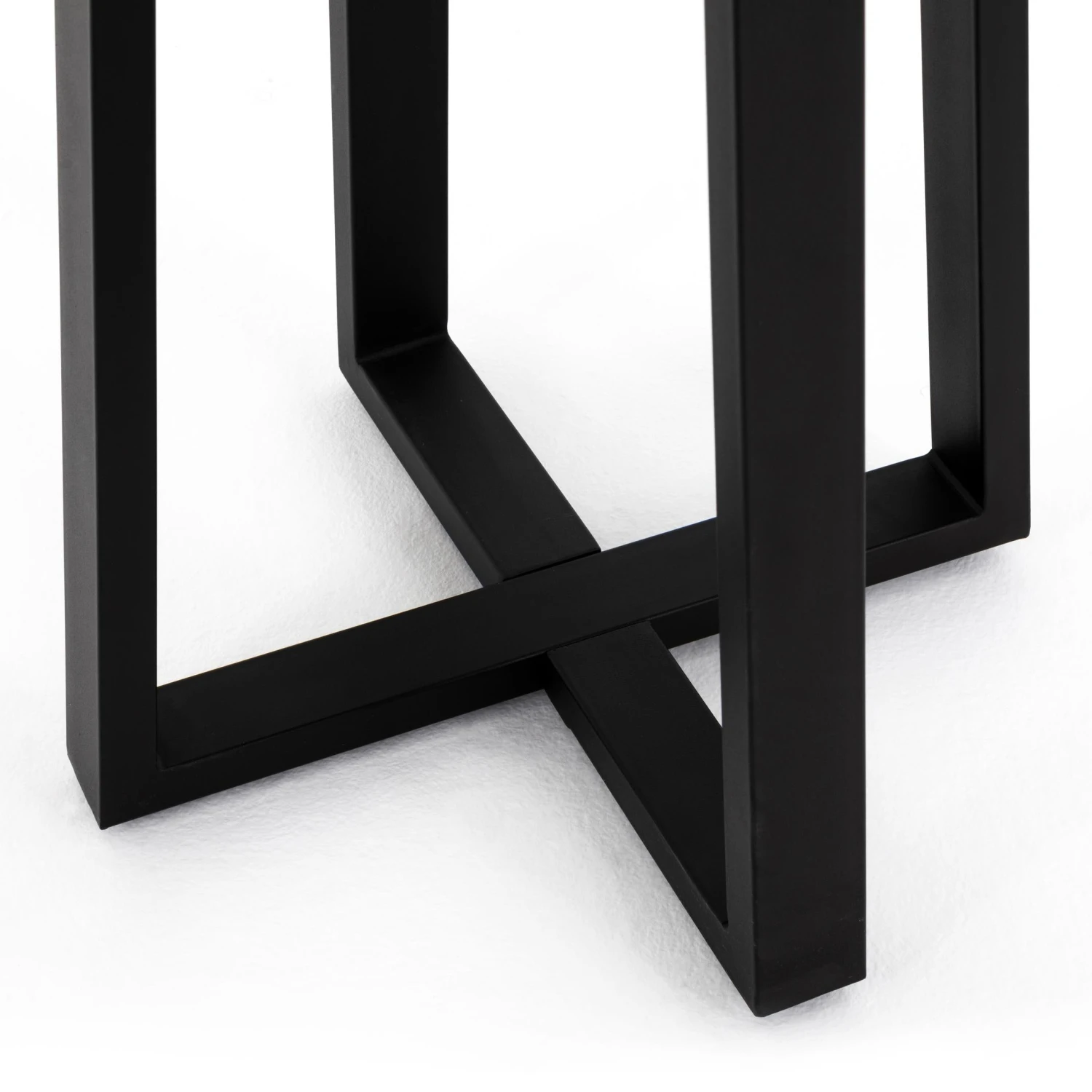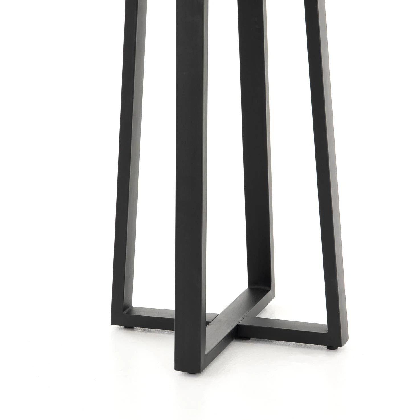 A strikingly simple lava stone top is polished to a smooth sheen, while an angular white-finished iron base makes for a modern monochromatic takeaway. Slight cover variance is to be expected, and speaks to the beautifully organic nature of lava stone. Cover or store indoors during inclement weather and when not in use.