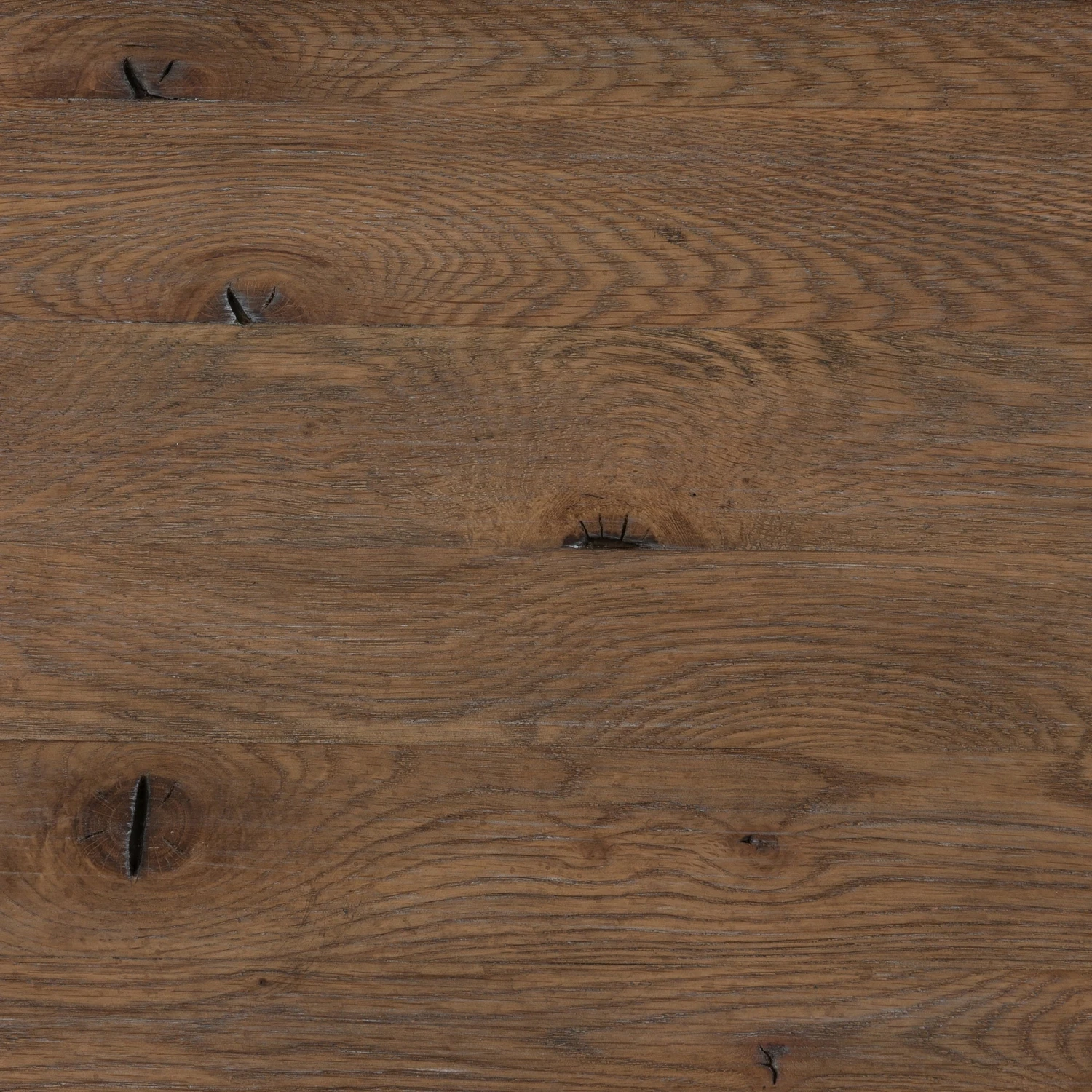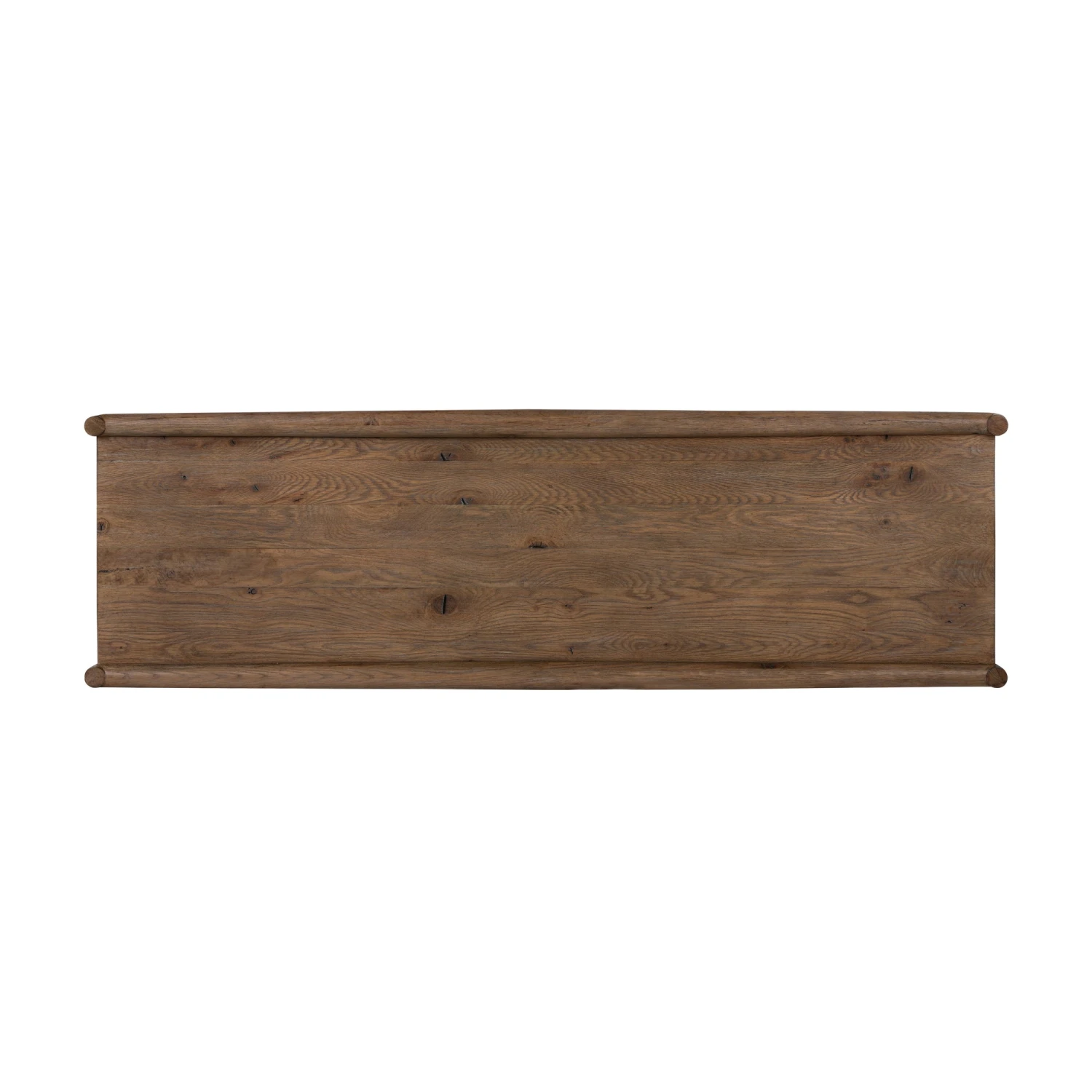 The traditional spindle structure brought to modern speed. Made from weathered oak with a light, rustic finish, six spacious drawers bring generous storage space to the bedroom. Simple cylindrical hardware is finished in an aged bronze.