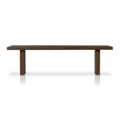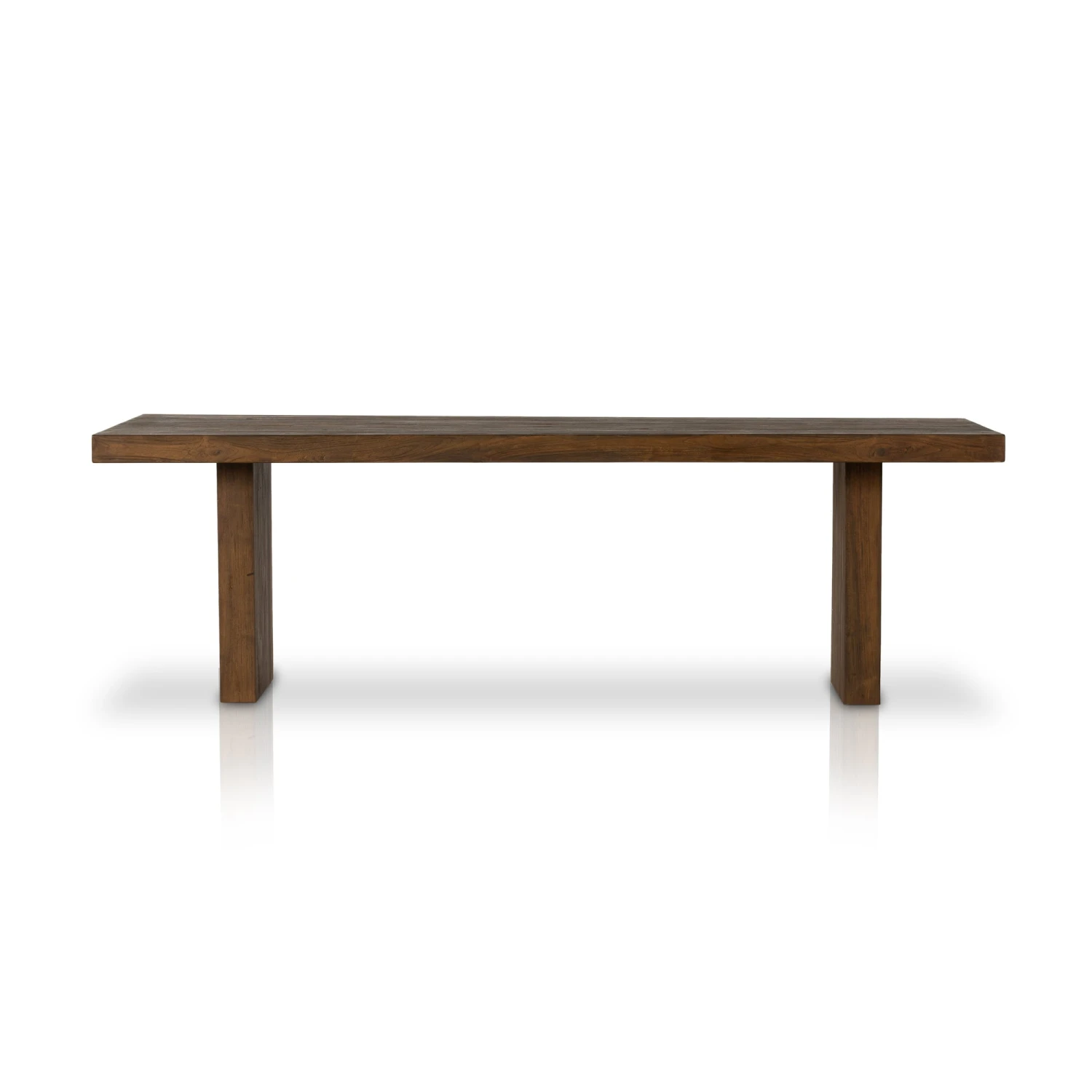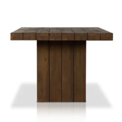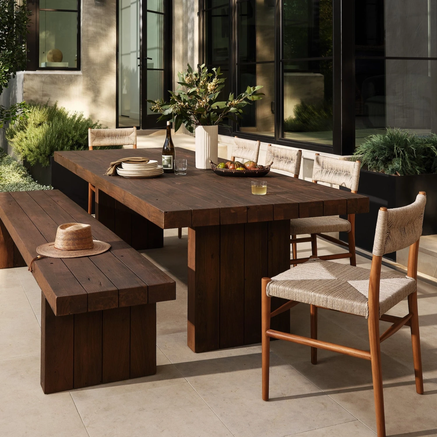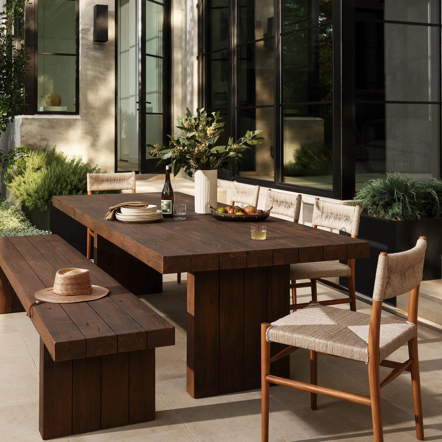 Thick, bold slabs of reclaimed wood and wide slats give this dining table its rich, organic character. A natural-toned heritage brown finish highlights the wood’s original knots and grains, making it a great addition to dining outdoors. Cover or store indoors during inclement weather and when not in use.