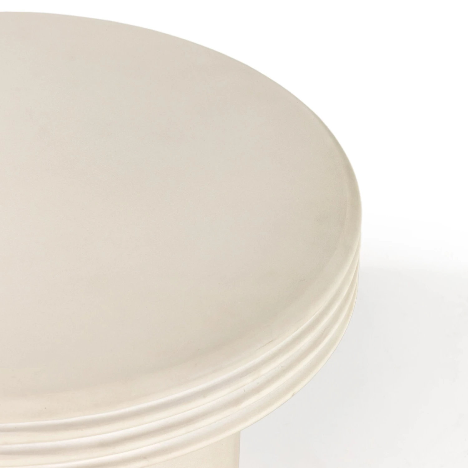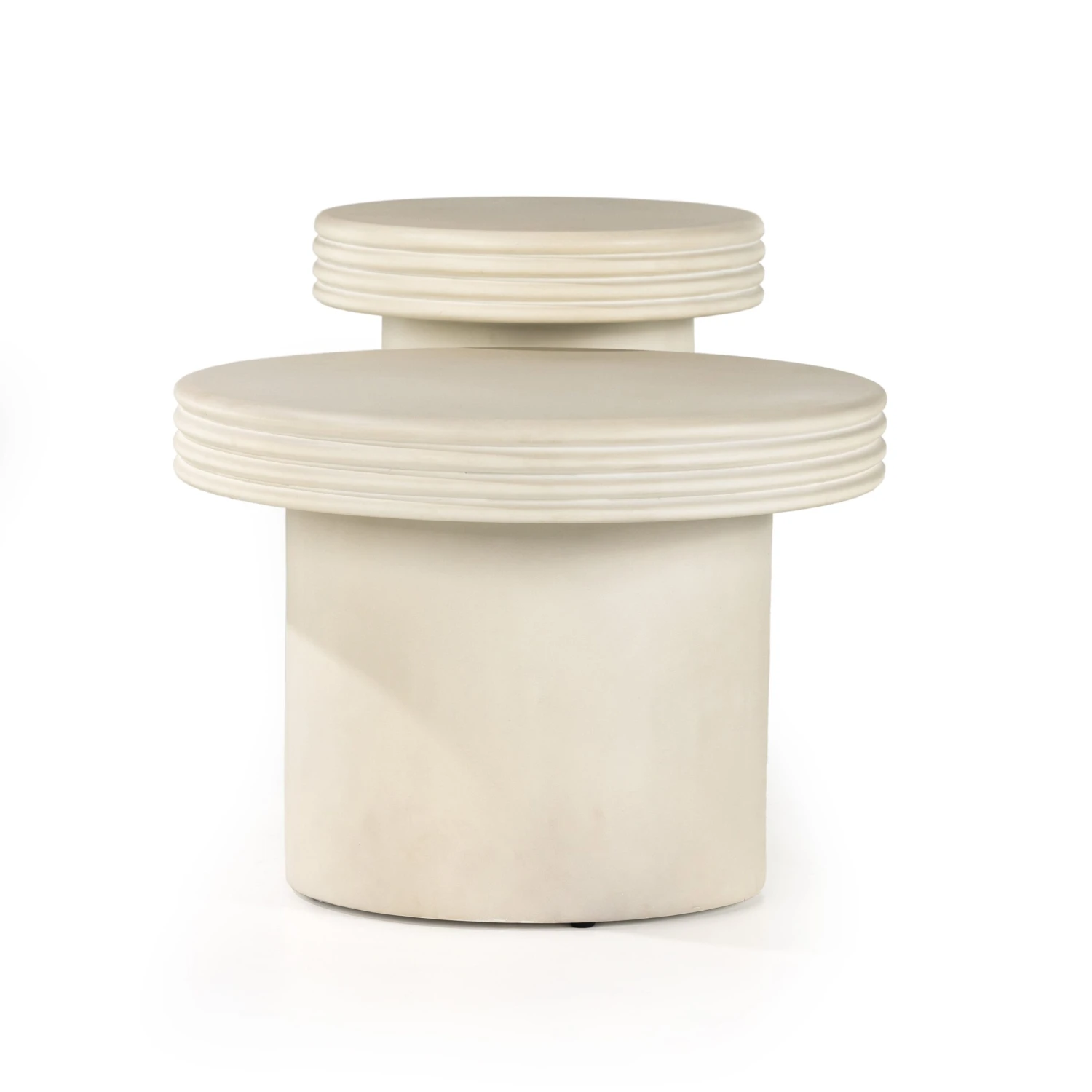 Statuesque and streamlined, a set of outdoor end tables is crafted of smooth solid concrete and detailed with ribbed edging on top. Cover or store indoors during inclement weather and when not in use.