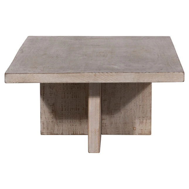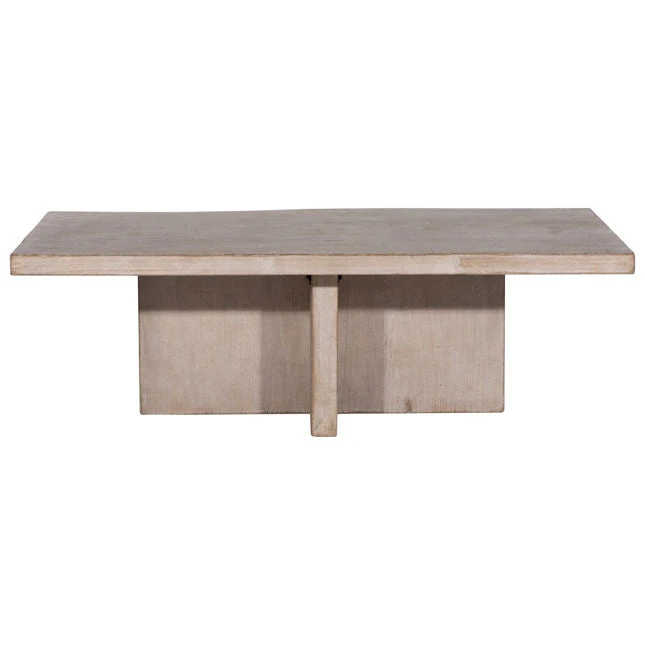 Solid reclaimed pine wood is the star of this 50″ Coffee Table. Finished in a light warm wash, the pine wood retains its natural tones, knots, and markings. Featuring a rectangular top along with a sturdy, geometric pedestal base to match.