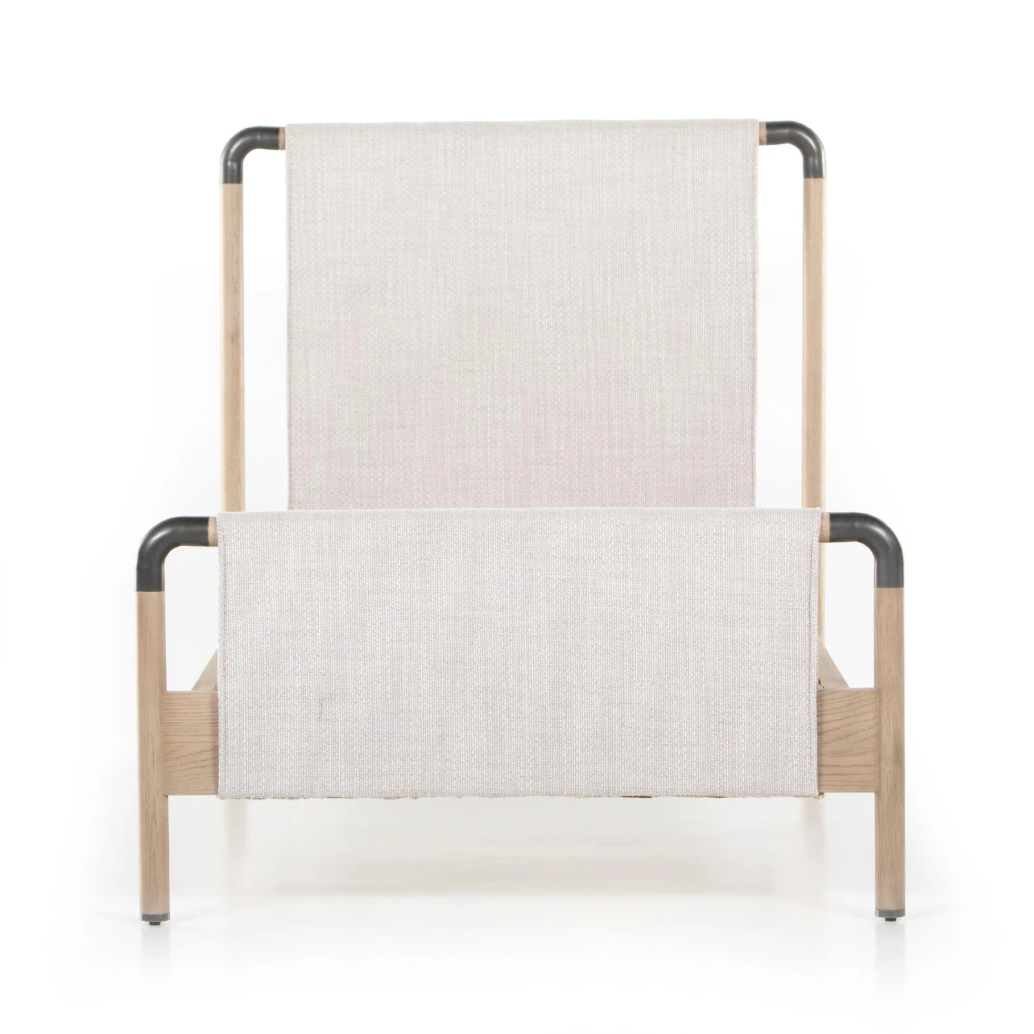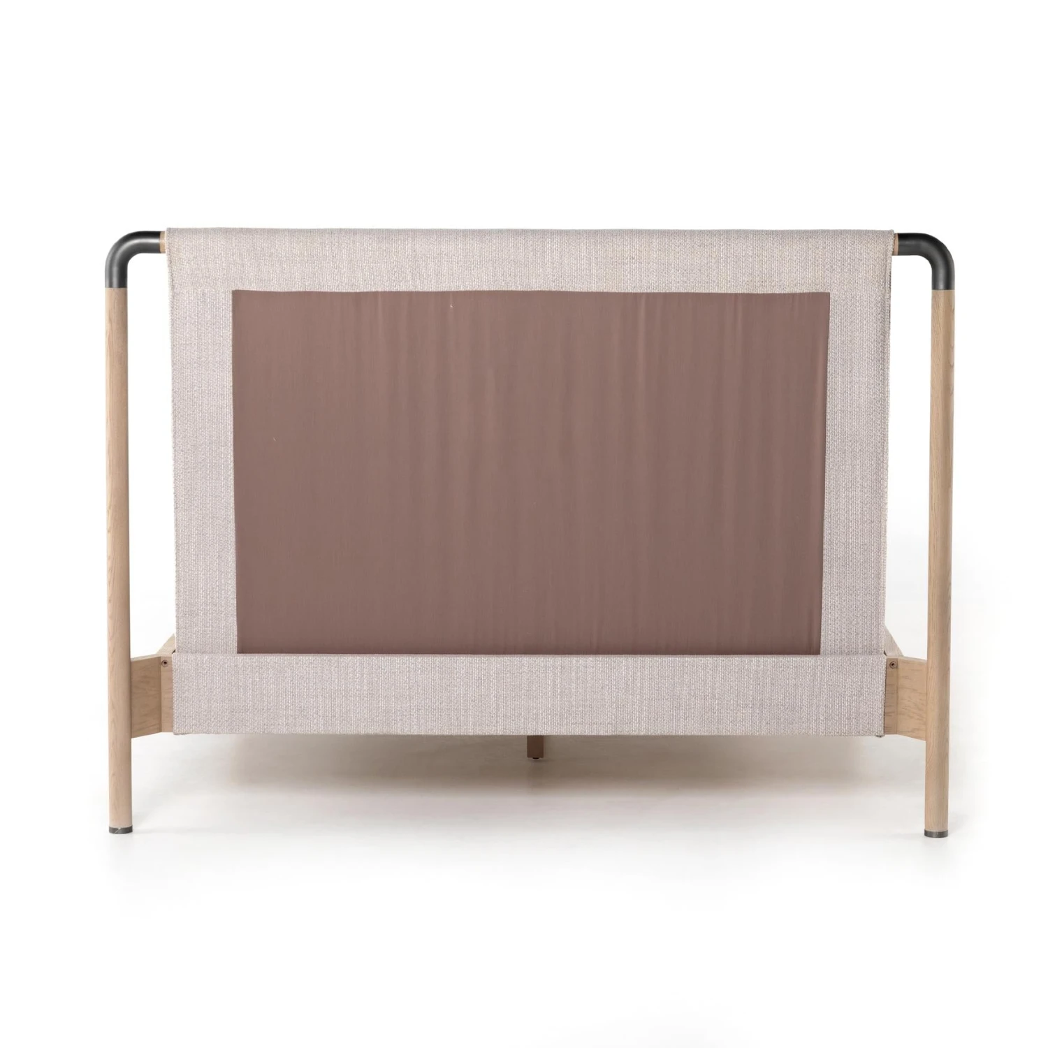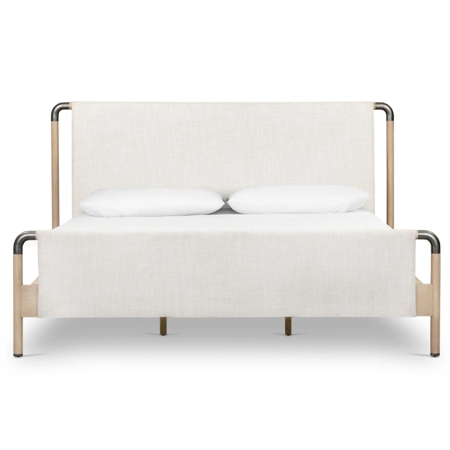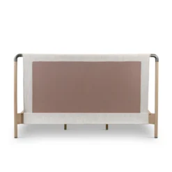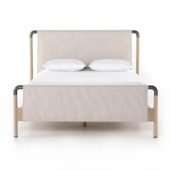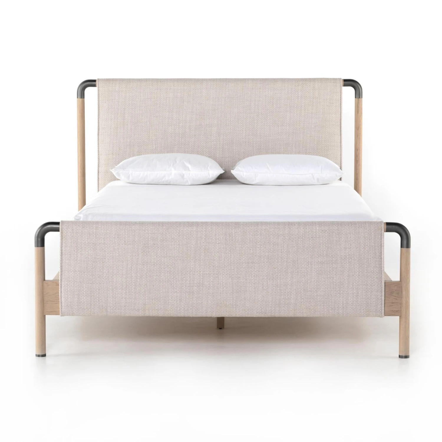Mixed materials make the bed. Framed by solid oak with rounded iron corners, an upholstered, sling-style headboard brings a light, modern vibe to the bedroom. Performance fabrics are specially created to withstand spills, stains, high traffic and wear, ensuring long-term comfort and unmatched durability. This bed is not compatible with an adjustable mattress.