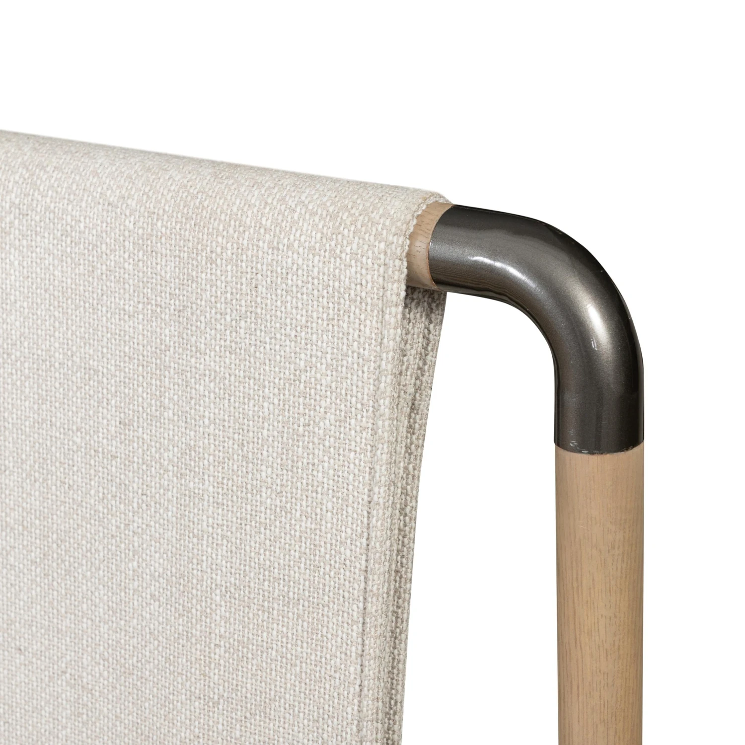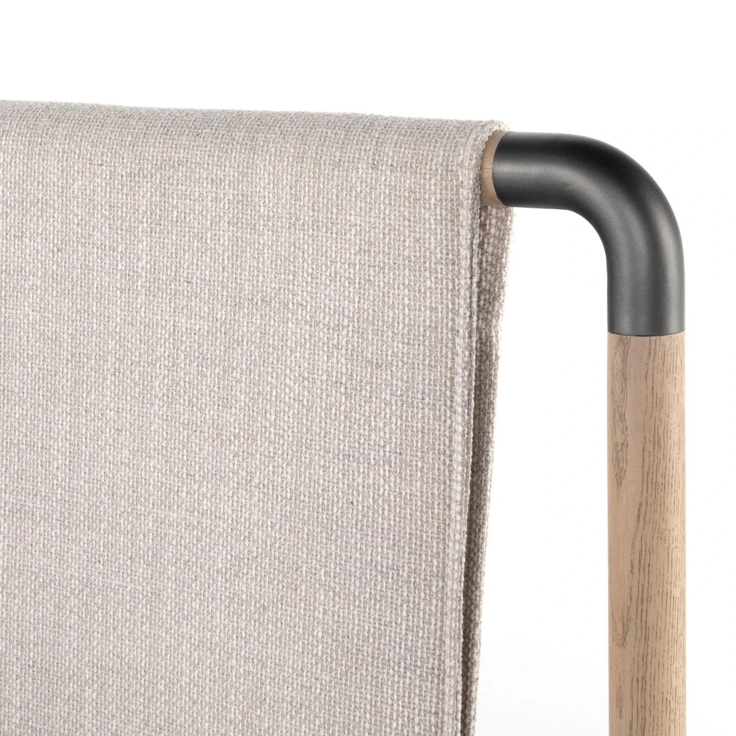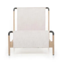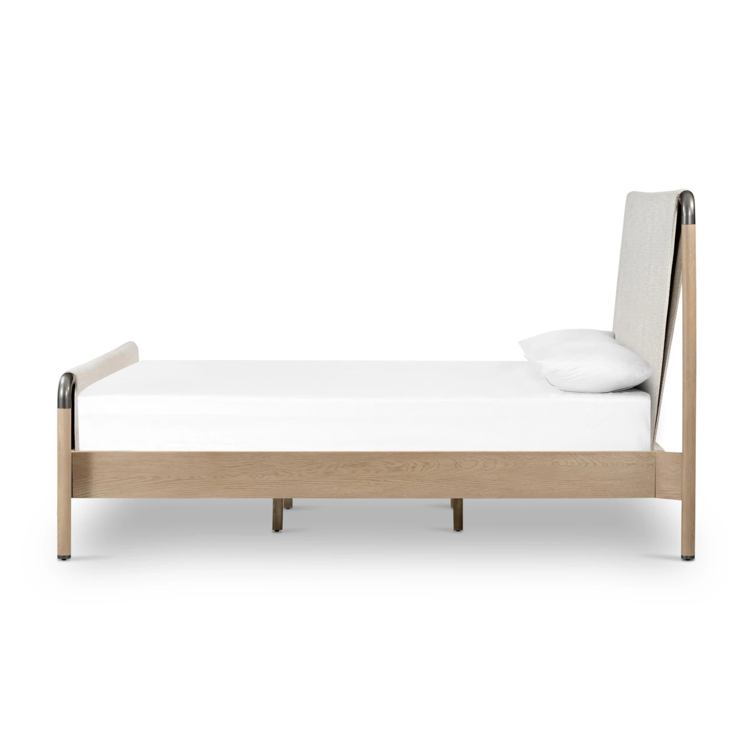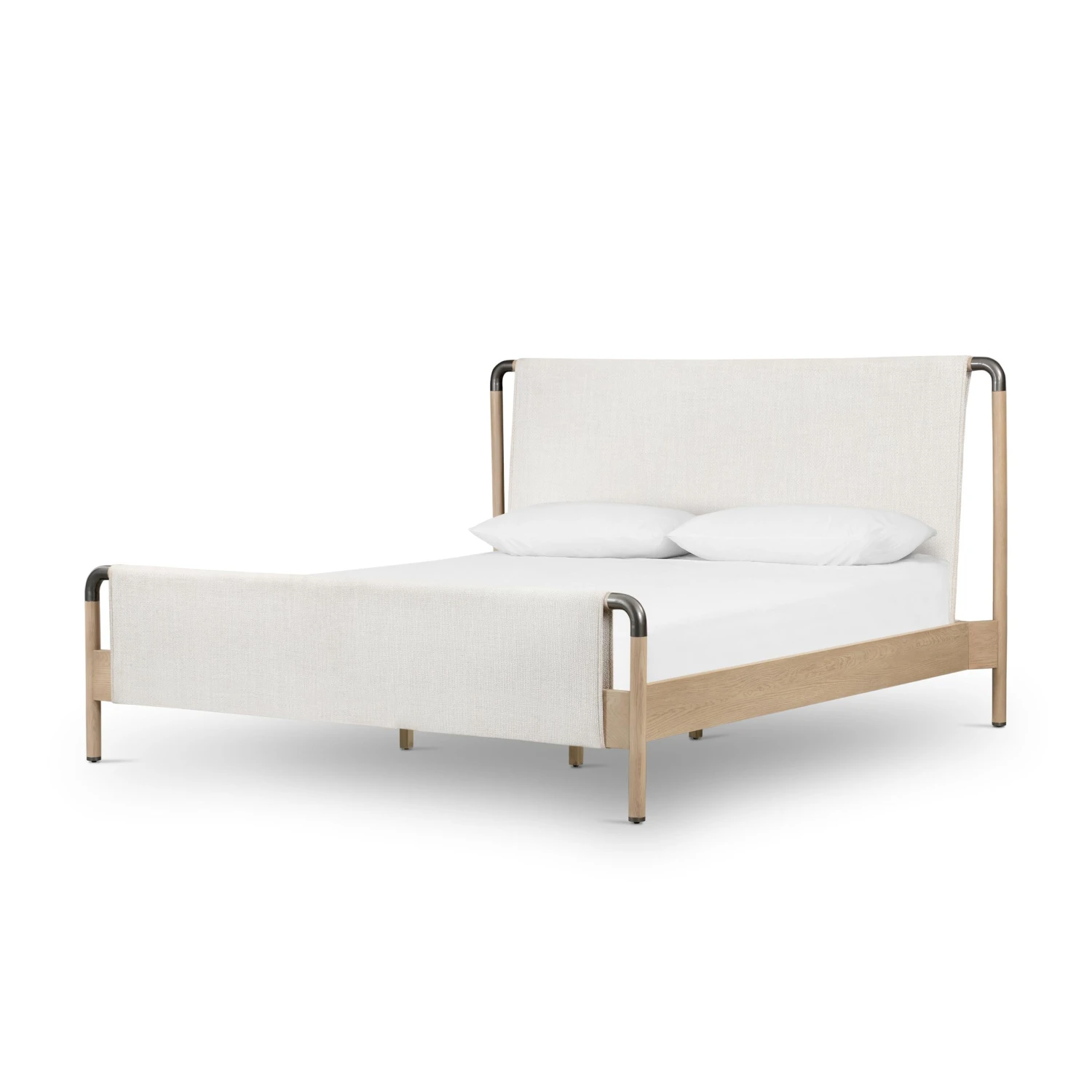 Mixed materials make the bed. Framed by solid oak with rounded iron corners, an upholstered, sling-style headboard brings a light, modern vibe to the bedroom. Performance fabrics are specially created to withstand spills, stains, high traffic and wear, ensuring long-term comfort and unmatched durability. This bed is not compatible with an adjustable mattress.