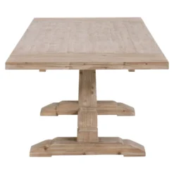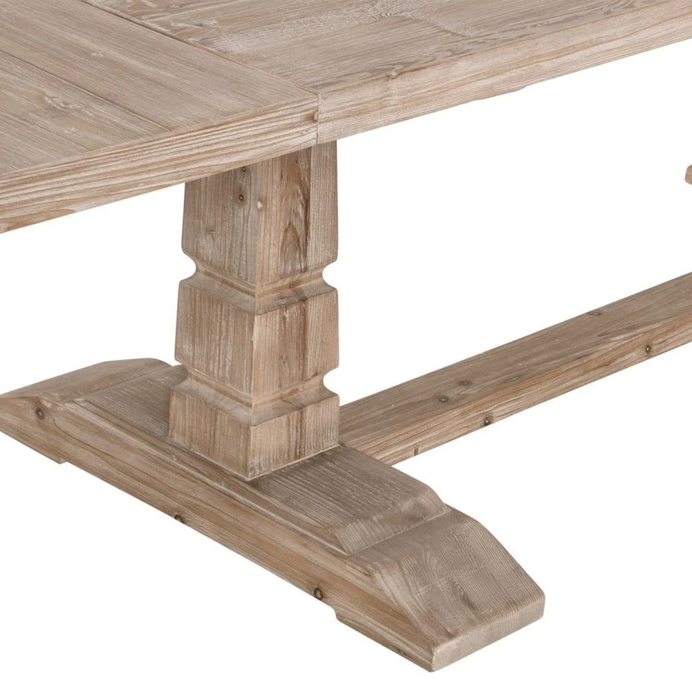This large extension dining table has a rustic charm that can meld with many interior designs. It is constructed with a reclaimed pine wood, adding character and organic modern style to this table. It contains two removable extension leaves that can be added to the ends of the table when additional seating and space is desired. The trestle-style base adds stability and decorative design for an eye-catching component. Can comfortably seat up to 10 people.