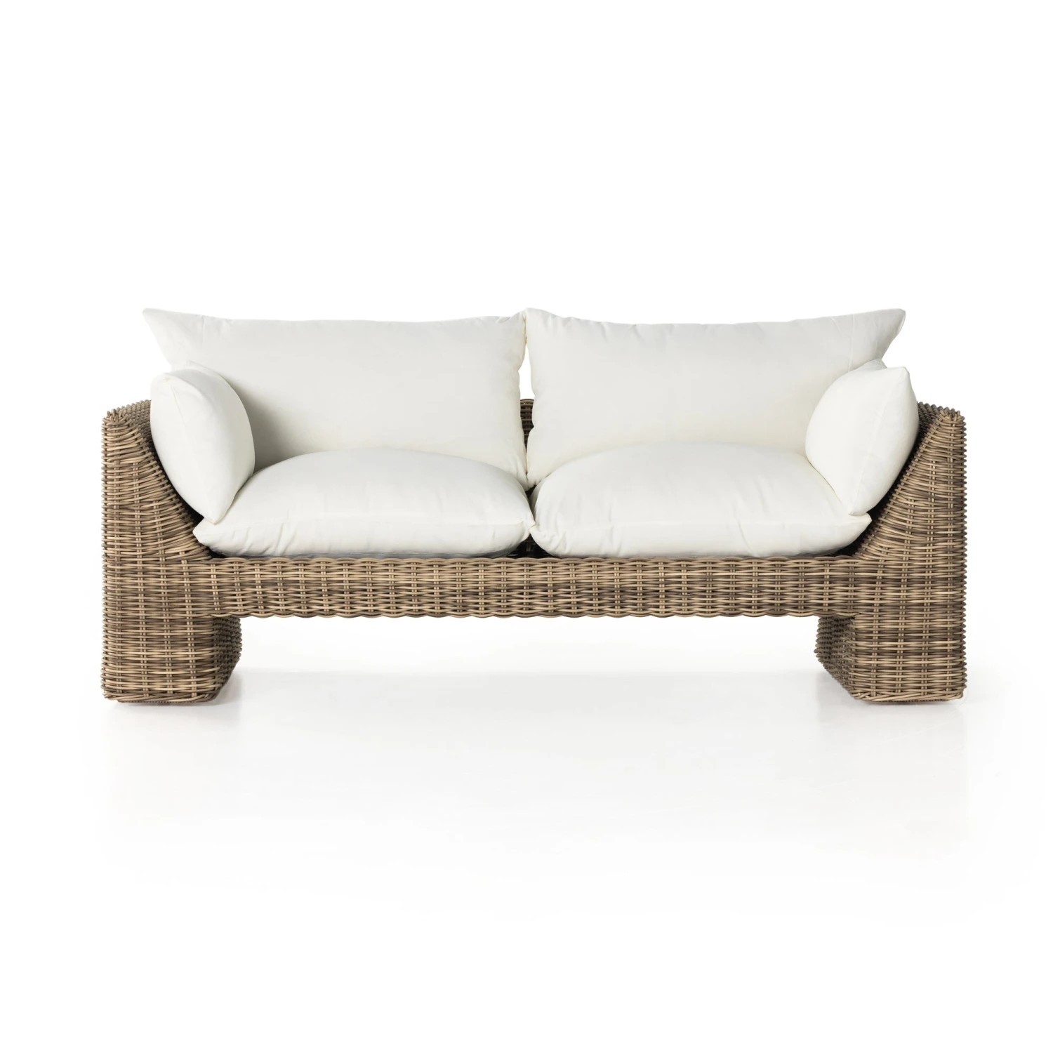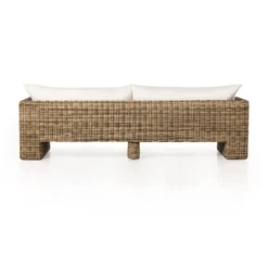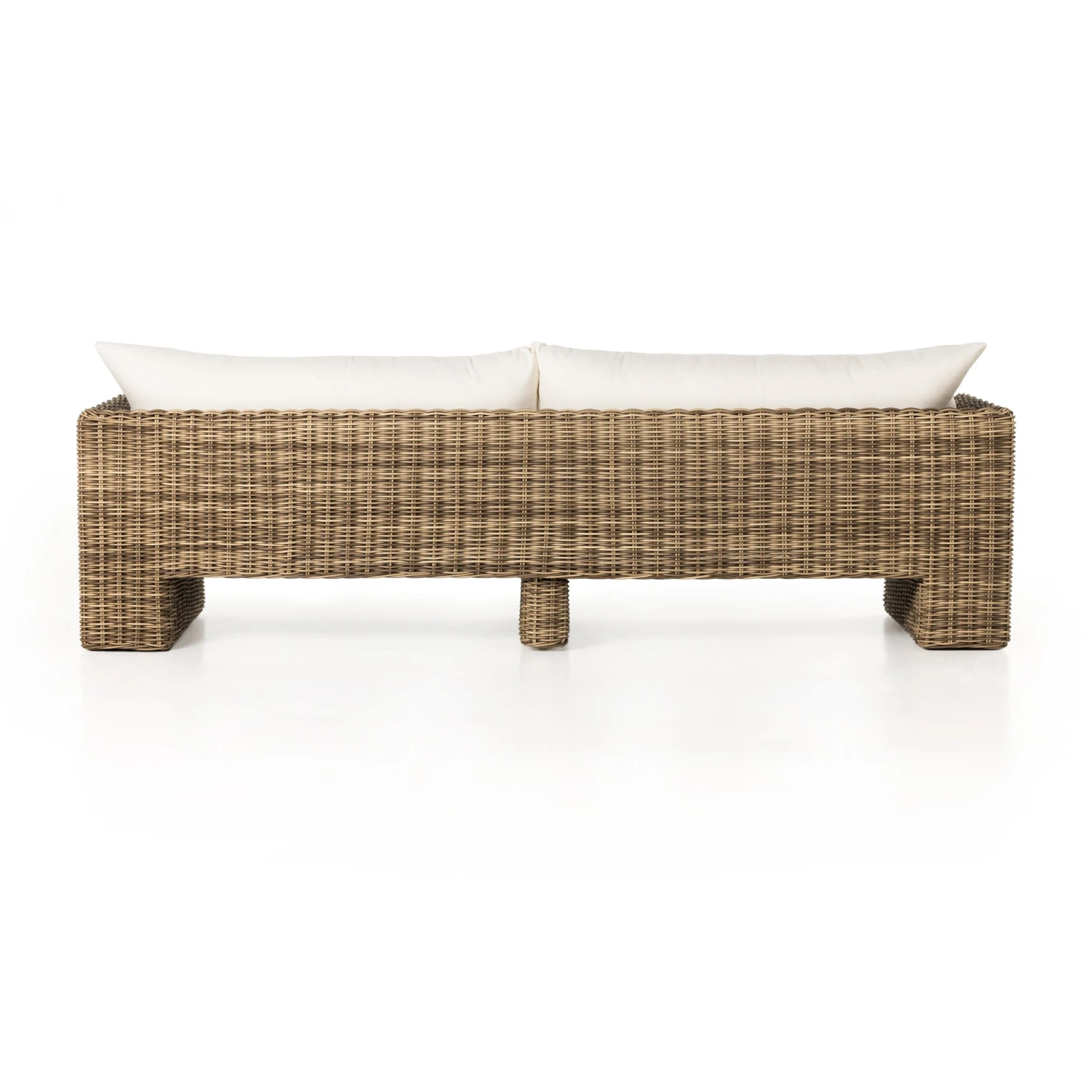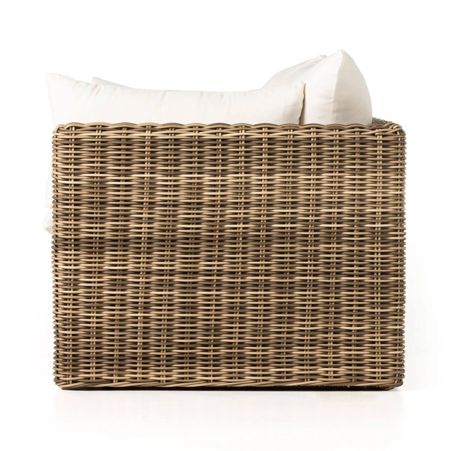 Comfort and durability meet for the best of both worlds on this outdoor sofa. Woven all-weather wicker, with highs and lows throughout for added depth, forms an overscale frame for plush knife-edge seat cushioning and arm pillows covered in UV-resistant, water-repellent, quick-drying olefin. Cover or store indoors during inclement weather and when not in use.