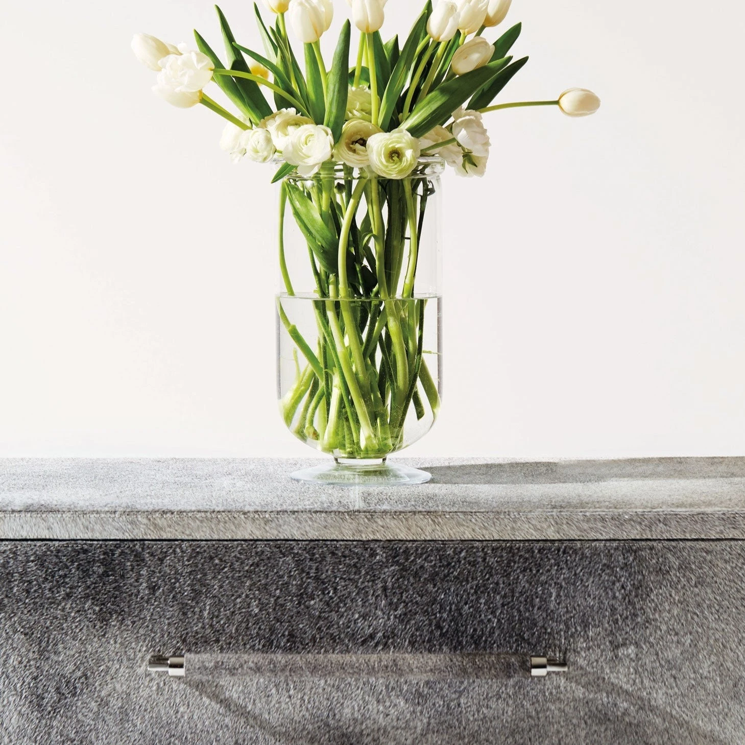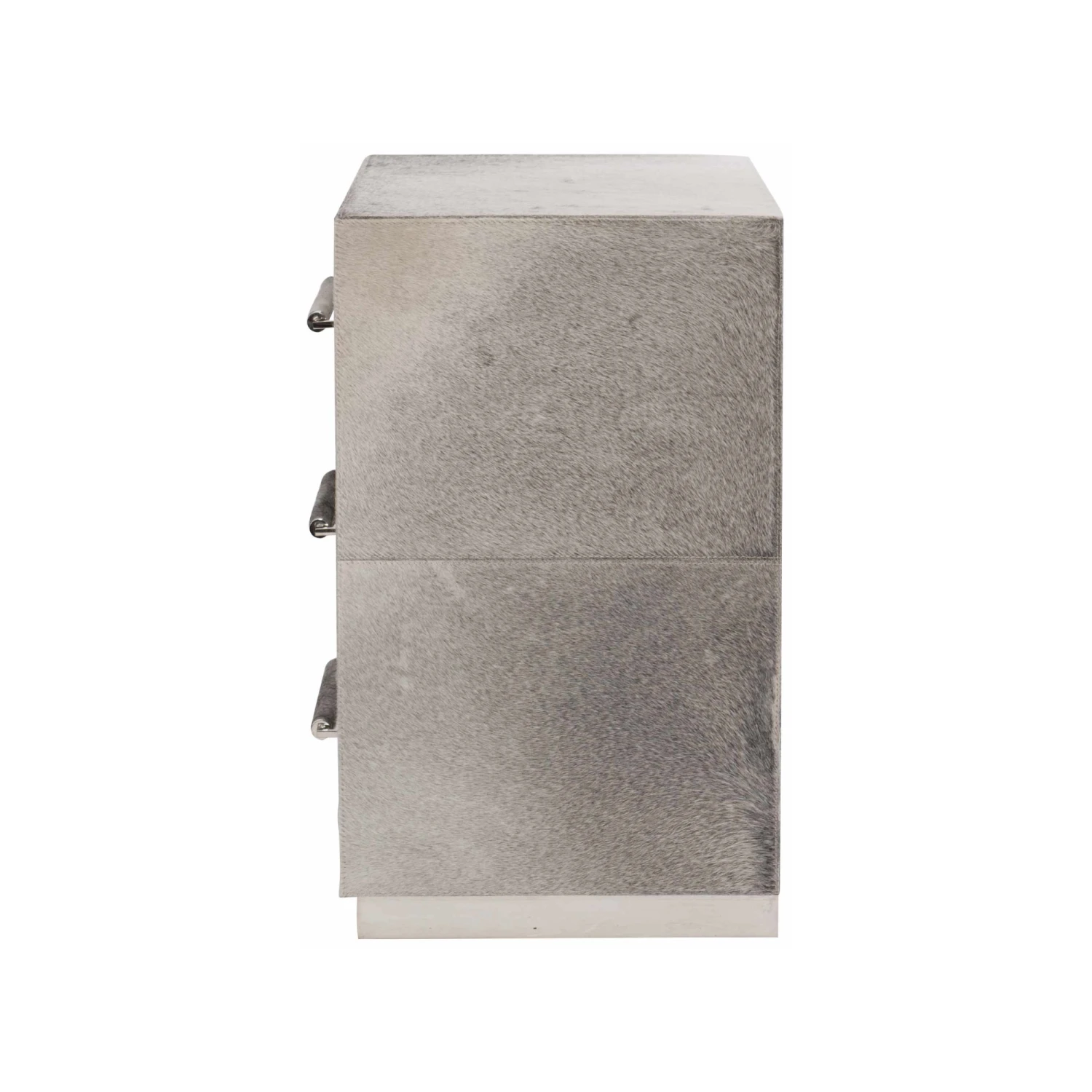 Gray hair-on-hide with saddle stitching and polished stainless steel plinth base. Note that hair-on hide is a 100% natural product, shade and hair length may vary and color variations are typical.