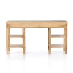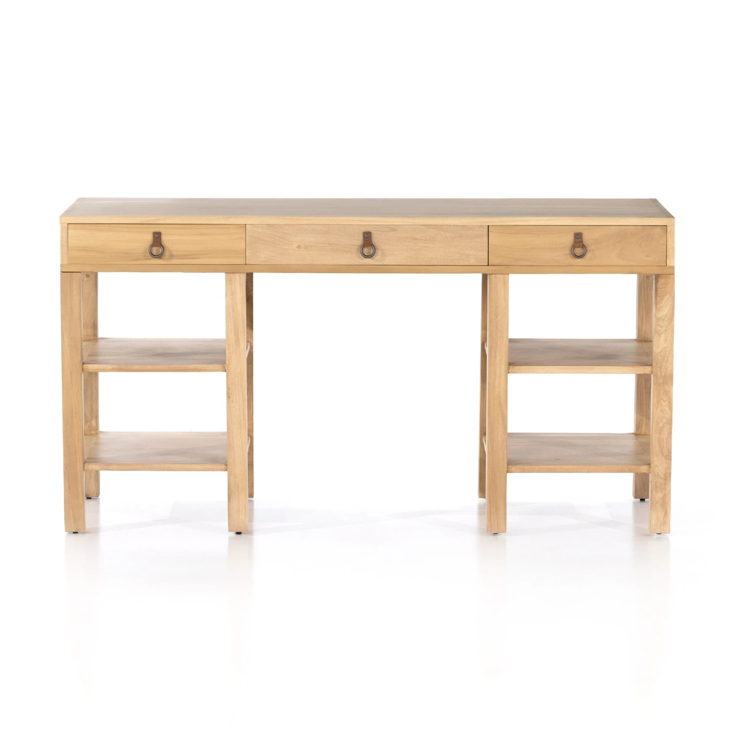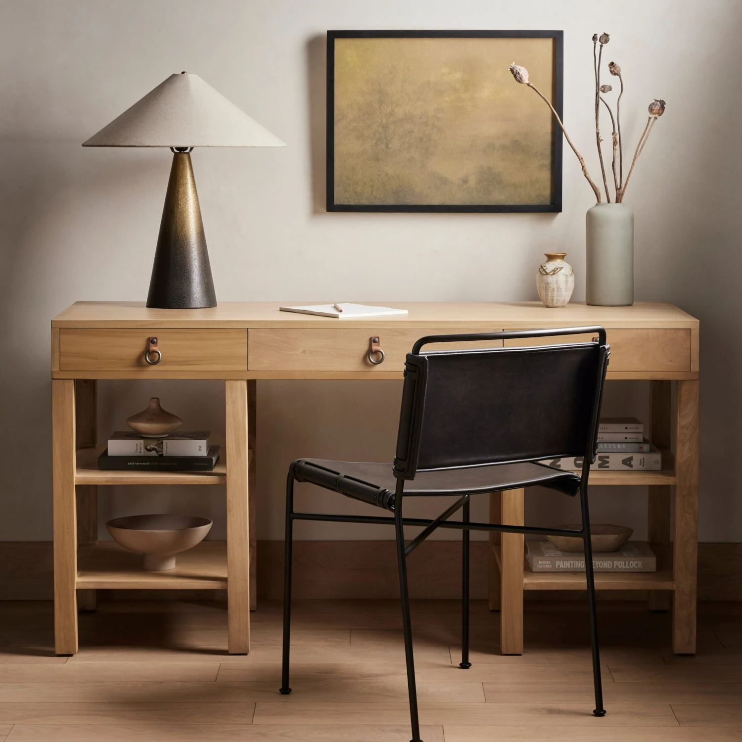 Beautifully simple in spirit. Dry-washed poplar forms a clean, Seventies-inspired desk with three drawers and generous open shelving. Dovetail joinery plus mixed iron and leather hardware place a fresh, material-driven twist on Shaker-like styling.