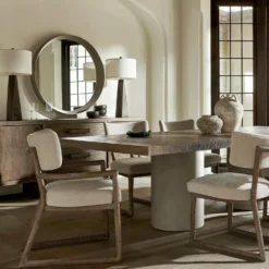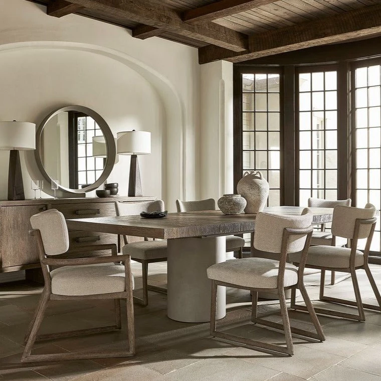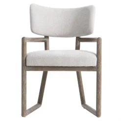 Bold shaping creates a mesmerizing geometric design for the Juno armchair. The exposed wood frame in Playa finish supports a softly curved, upholstered floating back and seat. The chair has a refined, pared-down aesthetic.