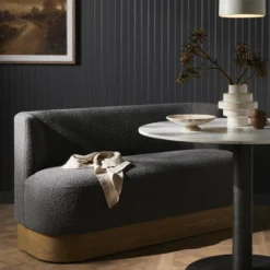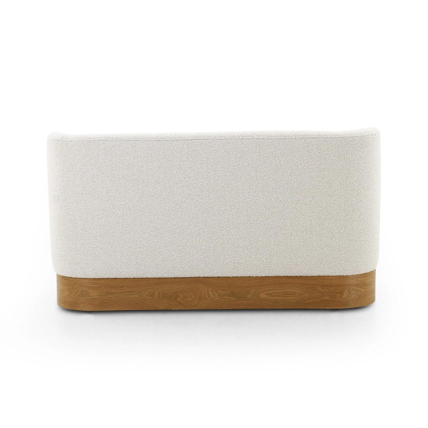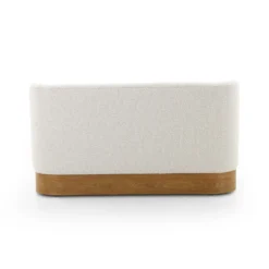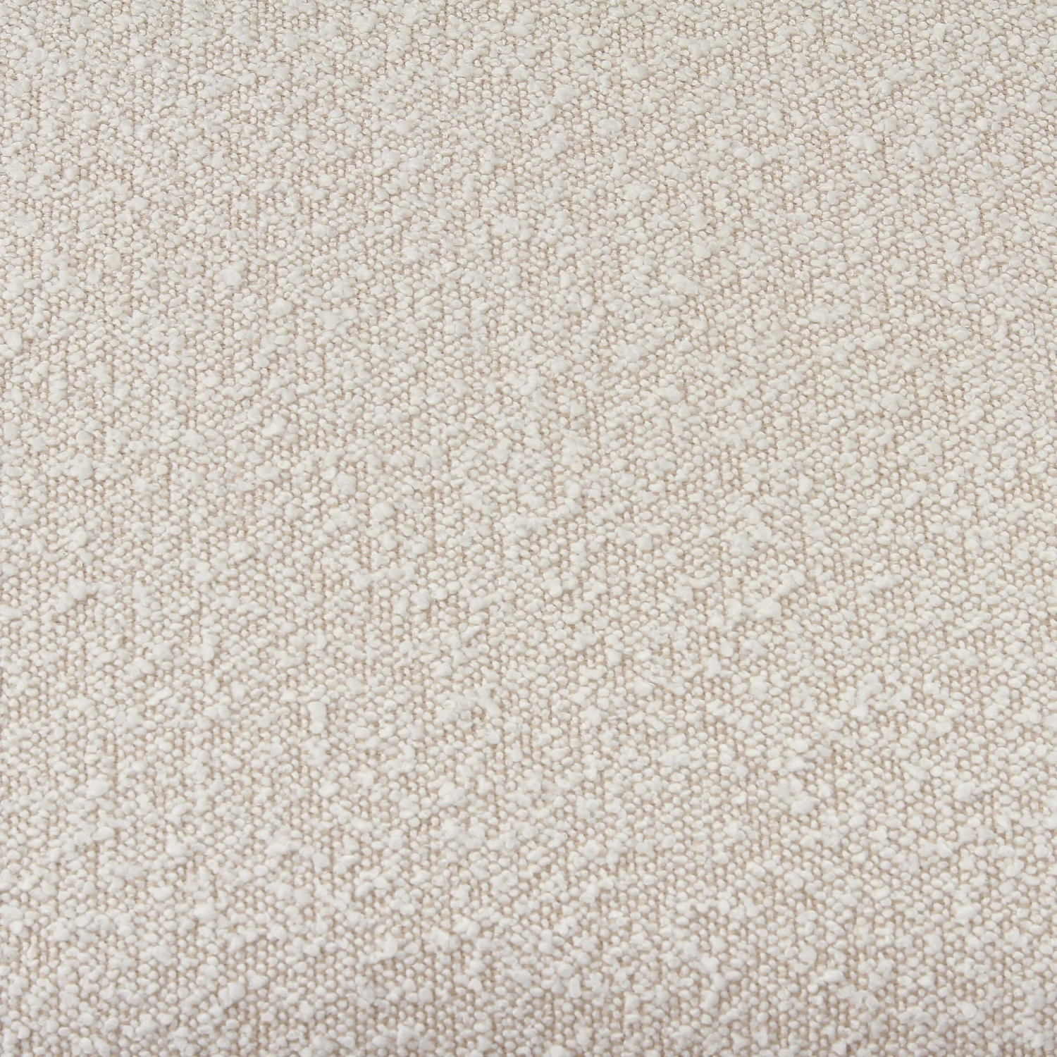 Style takes shape. Comfortably curved bench seating is upholstered in a chunky off-white boucle, with water-repellent performance fabric for a modern touch. A plinth-style ash veneer base works casual contrast into the mix. Perfectly sized for a cozy breakfast nook; pair up to suit a larger space. Performance fabrics are specially created to withstand spills, stains, high traffic and wear, ensuring long-term comfort and unmatched durability.