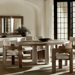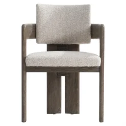 A wooden frame bends and curves on either side of the Lark armchair, while a laced and twisted rope detail connects the frame on the back panel. A floating back and upholstered seat offer comfort while the wood’s Playa finish showcases an updated rustic modern style.
