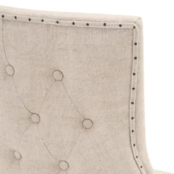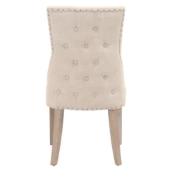 These dining chairs perfectly pair farmhouse and traditional styles. The unique curvature of the seat back allows for comfort and eye-catching design. The back of the seat and seat cushion are lined with black nail tacks, adding just a touch of farmhouse feel. They are upholstered with a beautiful bisque colored linen and polyester blend that is accented with a button-tufted design on the seat back. A solid ash wood base with natural gray tones gives the chairs support and durability for many uses around your dining area. Add these chairs to your dining room or kitchen for a classy and clean style.
