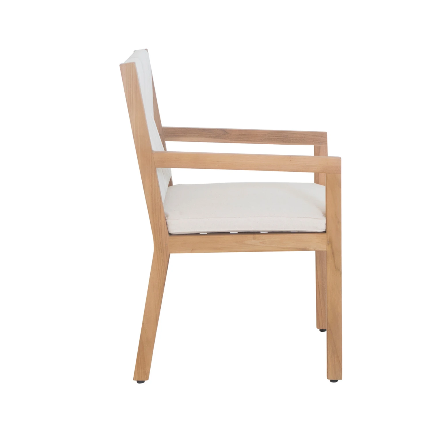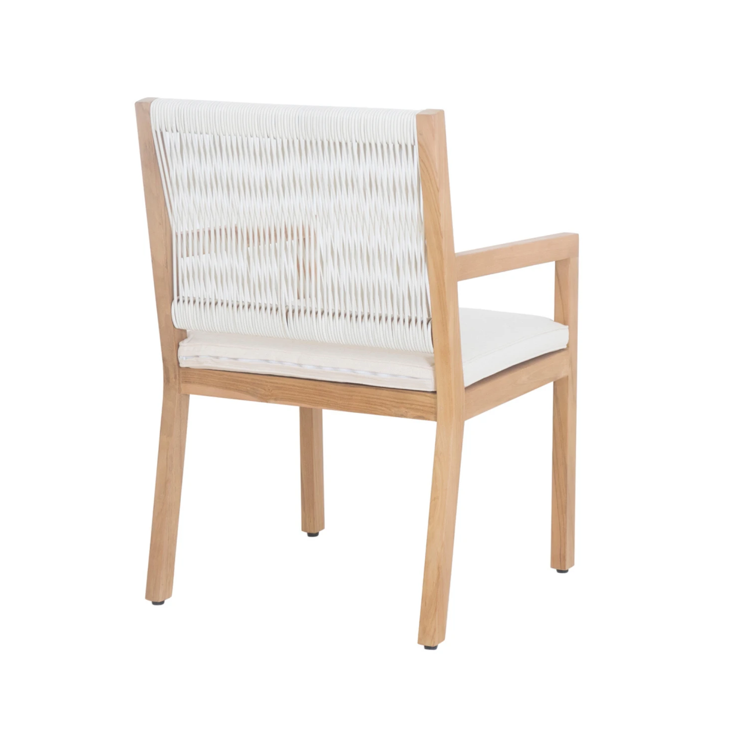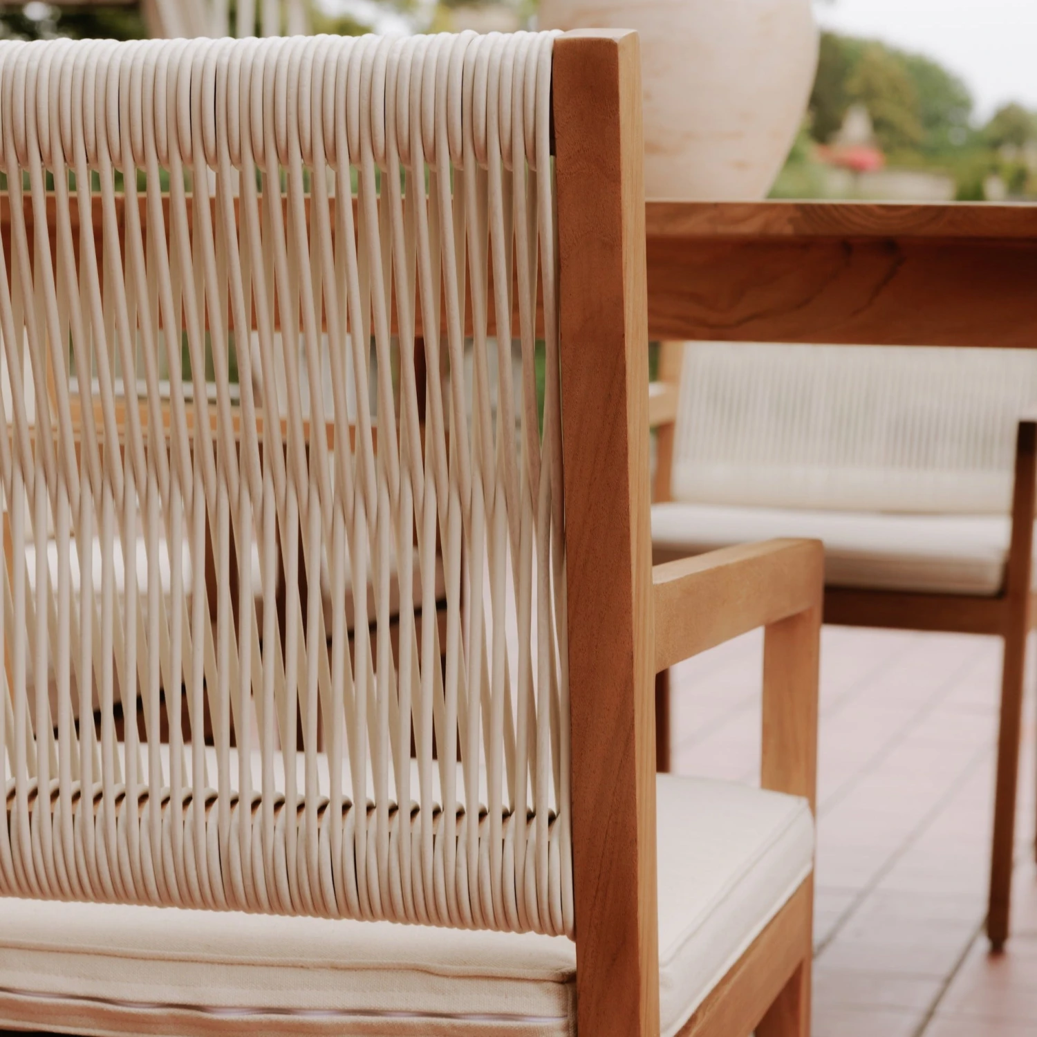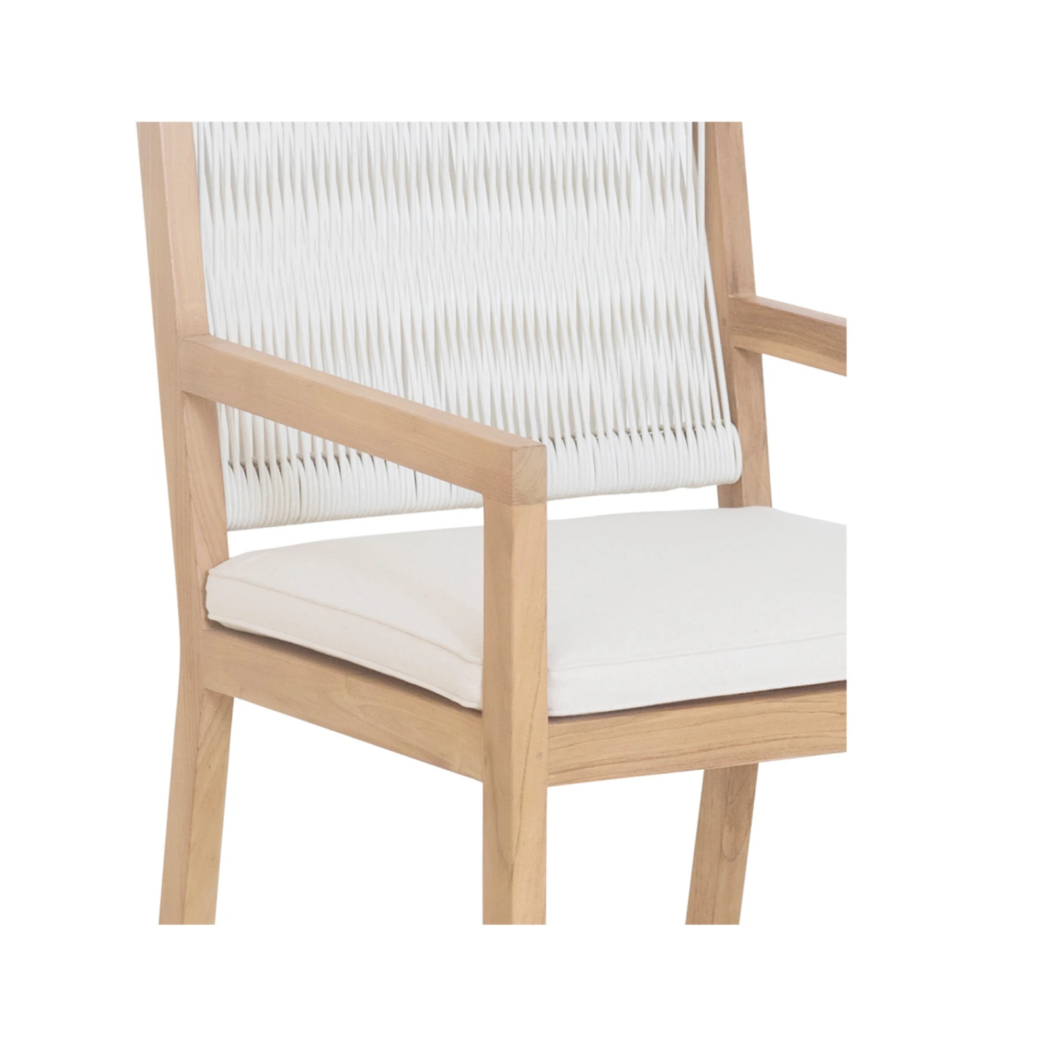 Let the sunlight shine bright on the beautiful white synthetic wicker weave of the Lucas outdoor dining chair. Its warm teak frame turns into a darker patina over time, while a removable, easy-to-clean ivory white cushion captures the light and dark contrast of this gorgeous piece. Dining al fresco never looked so good.