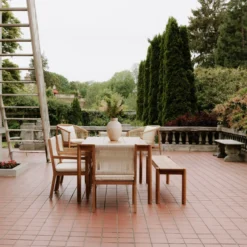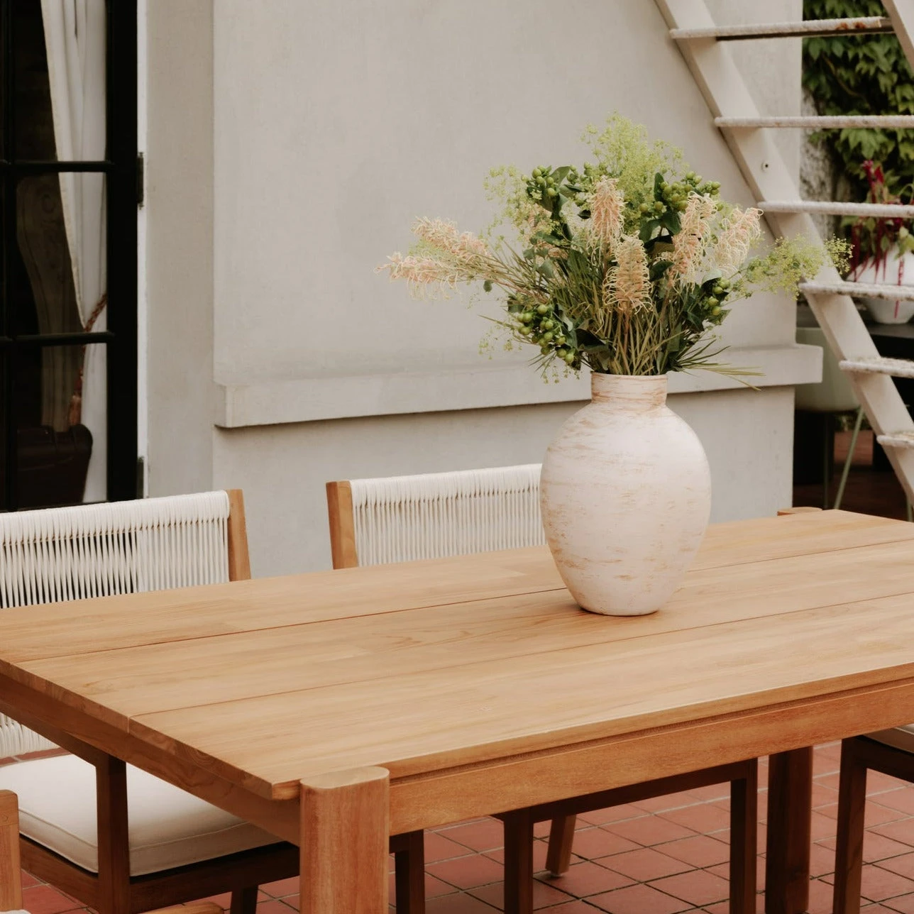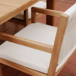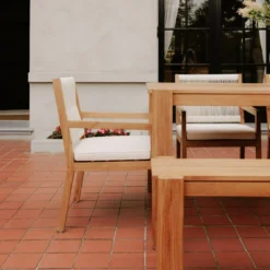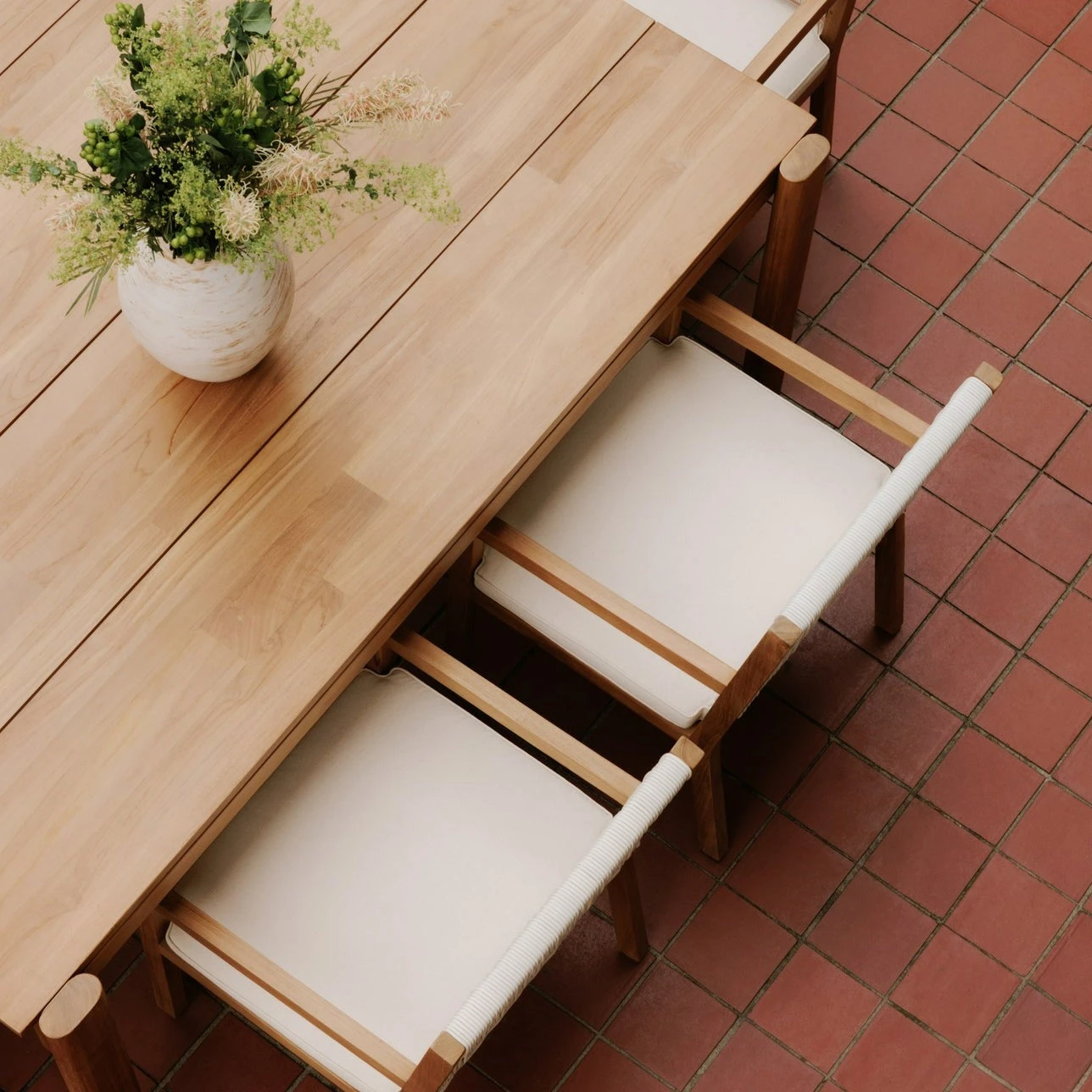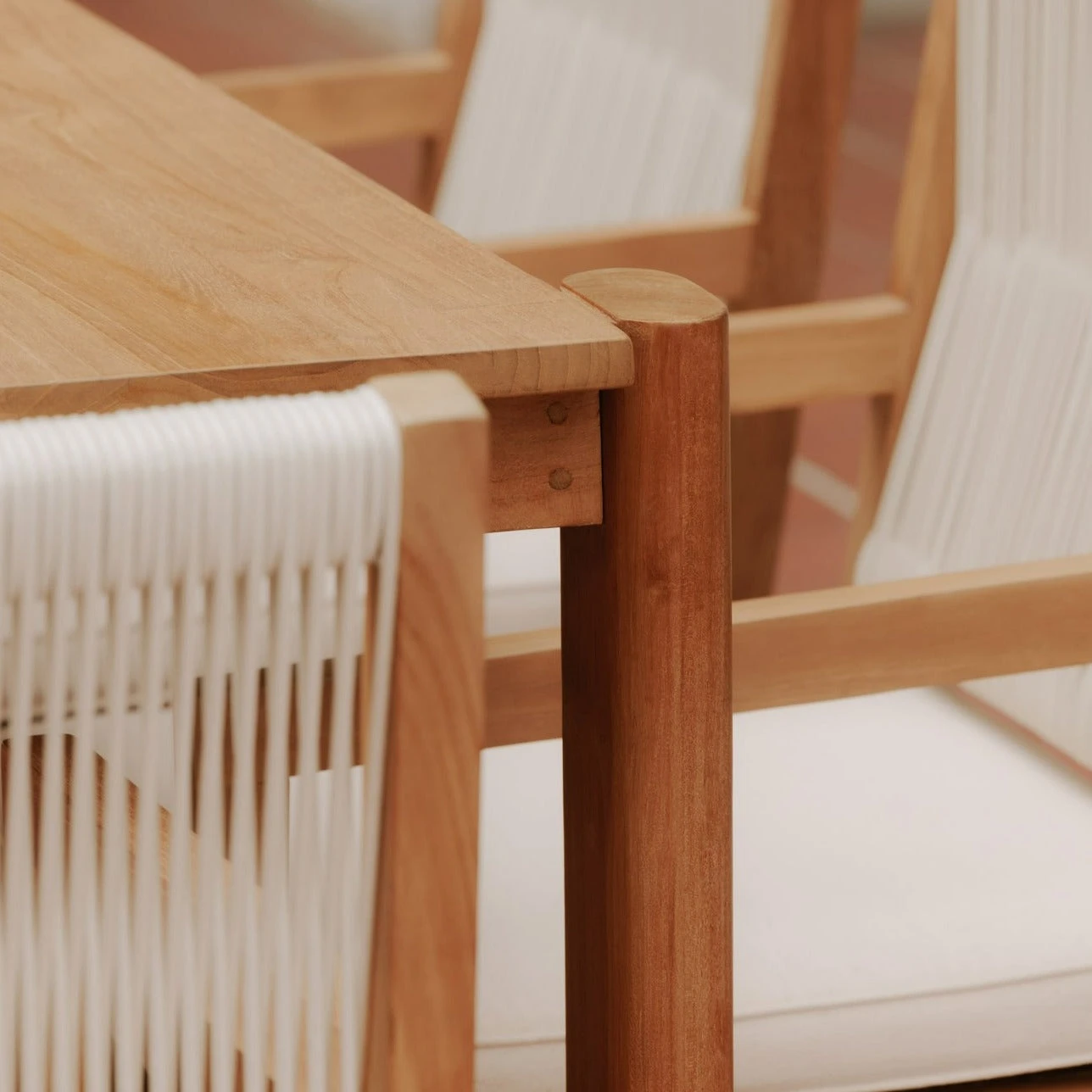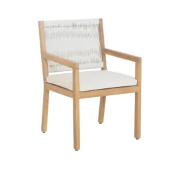 Let the sunlight shine bright on the beautiful white synthetic wicker weave of the Lucas outdoor dining chair. Its warm teak frame turns into a darker patina over time, while a removable, easy-to-clean ivory white cushion captures the light and dark contrast of this gorgeous piece. Dining al fresco never looked so good.