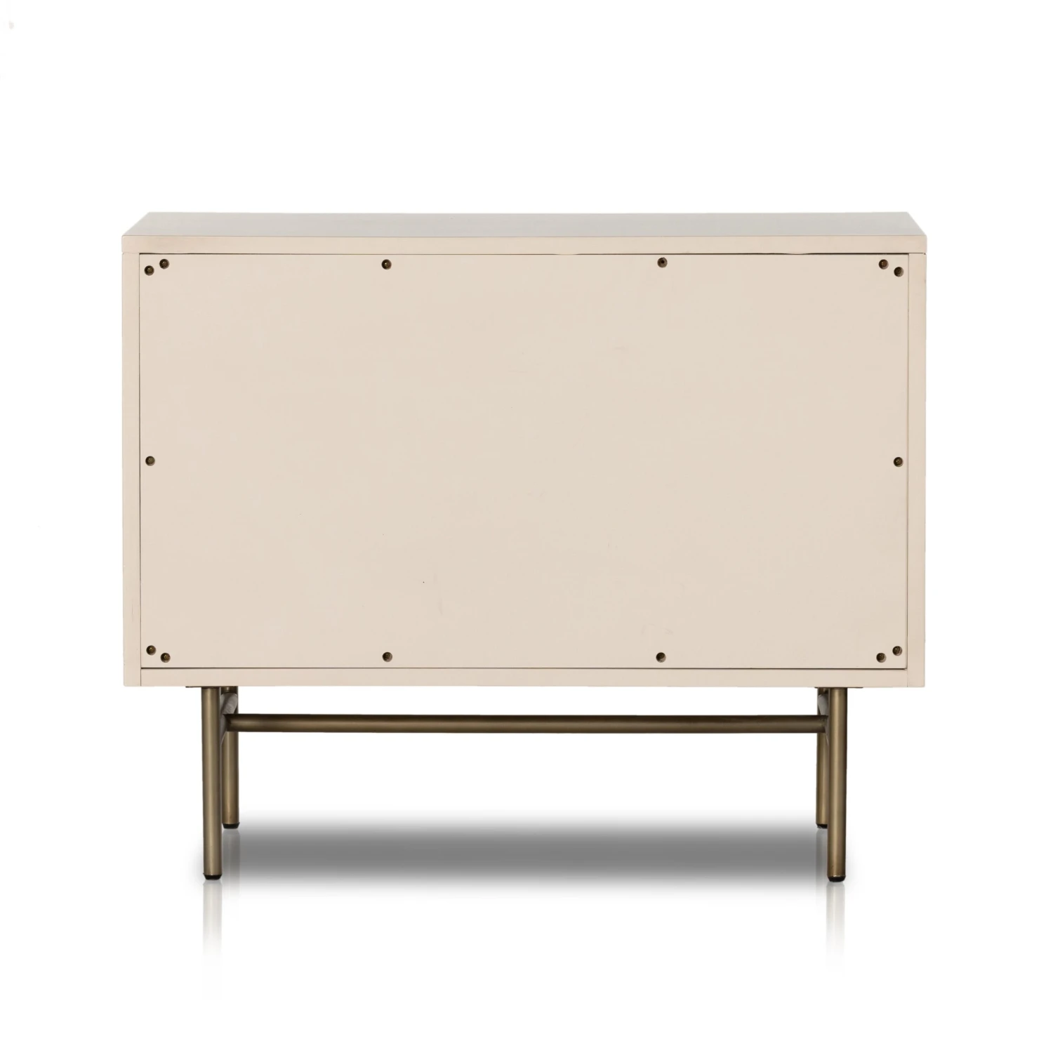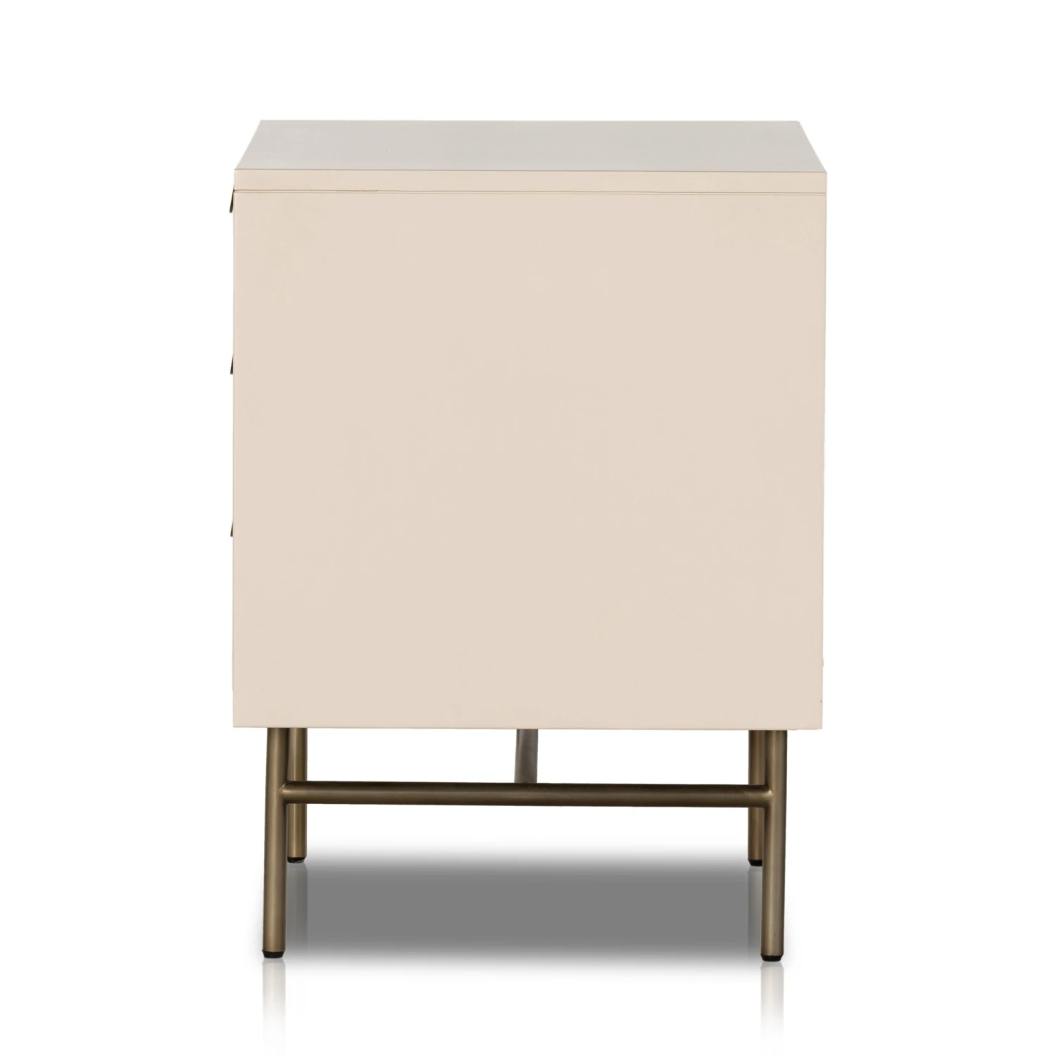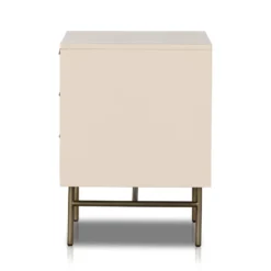 Bring a light, textural look to bedside storage. A lacquered three-drawer nightstand features woven cane panels and half-moon hardware finished in an aged brass.