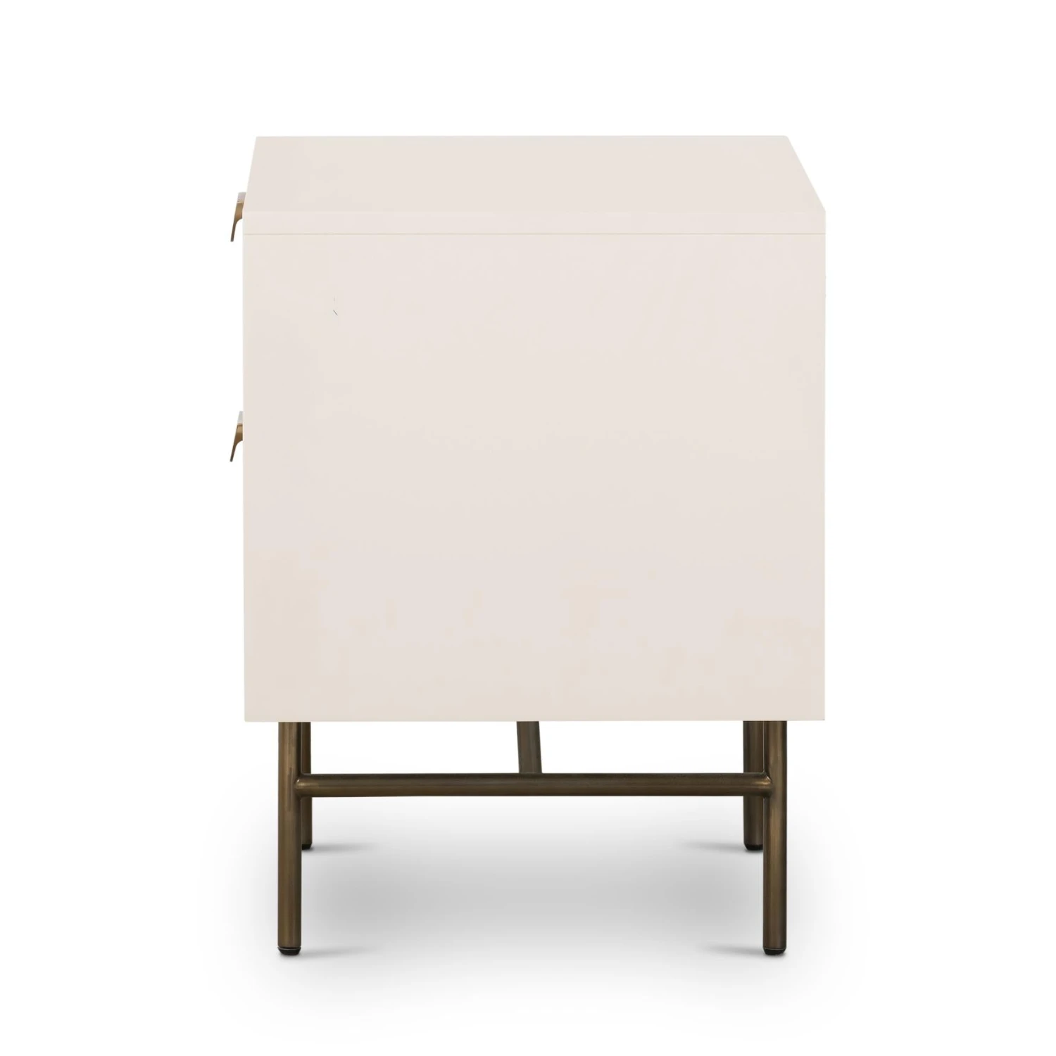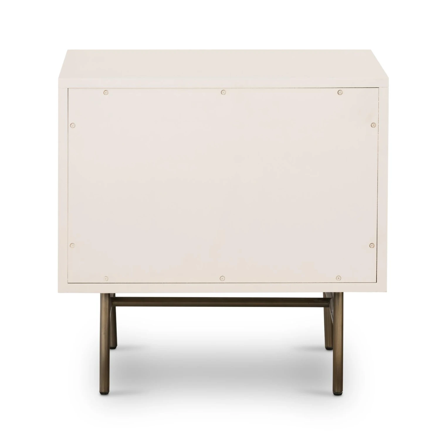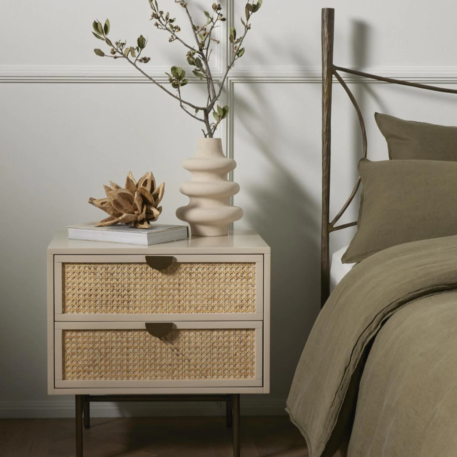 Bring a light look to bedroom styling. A two-drawer nightstand features woven cane panels and half-moon hardware finished in an aged brass.