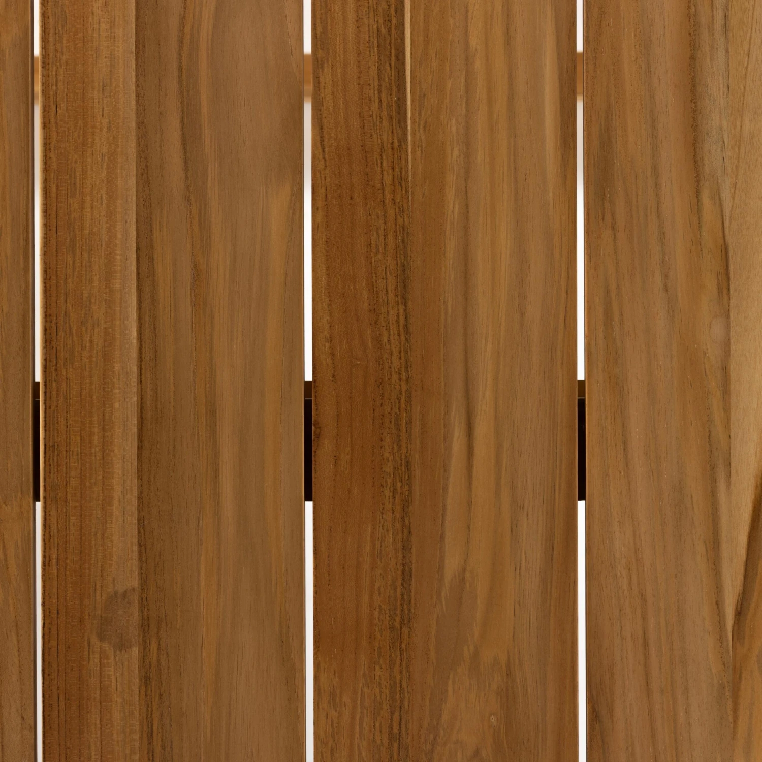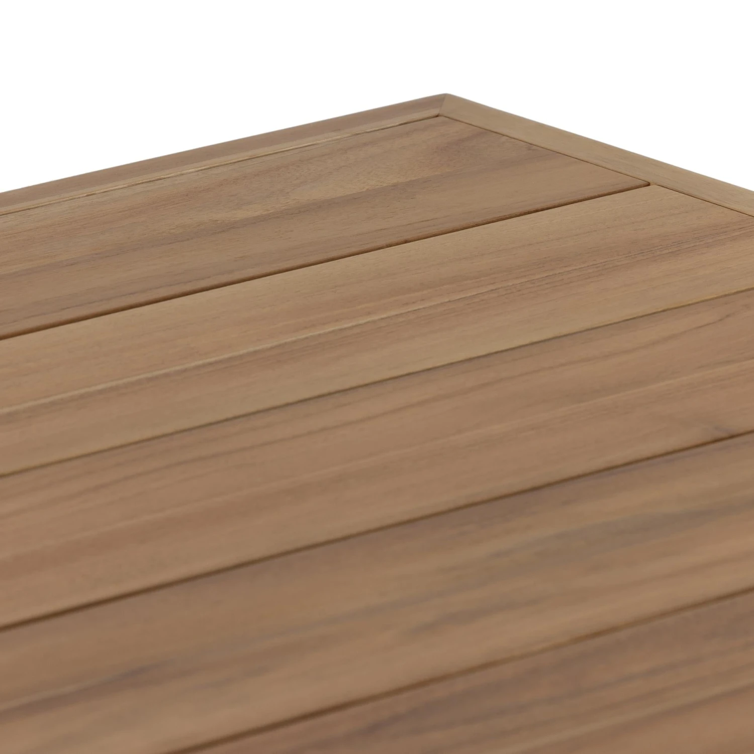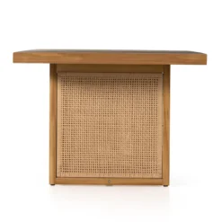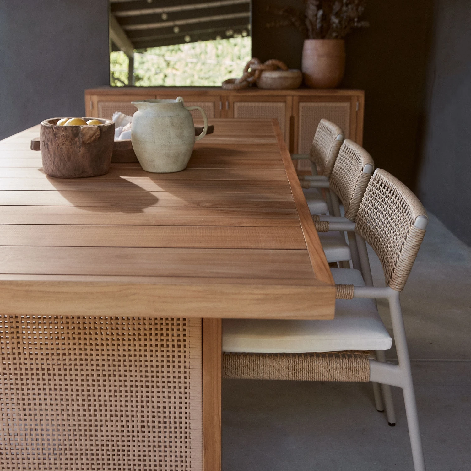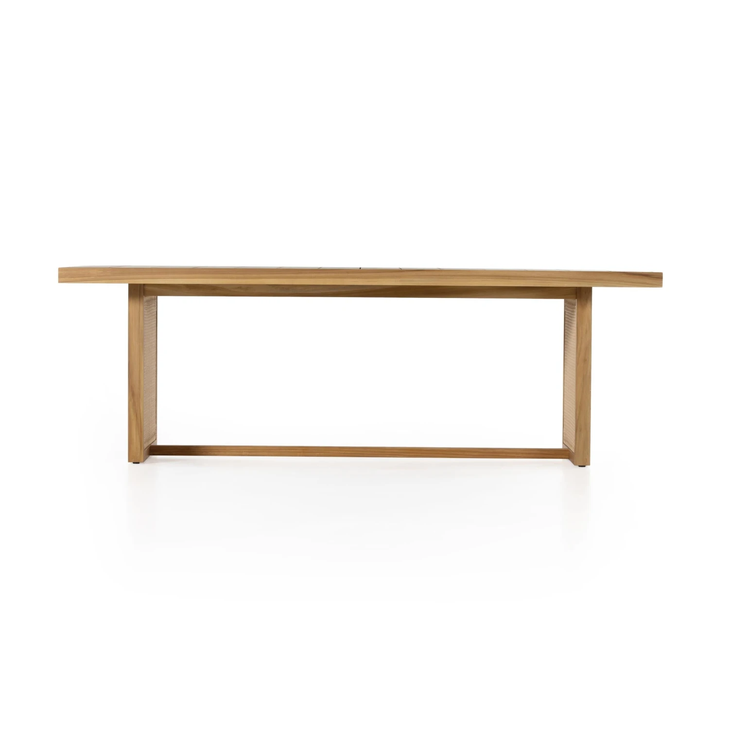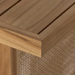 The cane trend moves outdoors. FSC®-certified teak frame is detailed with a rattan-inspired woven panel on the sides for a breezy, crafted minimalism take on the outdoor dining table. Cover or store indoors during inclement weather and when not in use.