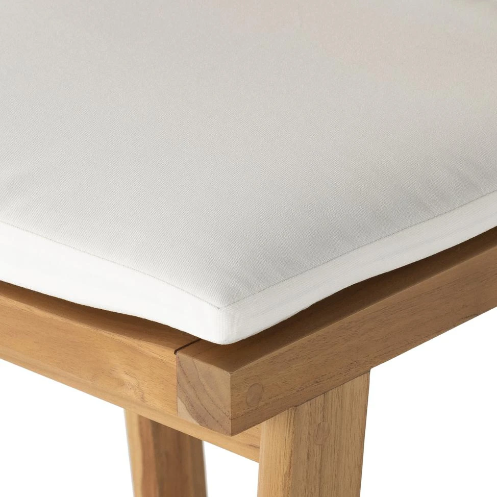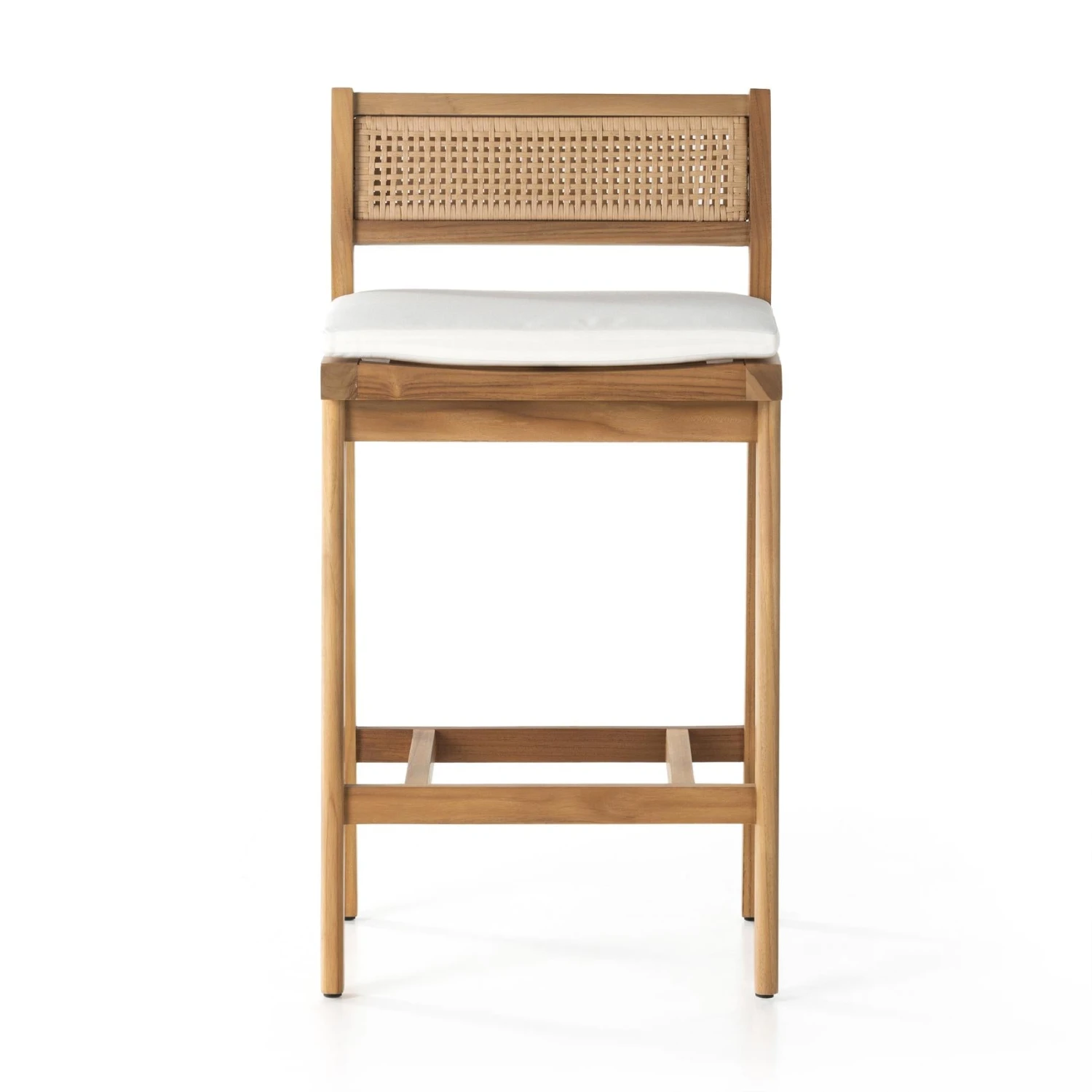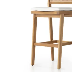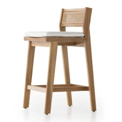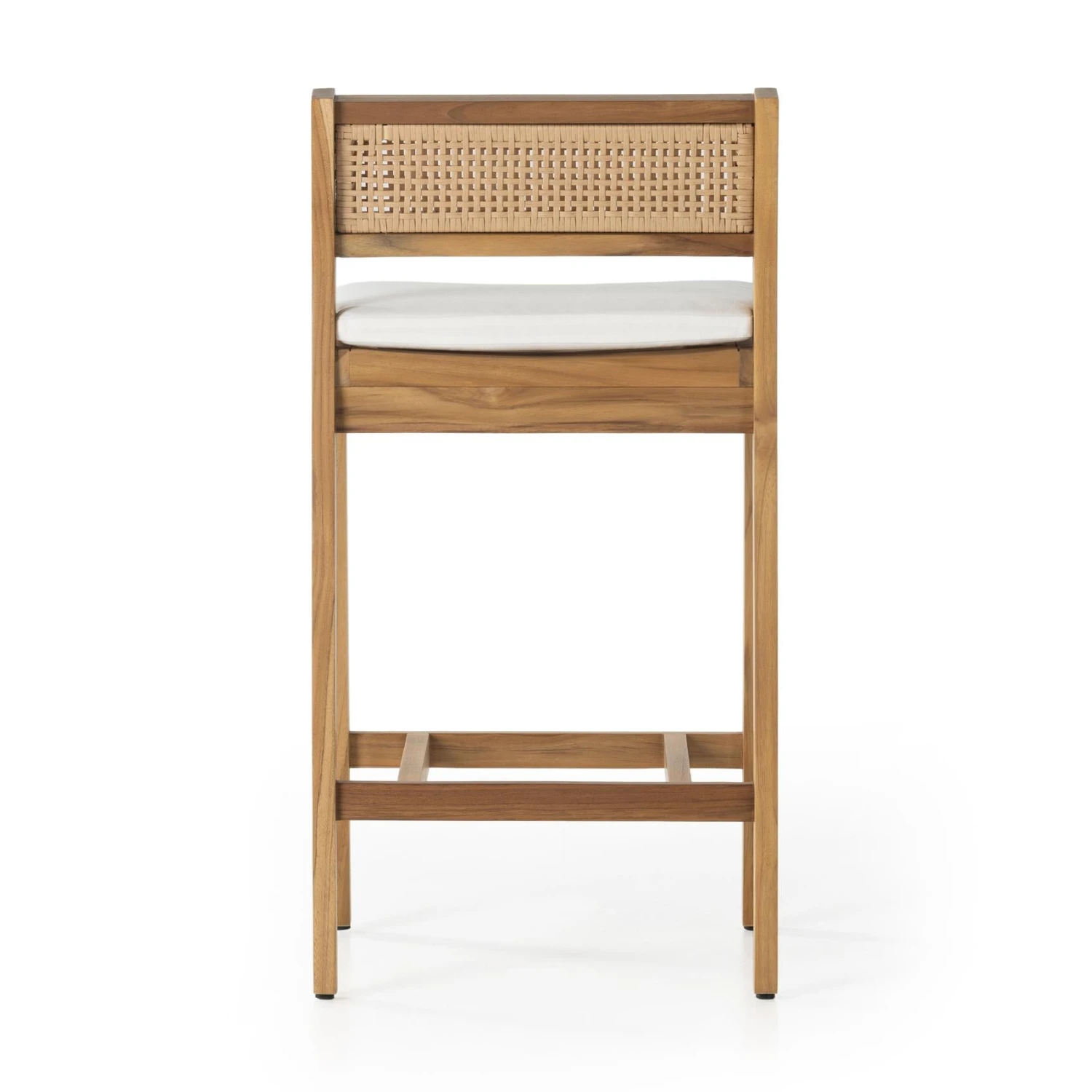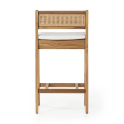 The cane trend moves outdoors. FSC®-certified teak frame is detailed with a rattan-inspired woven panel on the seat back for a breezy, crafted minimalism take on the outdoor stool. Cushion is covered in 100% Olefin, known for its UV-resistant, water-repellent, quick-drying abilities. Cover or store indoors during inclement weather and when not in use.