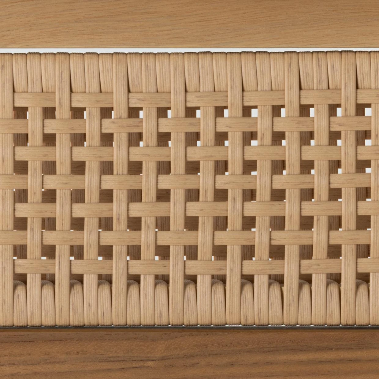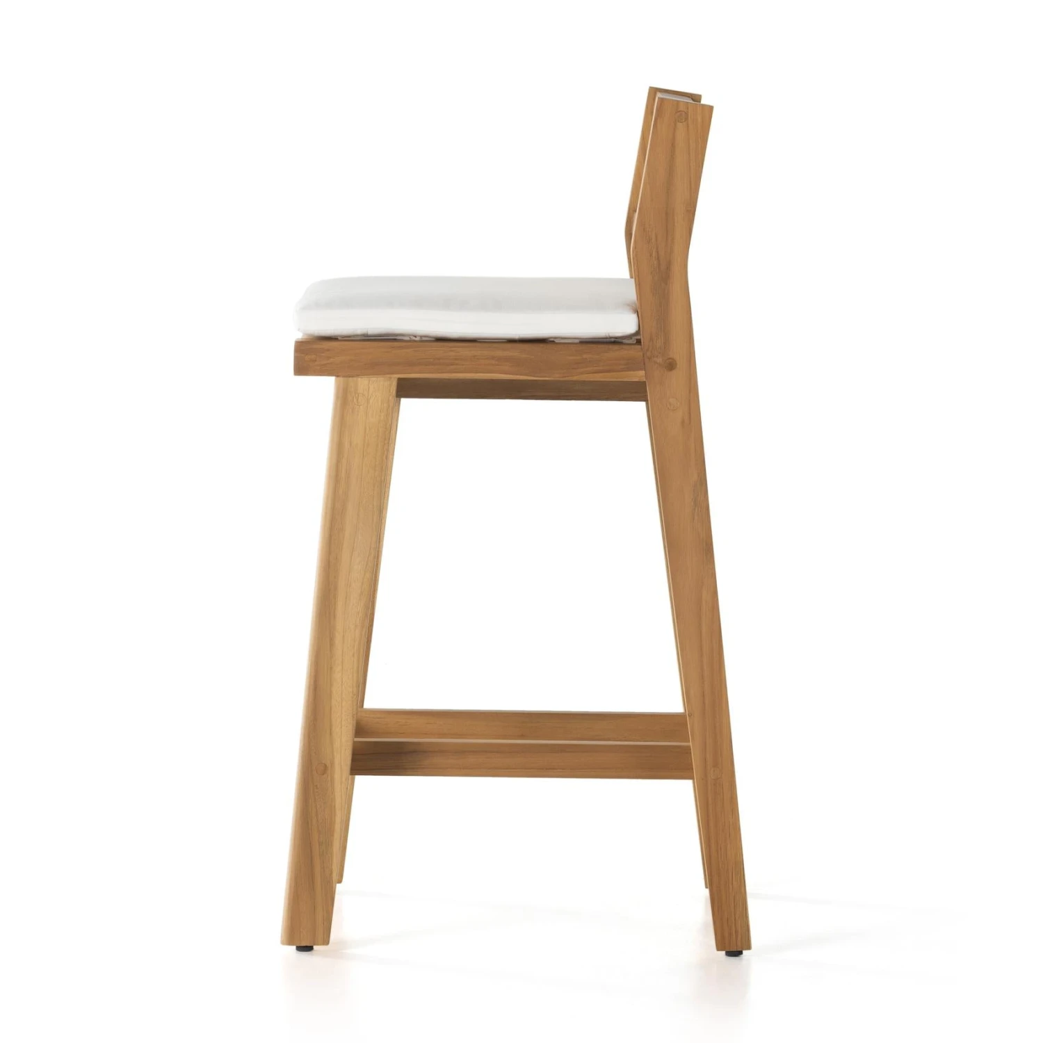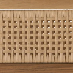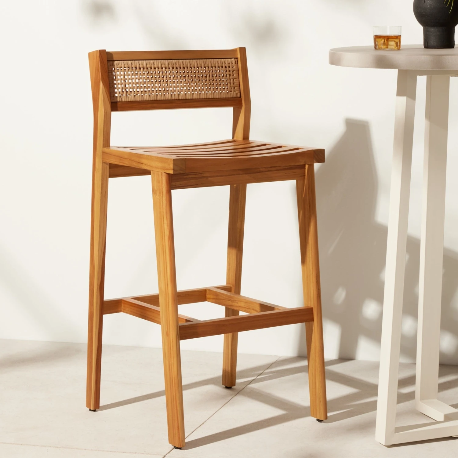 The cane trend moves outdoors. FSC®-certified teak frame is detailed with a rattan-inspired woven panel on the seat back for a breezy, crafted minimalism take on the outdoor stool. Cushion is covered in 100% Olefin, known for its UV-resistant, water-repellent, quick-drying abilities. Cover or store indoors during inclement weather and when not in use.