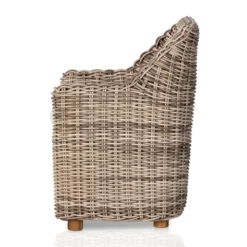 Traditional heritage shape on a grand scale. The outdoor dining chair is crafted from durable natural teak in a gorgeous, woven pattern highlighting the texture’s natural highs and lows. Oversized with deep-seated comfort for the ultimate outdoor dining space. Cover or store indoors during inclement weather and when not in use.