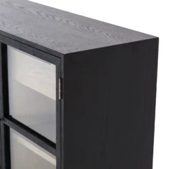 Black drifted oak frames lighter interior shelving for subtle but striking contrast. Glass doors allow for prized possessions to dazzle on display while spacious interior drawers add out-of-view storage options.