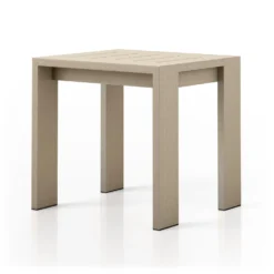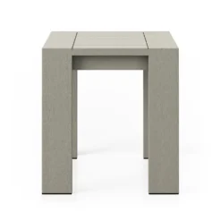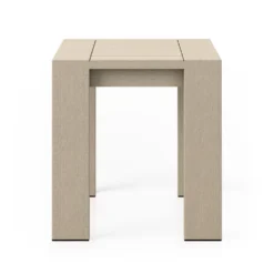 Architectural lines bring modern minimalism to this outdoor suite. Solid FSC®-certified teak forms the wide, clean frame of this stylish outdoor end table. Wirebrushed and fully sealed in a finish designed to mimic the natural aging process of teak. Cover or store indoors during inclement weather and when not in use.