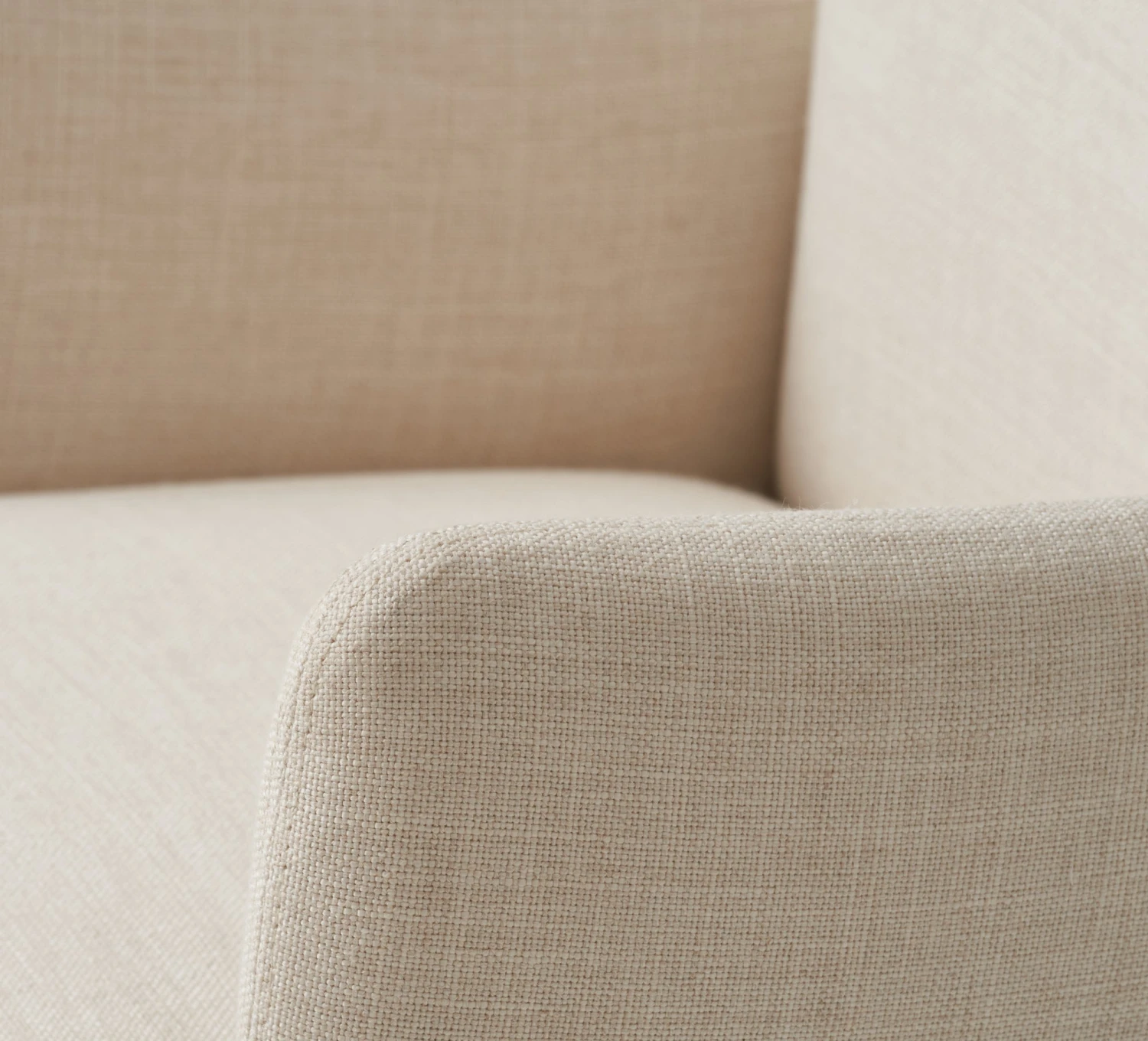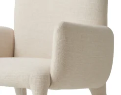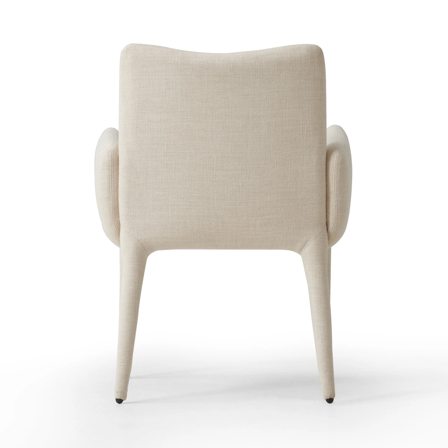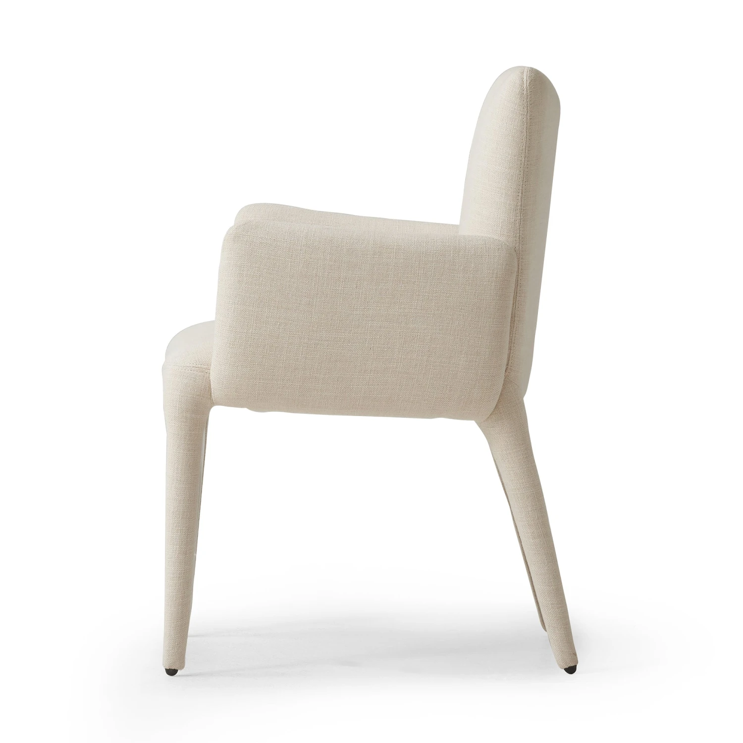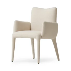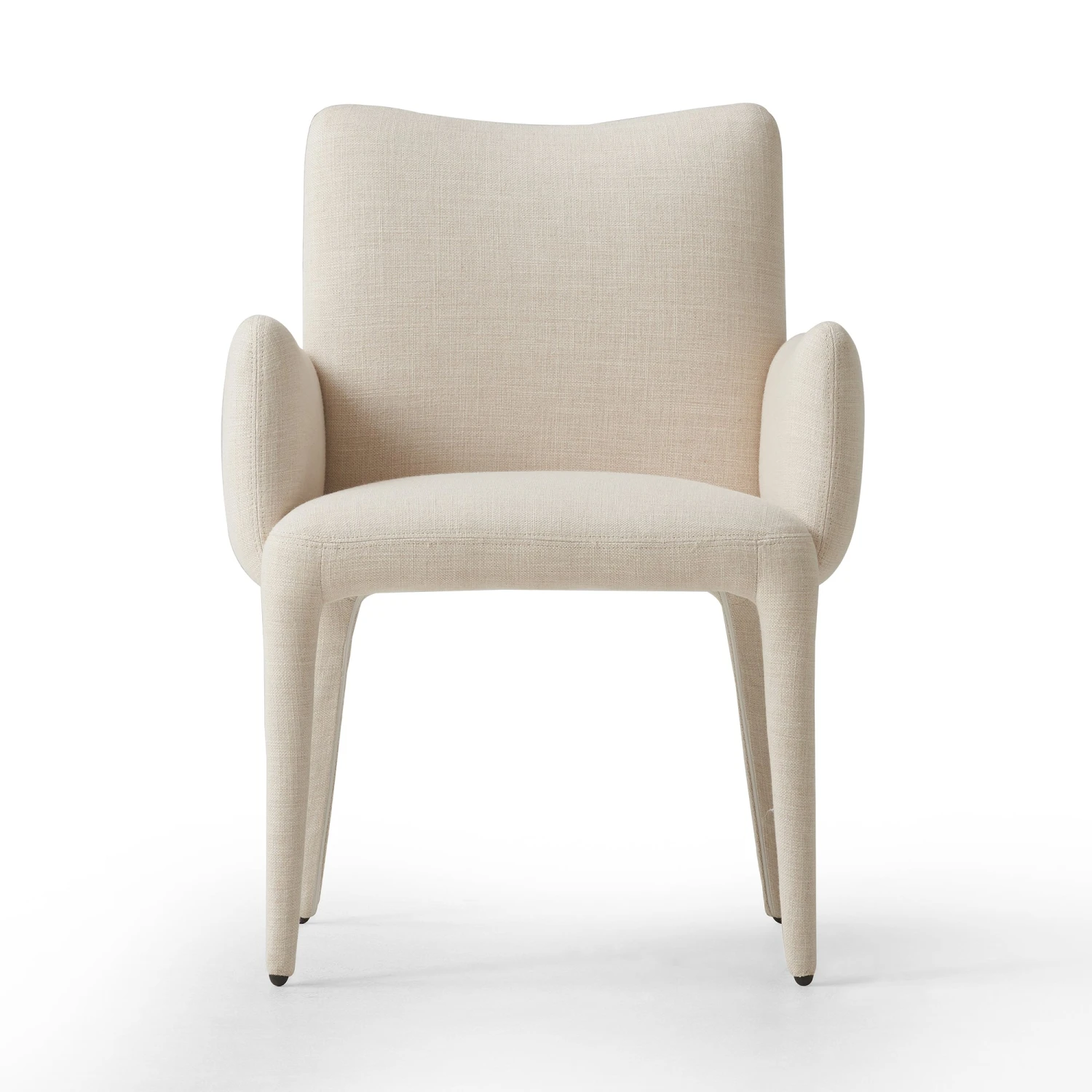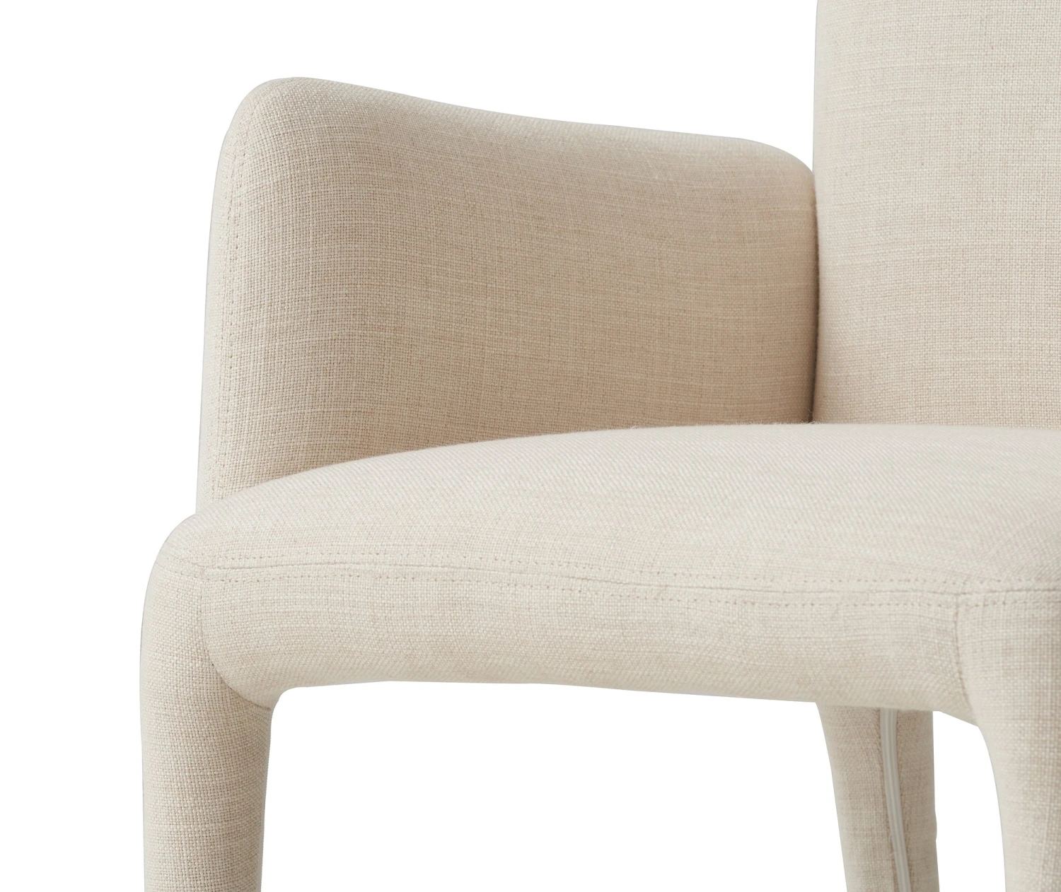 Everyday dining gets upgraded via modern shaping and light linen-blend upholstery.