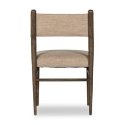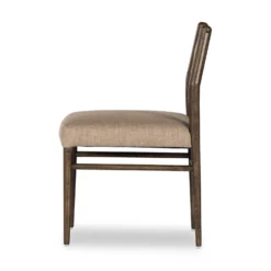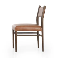 Mixed materials place a modern twist on the sling-back dining chair. A solid oak frame forms rounded dowel legs for a touch of traditionalism, with top-grain leather in a warm chestnut or performance fabric perfect for everyday dining.