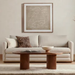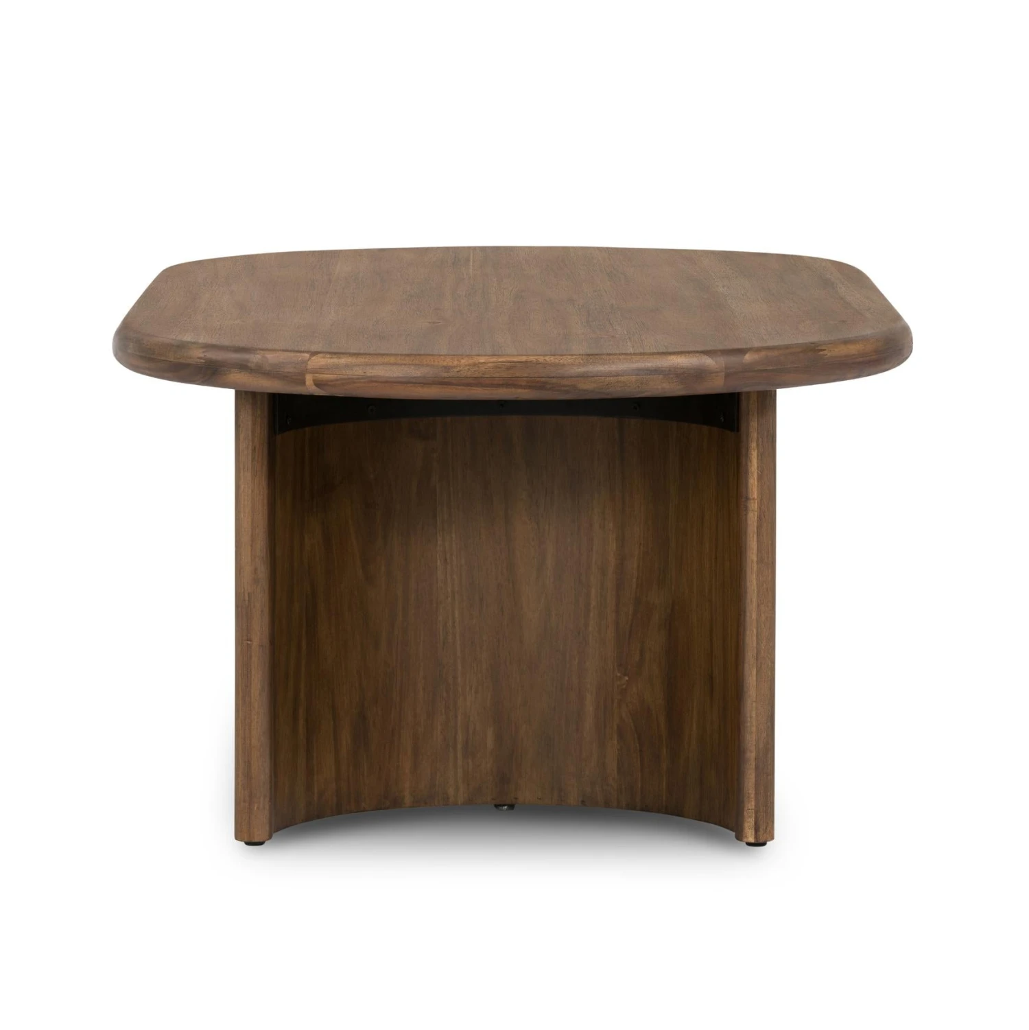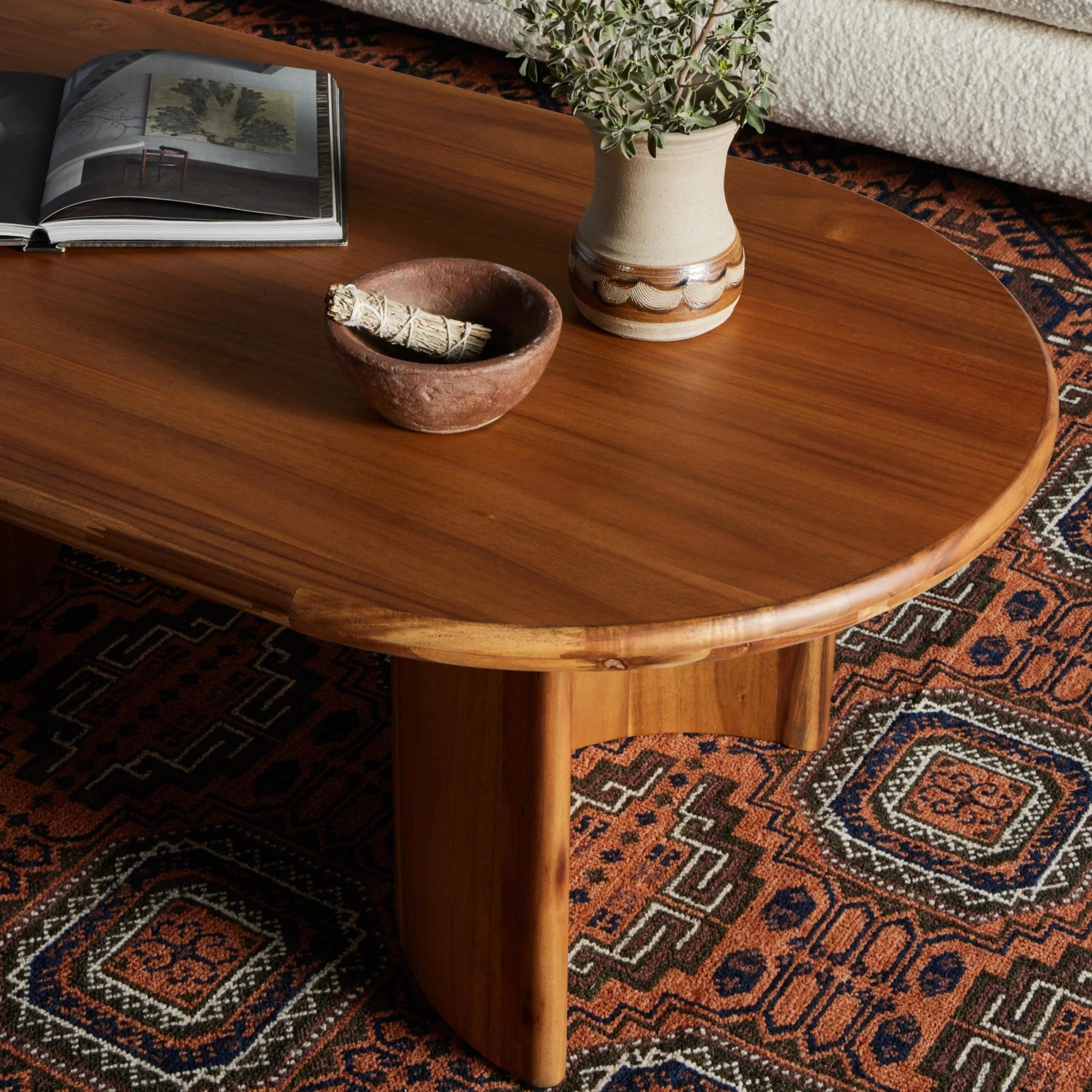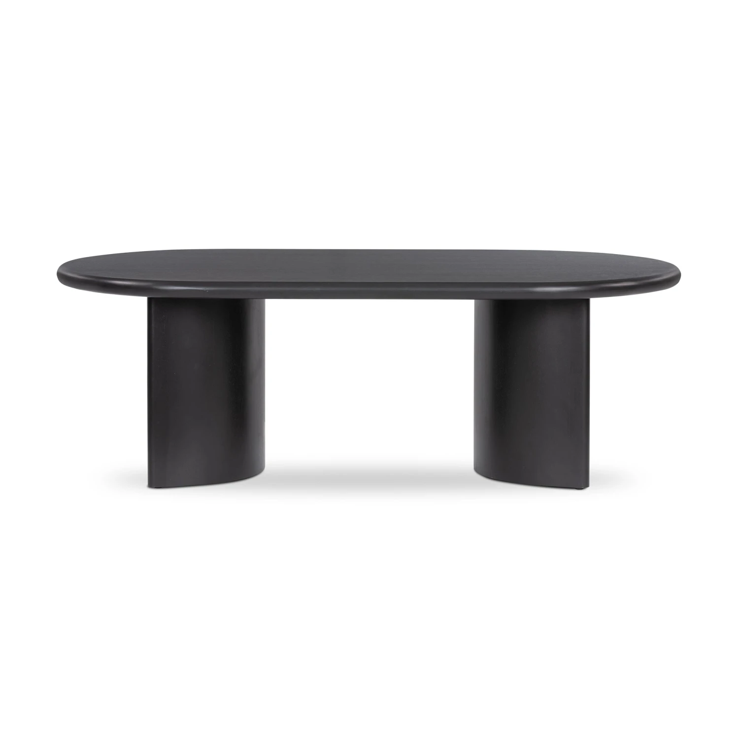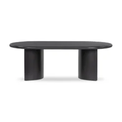 A study in shape. Black acacia forms crescent-shaped legs and sprawling oval tabletop, bringing organic presence to the living room.