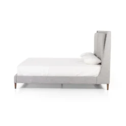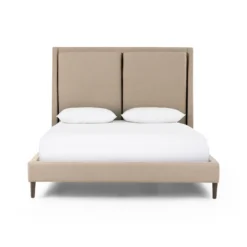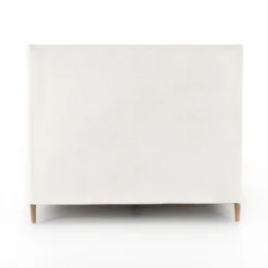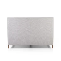 Upholstered in a velvety olive with subtle highs and lows that change in appearance depending on the direction of the fabric’s nap. Fixed headboard cushioning for adds texture and comfort, while tapered oak legs lend a low-profile look.