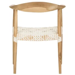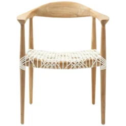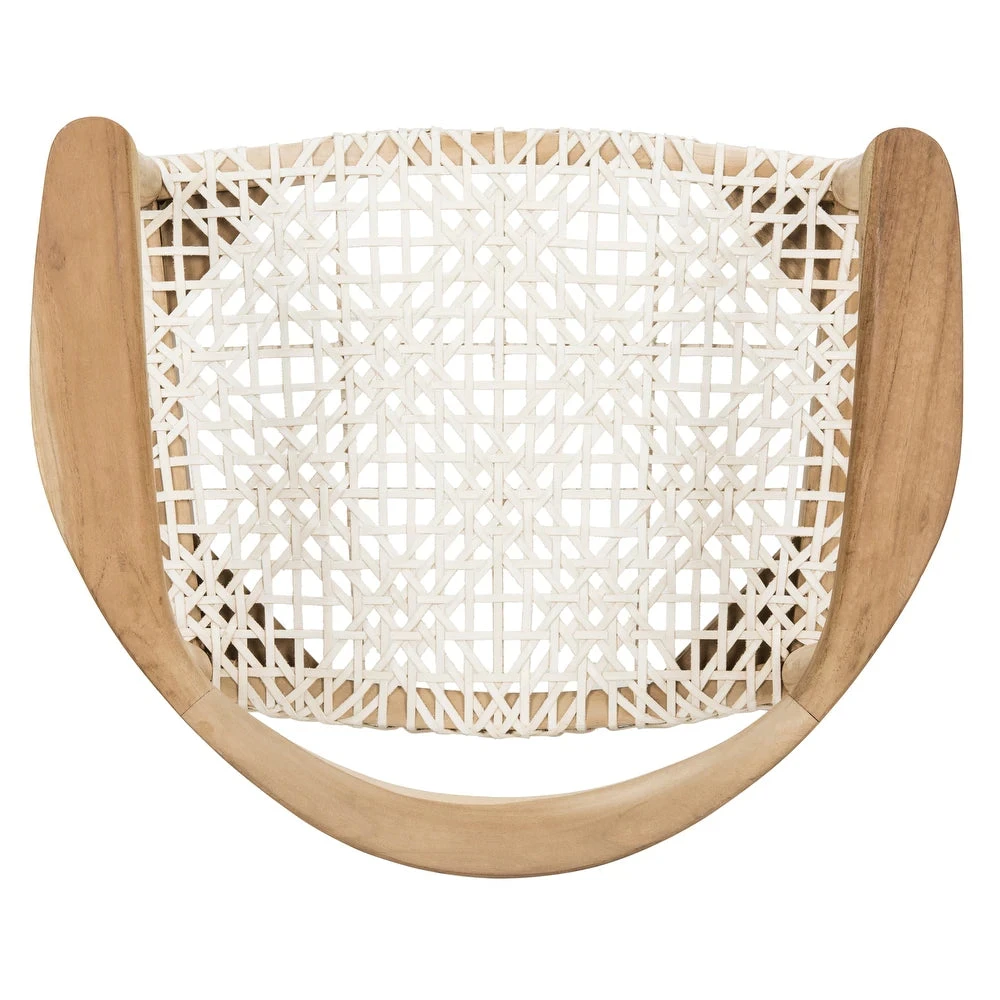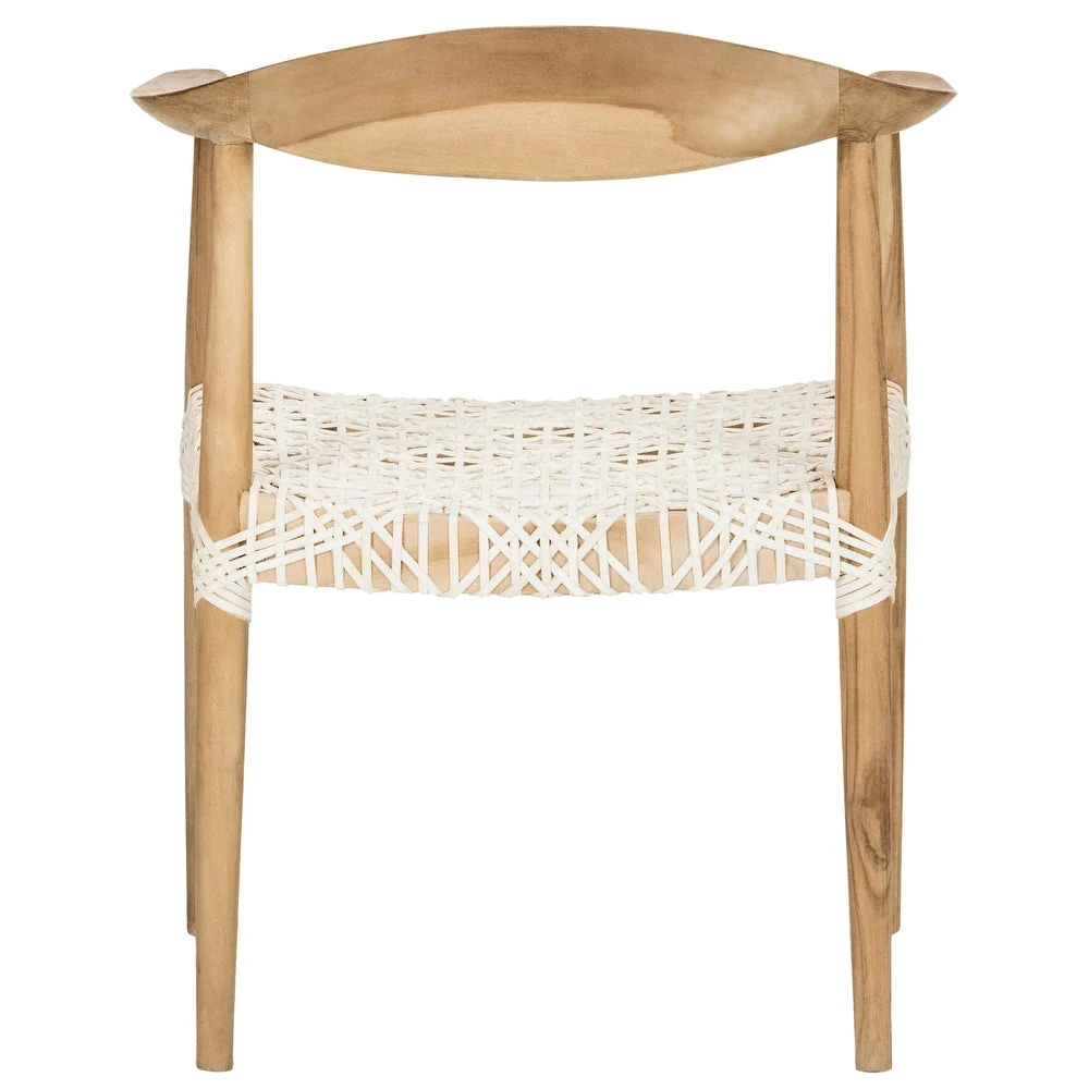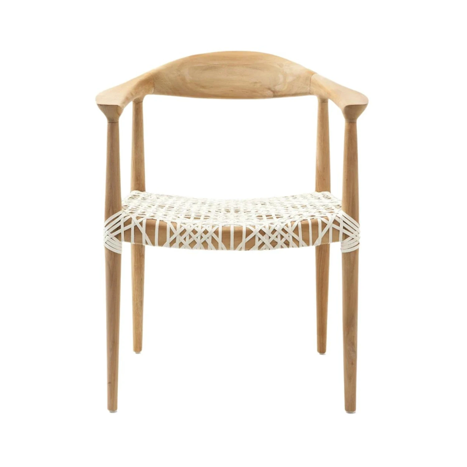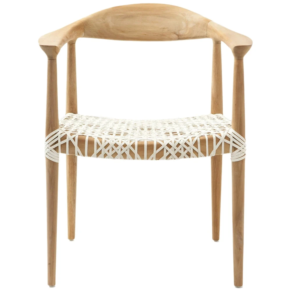 Reminiscent of Mid-Century Modern chairs with blonde wood and spindle legs, this chic Olivia Arm Chair is updated with intricate woven white leather seat in a contemporary laced web effect. Made from reclaimed teak in a light oak finish, Olivia adds charisma to any interior.