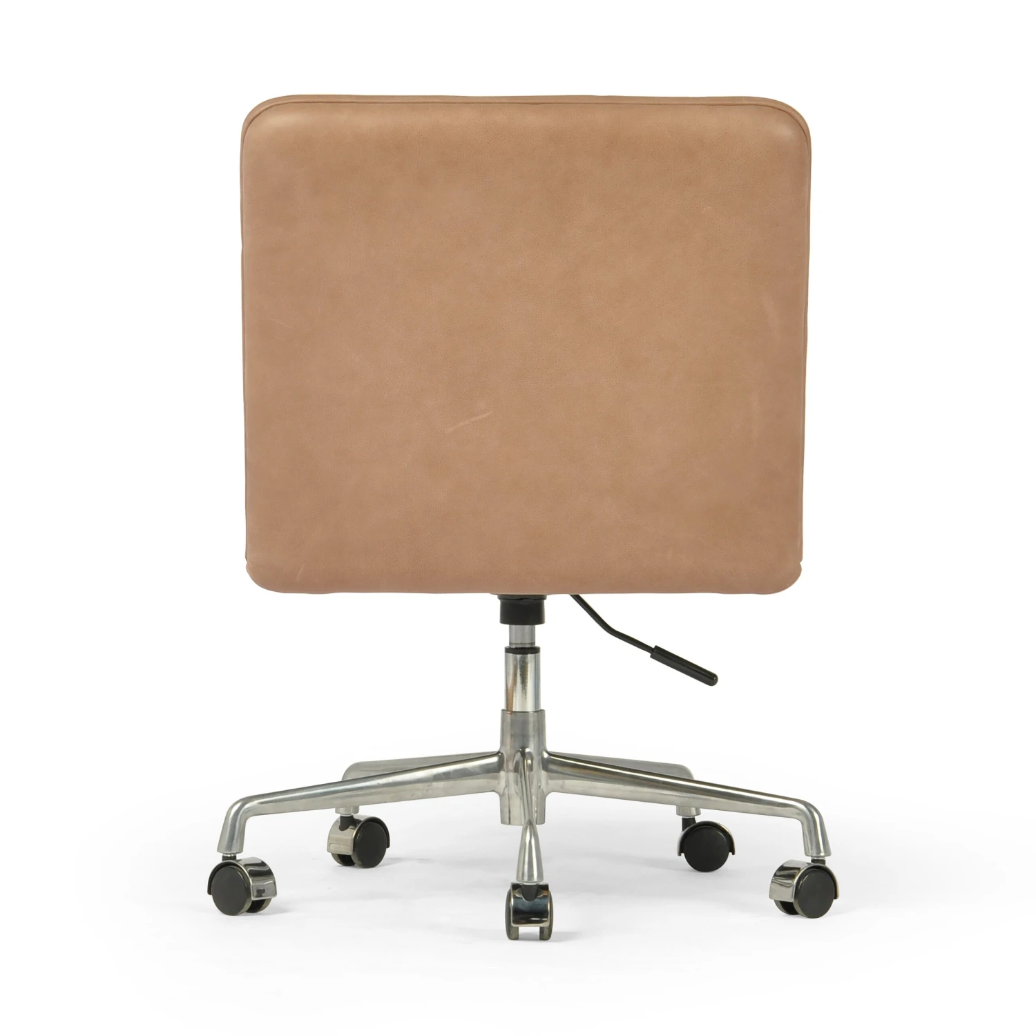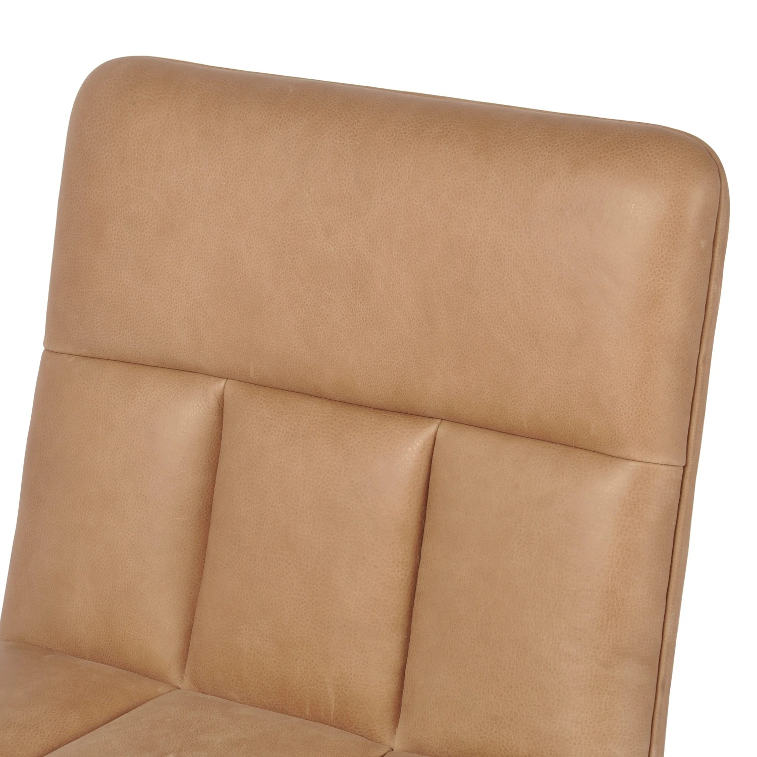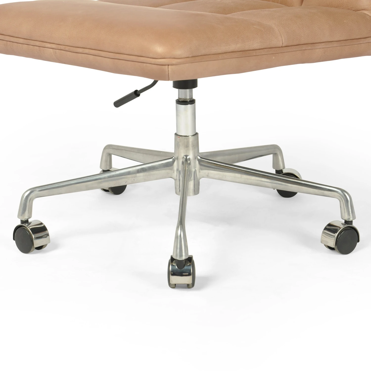 Simplicity is key. Tan top-grain leather seating features an armless profile plus subtle channeling, while a polished aluminum base features casters and height adjustability for ease in the modern office.