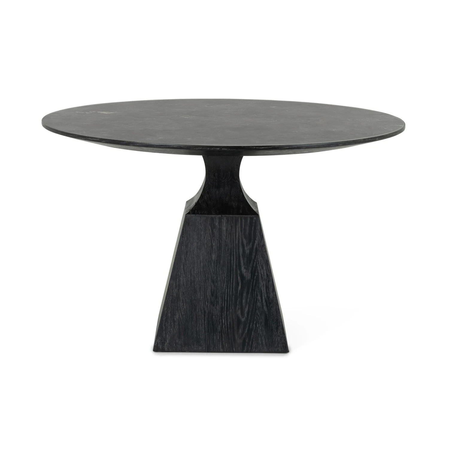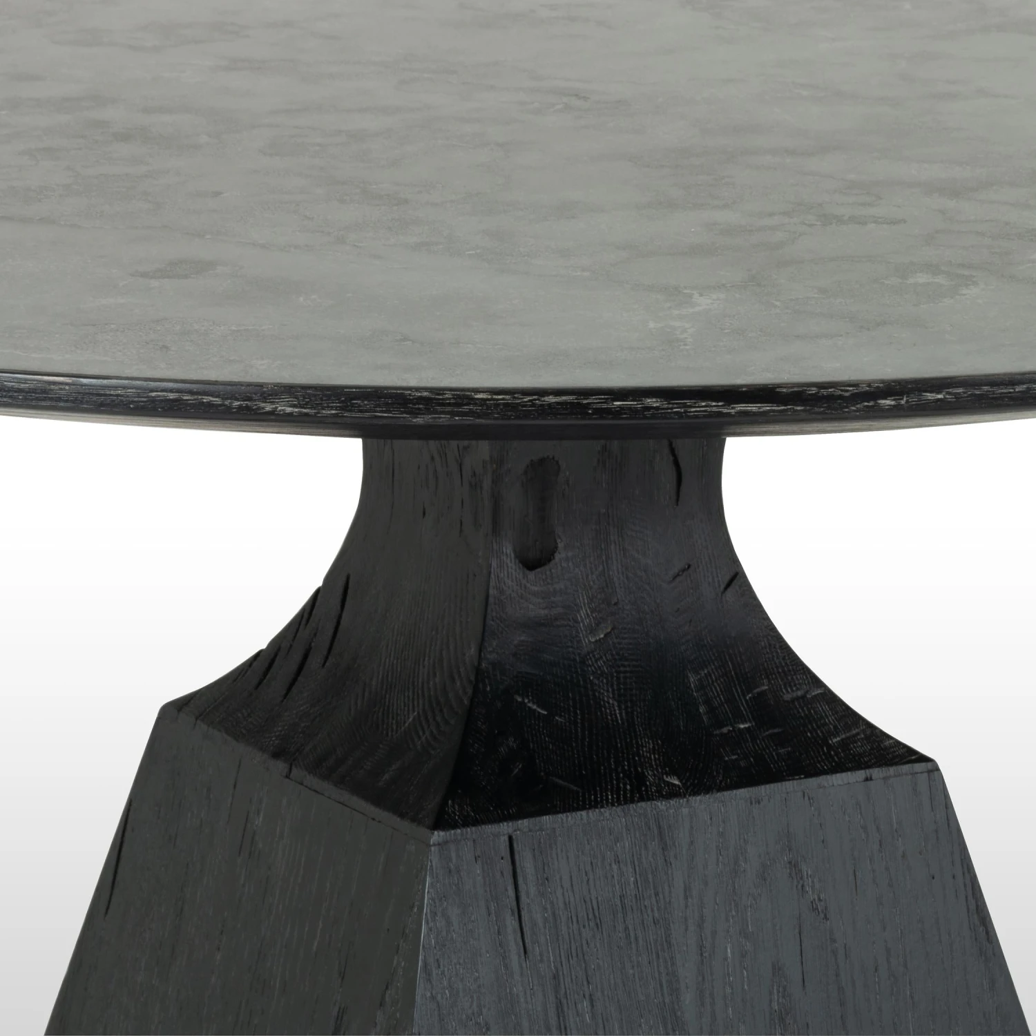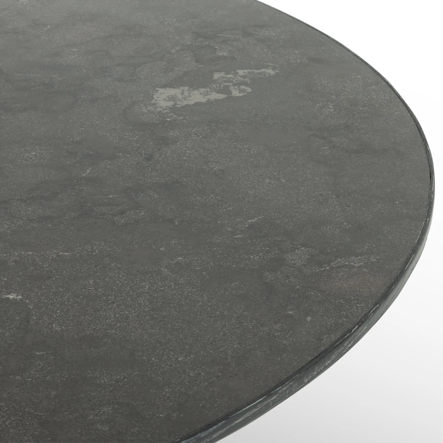 A bell-shaped pedestal base of black oak is wire-brushed for extra texture, while a rounded top of bluestone brings a touch of industrialism to the table. White mineral lines and subtle color, texture and pattern variations are to be expected and speak to each stone’s individual nature.
