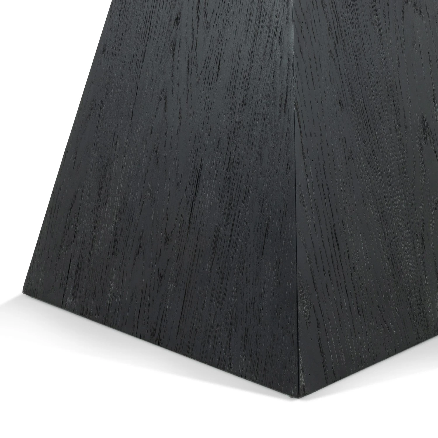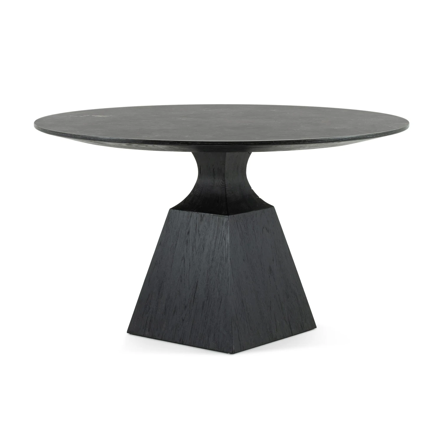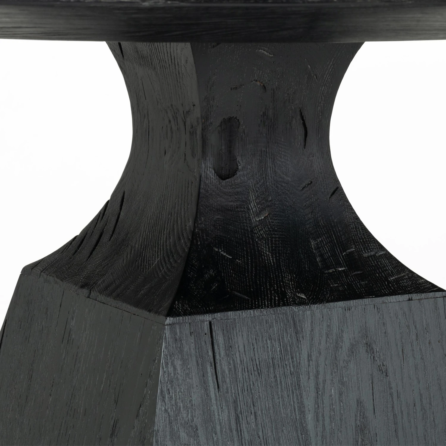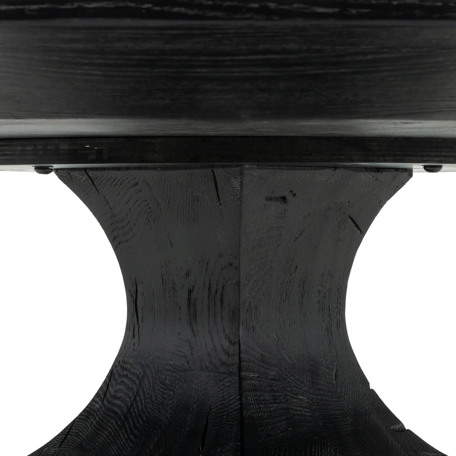 A bell-shaped pedestal base of black oak is wire-brushed for extra texture, while a rounded top of bluestone brings a touch of industrialism to the table. White mineral lines and subtle color, texture and pattern variations are to be expected and speak to each stone’s individual nature.