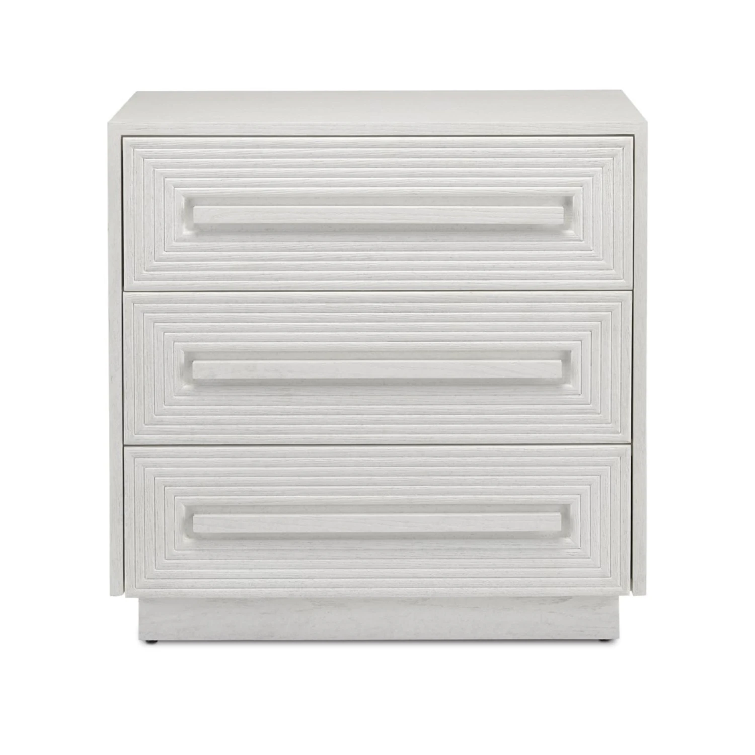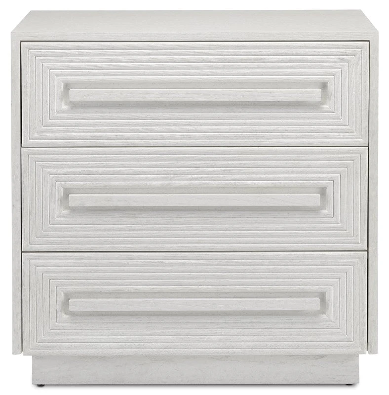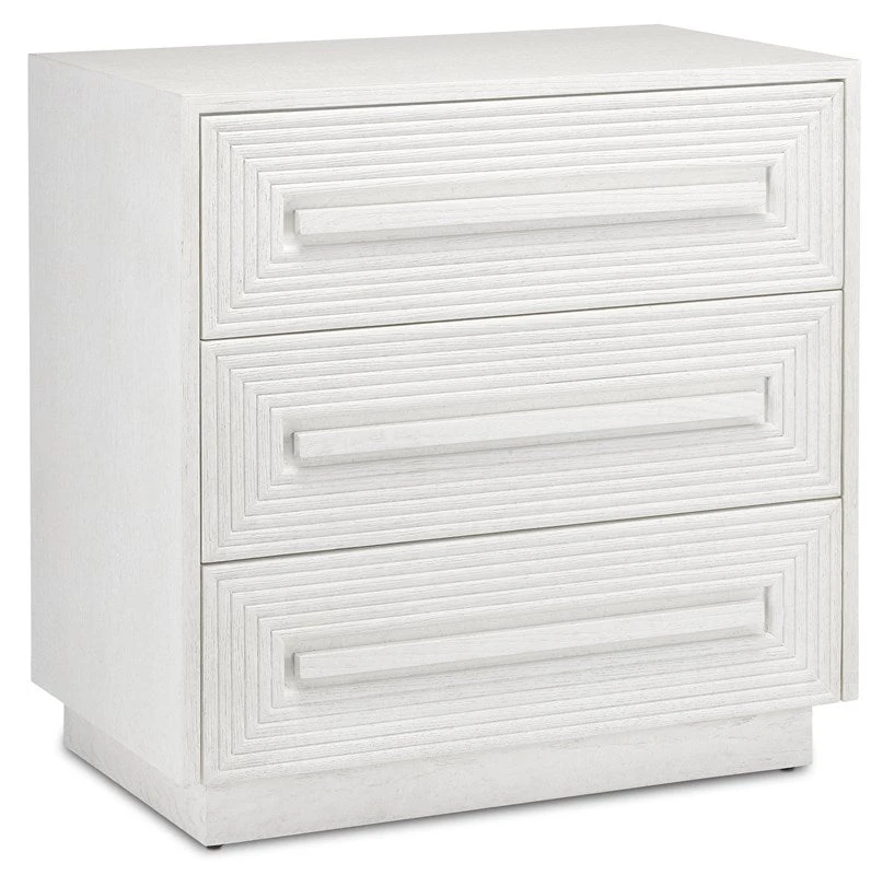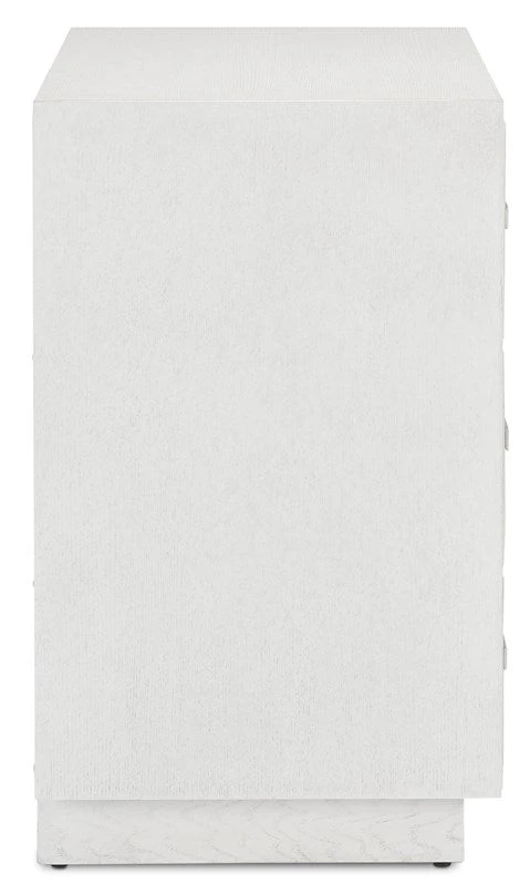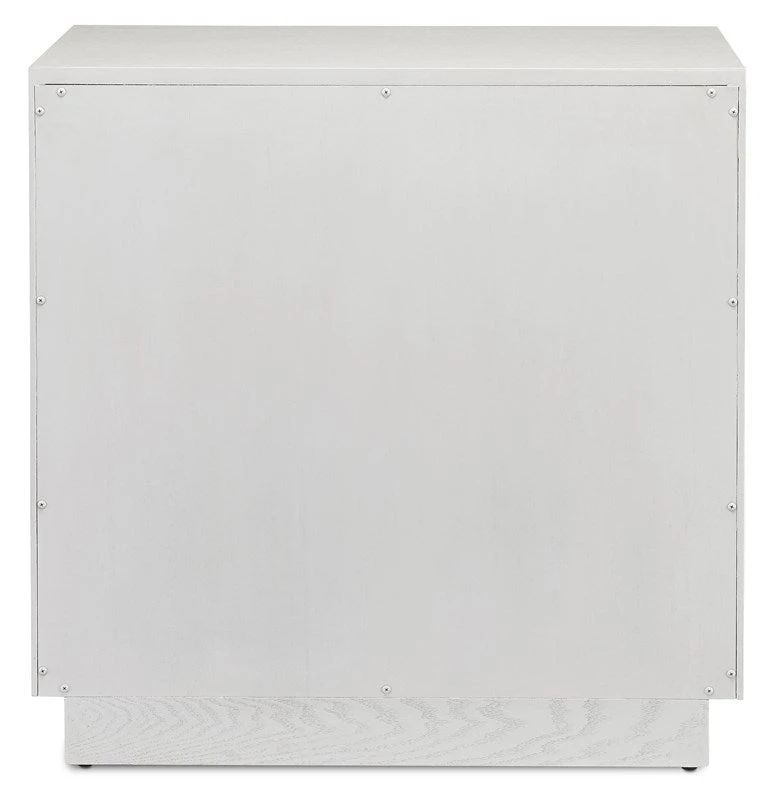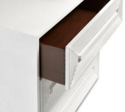 The cerused white finish on the Savannah White Chest, made of white oak, highlights the patterns of natural wood that form embedded squares in a geometric illusion of depth. The centuries-old finishing technique is designed to draw out the detail and character of the wood grain on this on this white chest.