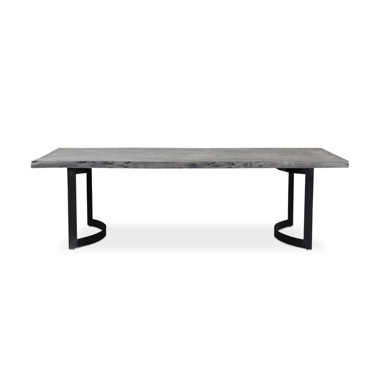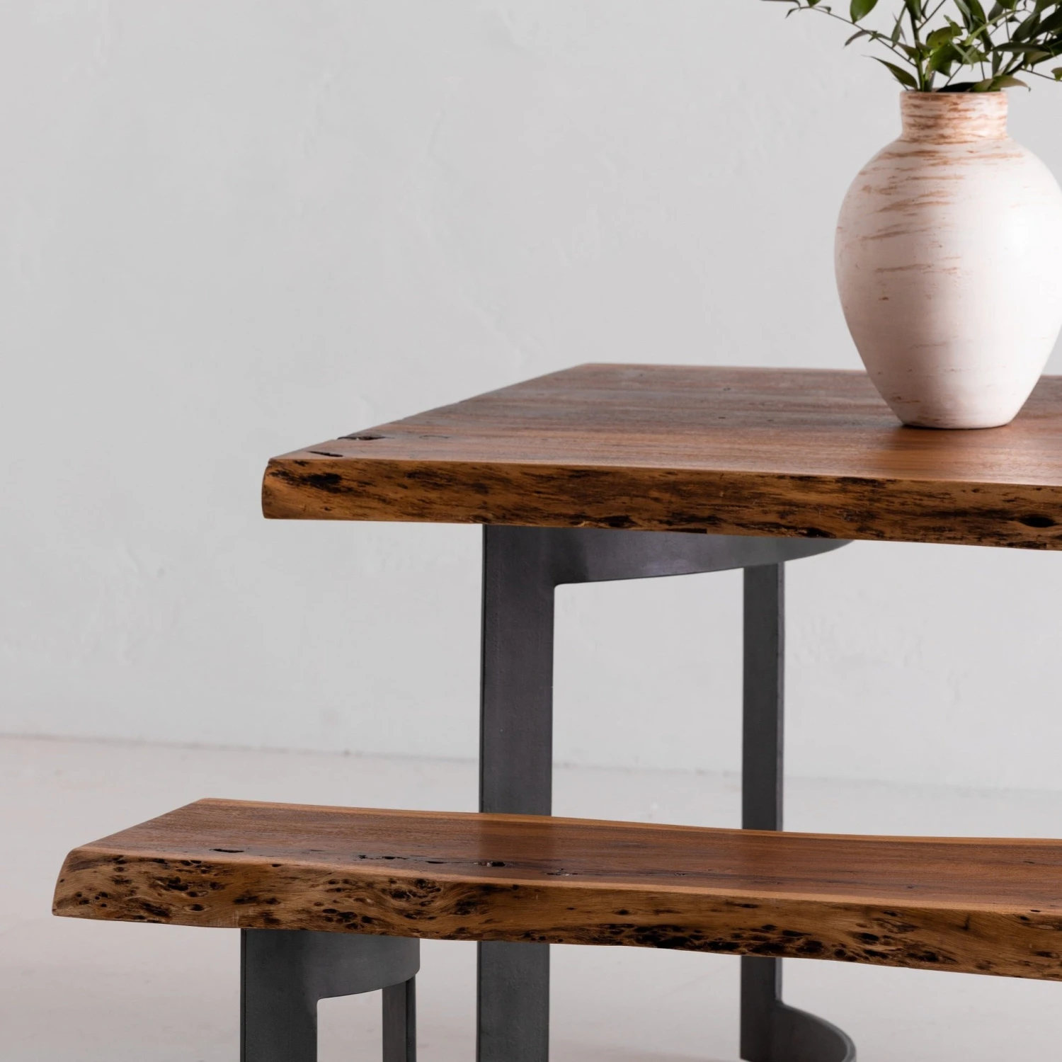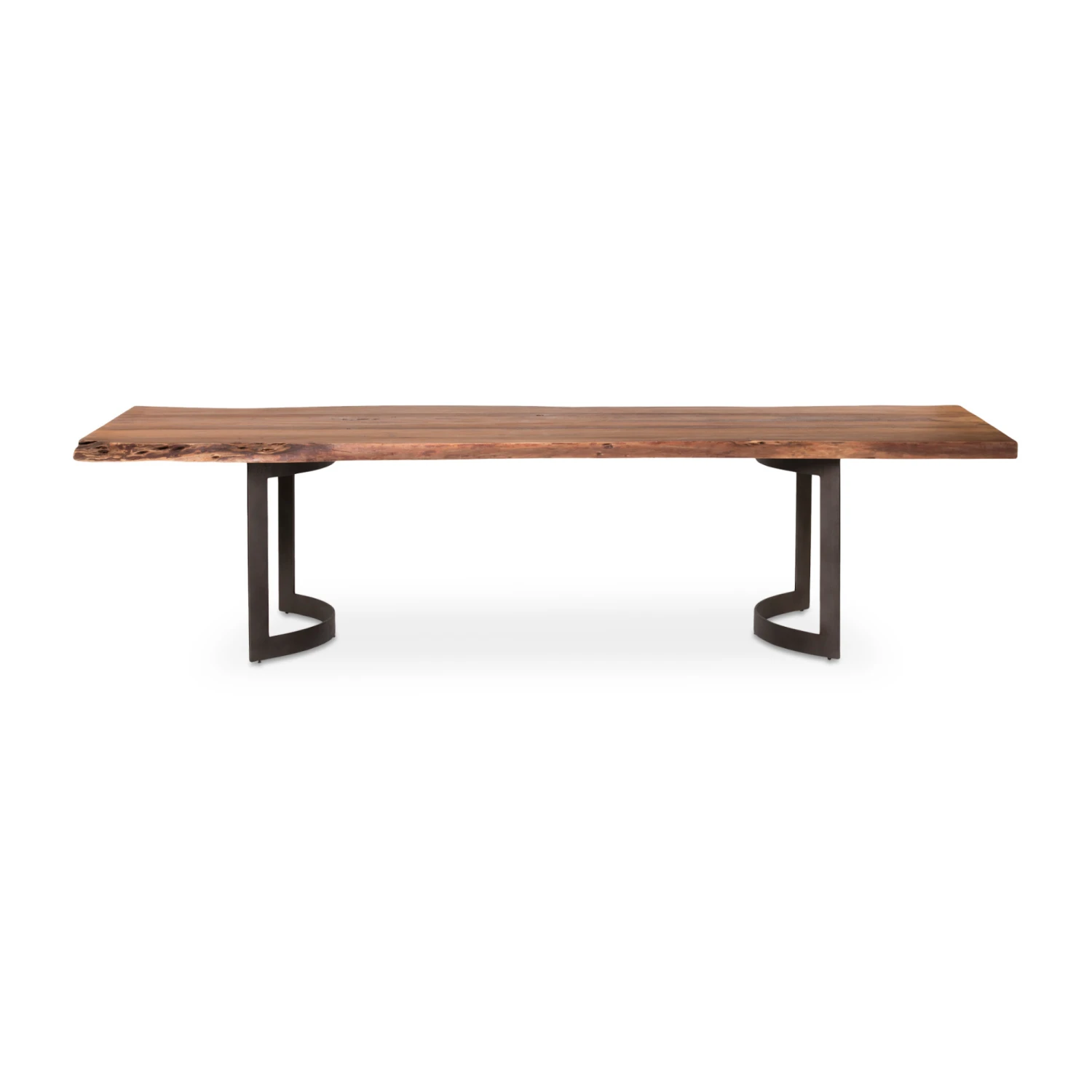 The Senna collection puts nature’s craft front and center. Made of beautiful solid acacia wood, rustic live edge detailing shows off the unique knots and whorls of the wood. This dining table’s expansive surface beautifully showcases the wood’s personality, and is offset by a sturdy industrial metal base.