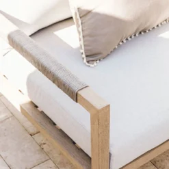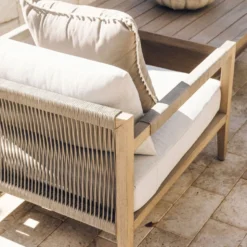 Modern materials ready a stylish silhouette for the outdoors. Washed brown FSC®-certified teak forms a clean frame for UV-resistant and water-repellent fabric in a light ivory. Rope-wrapped armrests and rear cotton weaving add a textured finishing touch. Cover or store indoors during inclement weather.
