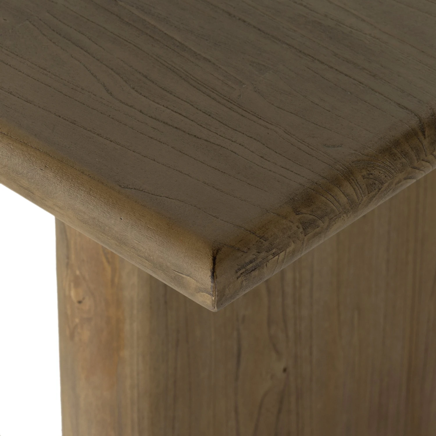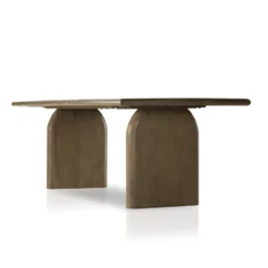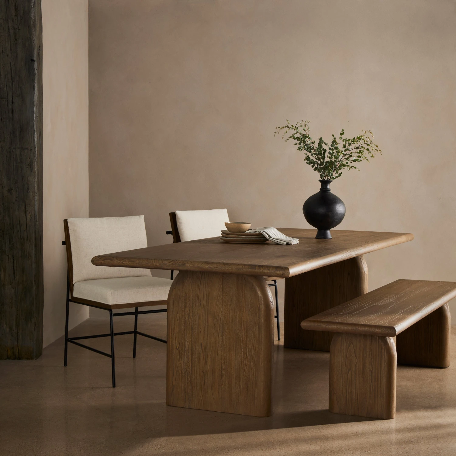 Clean edging and soft curves spur a remarkable contrast. Solid aged grained mindi forms an open, minimalist-minded dining table with grand proportions above arched bases. Seats 8-10 comfortably.
