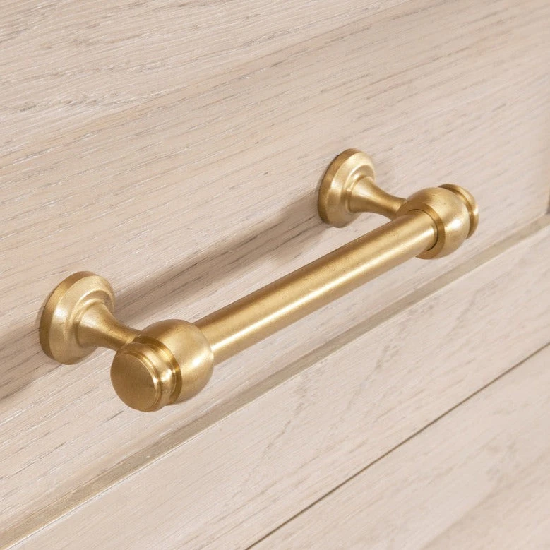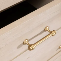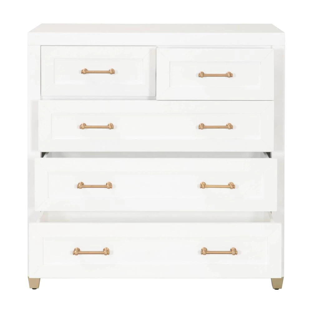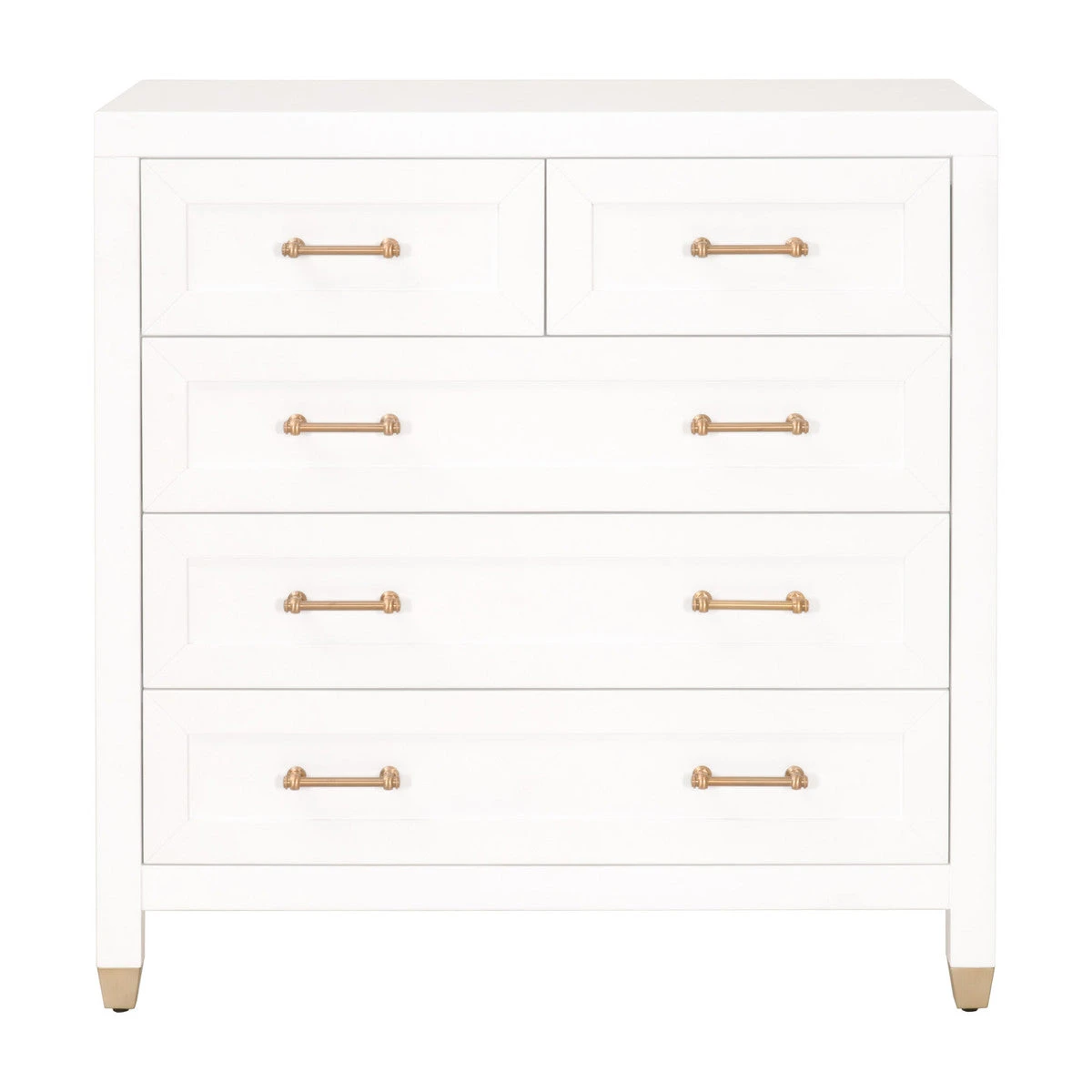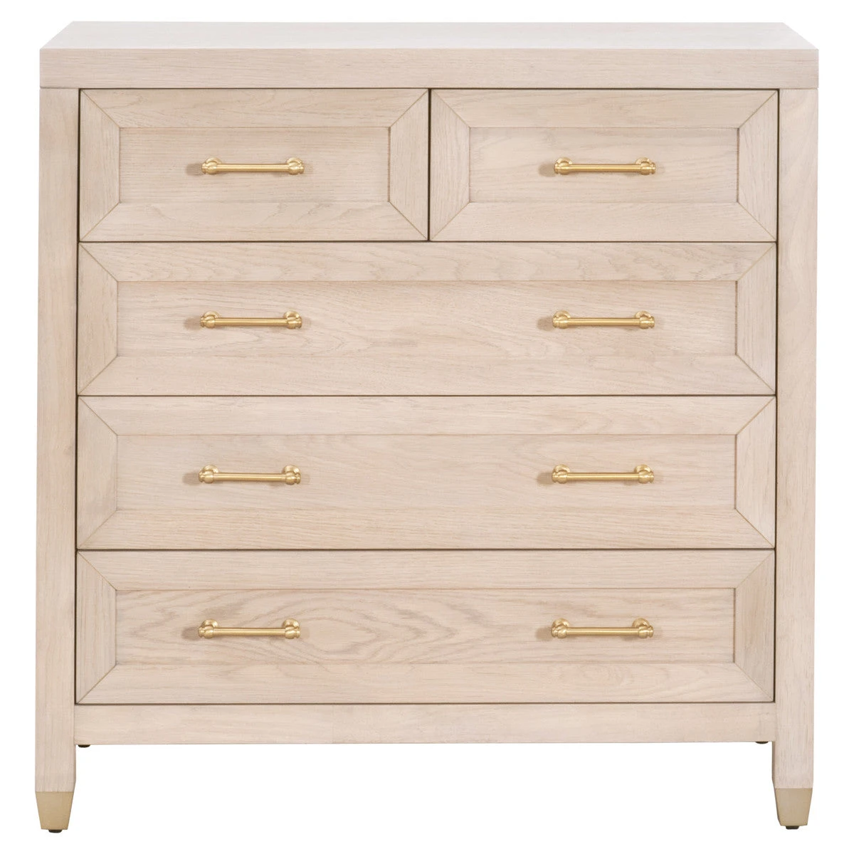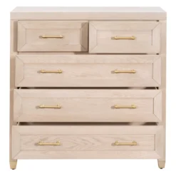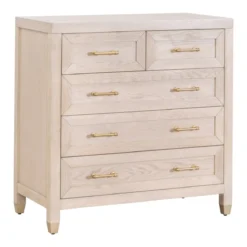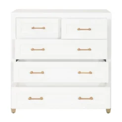 This chest houses five spacious drawers, each equipped with full extension metal glides for effortless accessibility. An innovative hold-in detent prevents drawer rollouts, further enhancing its user-friendly features. With its elegant brushed brass handles and feet, this chest makes a refined statement in any space.