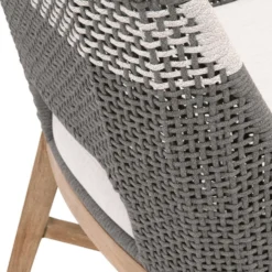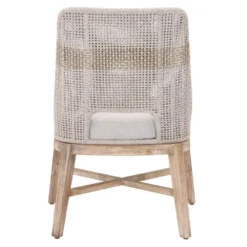 These woven side chairs will add a touch of coastal style to your kitchen or dining room. Constructed with a steel frame and solid mahogany legs, these dining chairs are not only sturdy, but durable. A rich dove colored rope is tightly woven with an eye-catching solid white speckle stripe interwoven at the center of the seat back. The mahogany legs feature a beautiful distressed natural gray finish. Paired with an upholstered seat cushion affixed to the base, the chairs provide comfort with style and will be the perfect addition to any transitional or traditional dining room.